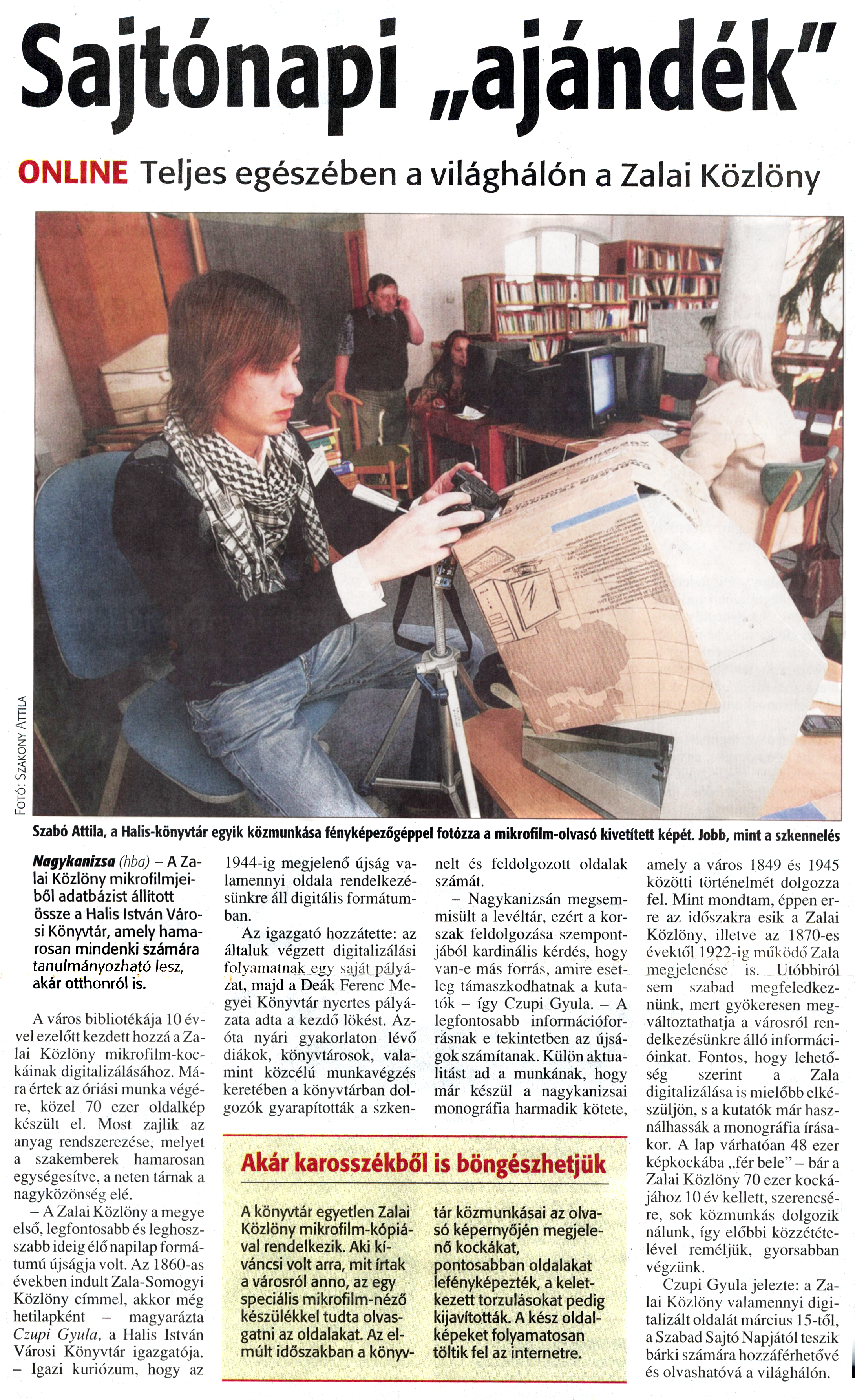 Nyilvános 1224 | 1853 | Zalai Hírlap 2010. február 23. 45. szám 11. oldal - Sajtónapi ajándék | A cikk szövege: Sajtónapi „ajándék" ONLINE Teljes egészében a világhálón a Zalai Közlöny Szabó Attila, a Halis-könyvtár egyik közmunkása fényképezőgéppel fotózza a mikrofilm-olvasó kivetített képét. Jobb, mint a szkennelés Nagykanizsa (hba) - A Zalai Közlöny mikrofilmjeiből adatbázist állított össze a Halis István Városi Könyvtár, amely hamarosan mindenki számára tanulmányozható lesz, akár otthonról is. A város bibliotékája 10 évvel ezelőtt kezdett hozzá a Zalai Közlöny mikrofilm-kockáinak digitalizálásához. Mára értek az óriási munka végére, közel 70 ezer oldalkép készült el. Most zajlik az anyag rendszerezése, melyet a szakemberek hamarosan egységesítve, a neten tárnak a nagyközönség elé. - A Zalai Közlöny a megye első, legfontosabb és leghosszabb ideig élő napilap formátumú újságja volt. Az 1860-as években indult Zala-Somogyi Közlöny címmel, akkor még hetilapként - magyarázta Czupi Gyula, a Halis István Városi Könyvtár igazgatója. - Igazi kuriózum, hogy az 1944-ig megjelenő újság valamennyi oldala rendelkezésünkre áll digitális formátumban. Az igazgató hozzátette: az általuk végzett digitalizálási folyamatnak egy saját pályázat, majd a Deák Ferenc Megyei Könyvtár nyertes pályázata adta a kezdő lökést. Azóta nyári gyakorlaton lévő diákok, könyvtárosok, valamint közcélú munkavégzés keretében a könyvtárban dolgozók gyarapították a szkennelt és feldolgozott oldalak számát. - Nagykanizsán megsemmisült a levéltár, ezért a korszak feldolgozása szempontjából kardinális kérdés, hogy van-e más forrás, amire esetleg támaszkodhatnak a kutatók - így Czupi Gyula. - A legfontosabb információforrásnak e tekintetben az újságok számítanak. Külön aktualitást ad a munkának, hogy már készül a nagykanizsai monográfia harmadik kötete, amely a város 1849 és 1945 közötti történelmét dolgozza fel. Mint mondtam, éppen erre az időszakra esik a Zalai Közlöny, illetve az 1870-es évektől 1922-ig működő Zala megjelenése is. Utóbbiról sem szabad megfeledkeznünk, mert gyökeresen megváltoztathatja a városról rendelkezésünkre álló információinkat. Fontos, hogy lehetőség szerint a Zala digitalizálása is mielőbb elkészüljön, s a kutatók már használhassák a monográfia írásakor. A lap várhatóan 48 ezer képkockába „fér bele" - bár a Zalai Közlöny 70 ezer kockájához 10 év kellett, szerencsére, sok közmunkás dolgozik nálunk, így előbbi közzétételével reméljük, gyorsabban végzünk. Czupi Gyula jelezte: a Zalai Közlöny valamennyi digitalizált oldalát március 15-től, a Szabad Sajtó Napjától teszik bárki számára hozzáférhetővé és olvashatóvá a világhálón. Akár karosszékből is böngészhetjük A könyvtár egyetlen Zalai Közlöny mikrofilm-kópiával rendelkezik. Aki kíváncsi volt arra, mit írtak a városról anno, az egy speciális mikrofilm-néző készülékkel tudta olvasgatni az oldalakat. Az elmúlt időszakban a könyvtár közmunkásai az olvasó képernyőjén megjelenő kockákat, pontosabban oldalakat lefényképezték, a keletkezett torzulásokat pedig kijavították. A kész oldalképeket folyamatosan töltik fel az internetre. |
