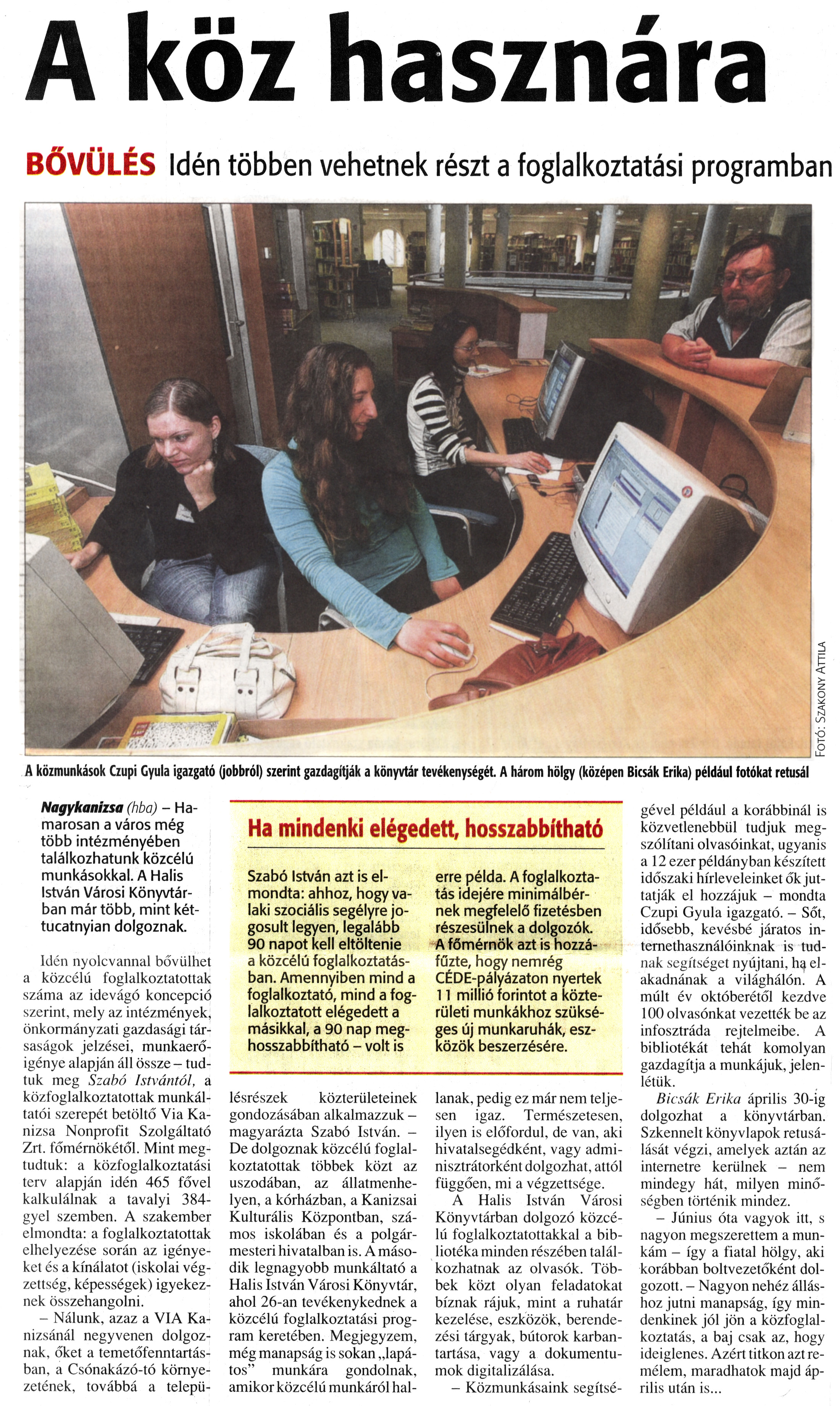 Nyilvános 1129 | 1664 | Zalai Hírlap 2010. március 23. 68. szám 5. oldal - A köz hasznára | A cikk szövege: A köz hasznára BŐVÜLÉS Idén többen vehetnek részt a foglalkoztatási programban A közmunkások Czupi Gyula igazgató (jobbról) szerint gazdagítják a könyvtár tevékenységét. A három hölgy (középen Bicsak Erika) például fotókat retusál Ha mindenki elégedett, hosszabbítható Szabó István azt is elmondta: ahhoz, hogy valaki szociális segélyre jogosult legyen, legalább 90 napot kell eltöltenie a közcélú foglalkoztatásban. Amennyiben mind a foglalkoztató, mind a foglalkoztatott elégedett a másikkal, a 90 nap meghosszabbítható - volt is erre példa. A foglalkoztatás idejére minimálbérnek megfelelő fizetésben részesülnek a dolgozók. A főmérnök azt is hozzáfűzte, hogy nemrég CÉDE-pályázaton nyertek 11 millió forintot a közterületi munkákhoz szükséges új munkaruhák, eszközök beszerzésére. Nagykanizsa (hba) - Hamarosan a város még több intézményében találkozhatunk közcélú munkásokkal. A Halis István Városi Könyvtárban már több, mint két-tucatnyian dolgoznak. Idén nyolcvannal bővülhet a közcélú foglalkoztatottak száma az idevágó koncepció szerint, mely az intézmények, önkormányzati gazdasági társaságok jelzései, munkaerőigénye alapján áll össze - tudtuk meg Szabó Istvántól, a közfoglalkoztatottak munkáltatói szerepét betöltő Via Kanizsa Nonprofit Szolgáltató Zrt. főmérnökétől. Mint megtudtuk: a közfoglalkoztatási terv alapján idén 465 fővel kalkulálnak a tavalyi 384-gyel szemben. A szakember elmondta: a foglalkoztatottak elhelyezése során az igényeket és a kínálatot (iskolai végzettség, képességek) igyekeznek összehangolni. - Nálunk, azaz a VIA Kanizsánál negyvenen dolgoznak, őket a temetőfenntartásban, a Csónakázó-tó környezetének, továbbá a településrészek közterületeinek gondozásában alkalmazzuk -magyarázta Szabó István. — De dolgoznak közcélú foglalkoztatottak többek közt az uszodában, az állatmenhelyen, a kórházban, a Kanizsai Kulturális Központban, számos iskolában és a polgármesteri hivatalban is. A második legnagyobb munkáltató a Halis István Városi Könyvtár, ahol 26-án tevékenykednek a közcélú foglalkoztatási program keretében. Megjegyzem, még manapság is sokan „lapátos" munkára gondolnak, amikor közcélú munkáról hallanak, pedig ez már nem teljesen igaz. Természetesen, ilyen is előfordul, de van, aki hivatalsegédként, vagy adminisztrátorként dolgozhat, attól függően, mi a végzettsége. A Halis István Városi Könyvtárban dolgozó közcélú foglalkoztatottakkal a bibliotéka minden részében találkozhatnak az olvasók. Többek közt olyan feladatokat bíznak rájuk, mint a ruhatár kezelése, eszközök, berendezési tárgyak, bútorok karbantartása, vagy a dokumentumok digitalizálása. - Közmunkásaink segítségével például a korábbinál is közvetlenebbül tudjuk megszólítani olvasóinkat, ugyanis a 12 ezer példányban készített időszaki hírleveleinket ők juttatják el hozzájuk - mondta Czupi Gyula igazgató. - Sőt, idősebb, kevésbé járatos internethasználóinknak is tudnak segítséget nyújtani, ha elakadnának a világhálón. A múlt év októberétől kezdve 100 olvasónkat vezették be az infosztráda rejtelmeibe. A bibliotékát tehát komolyan gazdagítja a munkájuk, jelenlétük. Bicsak Erika április 30-ig dolgozhat a könyvtárban. Szkennelt könyvlapok retusálását végzi, amelyek aztán az internetre kerülnek - nem mindegy hát, milyen minőségben történik mindez. - Június óta vagyok itt, s nagyon megszerettem a munkám - így a fiatal hölgy, aki korábban boltvezetőként dolgozott. - Nagyon nehéz álláshoz jutni manapság, így mindenkinek jól jön a közfoglalkoztatás, a baj csak az, hogy ideiglenes. Azért titkon azt remélem, maradhatok majd április után is... |