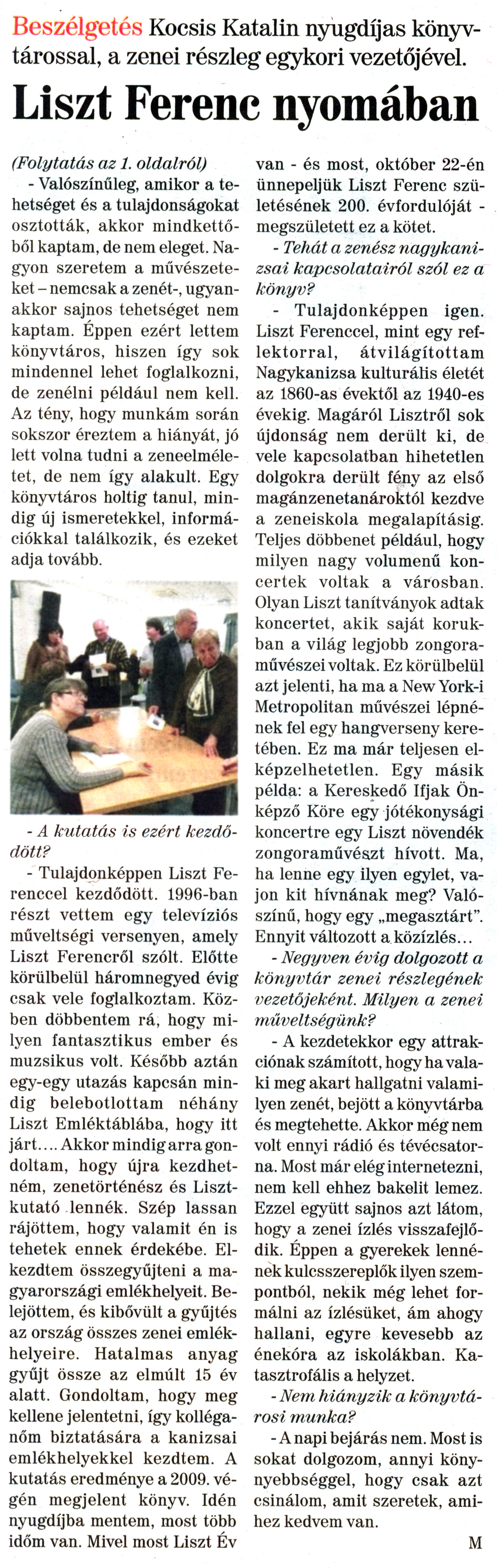 Nyilvános 2099 | 7083 | Nagykanizsai Maraton 2011. október 21. 42. szám 2. oldal - Liszt Ferenc nyomában | A cikk szövege: Beszélgetés Kocsis Katalin nyugdíjas könyvtárossal, a zenei részleg egykori vezetőjével. Liszt Ferenc nyomában (Folytatás az 1. oldalról) - Valószínűleg, amikor a tehetséget és a tulajdonságokat osztották, akkor mindkettőből kaptam, de nem eleget. Nagyon szeretem a művészeteket - nemcsak a zenét-, ugyanakkor sajnos tehetséget nem kaptam. Éppen ezért lettem könyvtáros, hiszen így sok mindennel lehet foglalkozni, de zenélni például nem kell. Az tény, hogy munkám során sokszor éreztem a hiányát, jó lett volna tudni a zeneelméletet, de nem így alakult. Egy könyvtáros holtig tanul, mindig új ismeretekkel, információkkal találkozik, és ezeket adja tovább. - A kutatás is ezért kezdődött? - Tulajdonképpen Liszt Ferenccel kezdődött. 1996-ban részt vettem egy televíziós műveltségi versenyen, amely Liszt Ferencről szólt. Előtte körülbelül háromnegyed évig csak vele foglalkoztam. Közben döbbentem rá, hogy milyen fantasztikus ember és muzsikus volt. Később aztán egy-egy utazás kapcsán mindig belebotlottam néhány Liszt Emléktáblába, hogy itt járt.... Akkor mindig arra gondoltam, hogy újra kezdhetném, zenetörténész és Lisztkutató lennék. Szép lassan rájöttem, hogy valamit én is tehetek ennek érdekébe. Elkezdtem összegyűjteni a magyarországi emlékhelyeit. Belejöttem, és kibővült a gyűjtés az ország összes zenei emlékhelyeire. Hatalmas anyag gyűjt össze az elmúlt 15 év alatt. Gondoltam, hogy meg kellene jelentetni, így kolléganőm biztatására a kanizsai emlékhelyekkel kezdtem. A kutatás eredménye a 2009. végén megjelent könyv. Idén nyugdíjba mentem, most több időm van. Mivel most Liszt Év van - és most, október 22-én ünnepeljük Liszt Ferenc születésének 200. évfordulóját -megszületett ez a kötet. - Tehát a zenész nagykanizsai kapcsolatairól szól ez a könyv? - Tulajdonképpen igen. Liszt Ferenccel, mint egy reflektorral, átvilágítottam Nagykanizsa kulturális életét az 1860-as évektől az 1940-es évekig. Magáról Lisztről sok újdonság nem derült ki, de vele kapcsolatban hihetetlen dolgokra derült fény az első magánzenetanároktól kezdve a zeneiskola megalapításig. Teljes döbbenet például, hogy milyen nagy volumenű koncertek voltak a városban. Olyan Liszt tanítványok adtak koncertet, akik saját korukban a világ legjobb zongoraművészeivoltak. Ez körülbelül azt jelenti, ha ma a New York-i Metropolitan művészei lépnének fel egy hangverseny keretében. Ez ma már teljesen elképzelhetetlen. Egy másik példa: a Kereskedő Ifjak Önképző Köre egy jótékonysági koncertre egy Liszt növendék zongoraművészt hívott. Ma, ha lenne egy ilyen egylet, vajon kit hívnának meg? Valószínű, hogy egy „megasztárt". Ennyit változott a közízlés... - Negyven évig dolgozott a könyvtár zenei részlegének vezetőjeként. Milyen a zenei műveltségűnk? - A kezdetekkor egy attrakciónak számított, hogy ha valaki meg akart hallgatni valamilyen zenét, bejött a könyvtárba és megtehette. Akkor még nem volt ennyi rádió és tévécsatorna. Most már elég internetezni, nem kell ehhez bakelit lemez. Ezzel együtt sajnos azt látom, hogy a zenei ízlés visszafejlődik. Éppen a gyerekek lennének kulcsszereplők ilyen szempontból, nekik még lehet formálni az ízlésüket, ám ahogy hallani, egyre kevesebb az énekóra az iskolákban. Katasztrofális a helyzet. - Nem hiányzik a könyvtárosi munka? - A napi bejárás nem. Most is sokat dolgozom, annyi köny-nyebbséggel, hogy csak azt csinálom, amit szeretek, amihez kedvem van. |