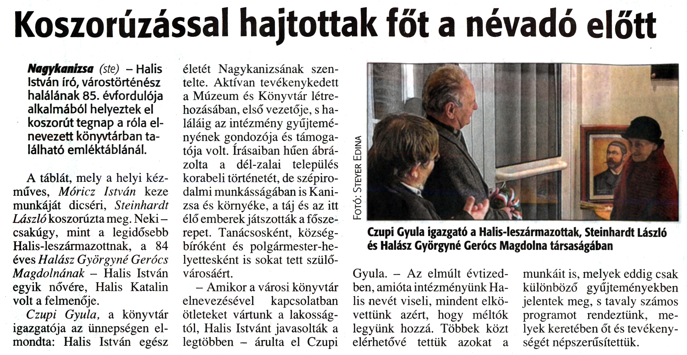 Nyilvános 1854 | 4295 | Zalai Hírlap 2012. február 24. 47. szám 4. oldal - Koszorúzással hajtottak főt a névadó előtt | Koszorúzással hajtottak főt a névadó előtt Nagykanizsa (ste) - Halis István író, várostörténész halálának 85. évfordulója alkalmából helyeztek el koszorút tegnap a róla elnevezett könyvtárban található emléktáblánál. A táblát, mely a helyi kézműves, Móricz István keze munkáját dicséri, Steinhardt László koszorúzta meg. Neki -csakúgy, mint a legidősebb Halis-leszármazottnak, a 84 éves Halász Györgyné Gerócs Magdolnának - Halis István egyik nővére, Halis Katalin volt a felmenője. Czupi Gyula, a könyvtár igazgatója az ünnepségen elmondta: Halis István egész életét Nagykanizsának szentelte. Aktívan tevékenykedett a Múzeum és Könyvtár létrehozásában, első vezetője, s haláláig az intézmény gyűjteményének gondozója és támogatója volt. Írásaiban hűen ábrázolta a dél-zalai település korabeli történetét, de szépirodalmi munkásságában is Kanizsa és környéke, a táj és az itt élő emberek játszották a főszerepet. Tanácsosként, községbíróként és polgármester-helyettesként is sokat tett szülővárosáért. - Amikor a városi könyvtár elnevezésével kapcsolatban ötleteket vártunk a lakosságtól, Halis Istvánt javasolták a legtöbben - árulta el Czupi Gyula. - Az elmúlt évtizedben, amióta intézményünk Halis nevét viseli, mindent elkövettünk azért, hogy méltók legyünk hozzá. Többek közt elérhetővé tettük azokat a munkáit is, melyek eddig csak különböző gyűjteményekben jelentek meg, s tavaly számos programot rendeztünk, melyek keretében őt és tevékenységét népszerűsítettük. Czupi Gyula igazgató a Halis-leszármazottak, Steinhardt László és Halász Györgyné Gerócs Magdolna társaságában Fotó: Steyer Edina |