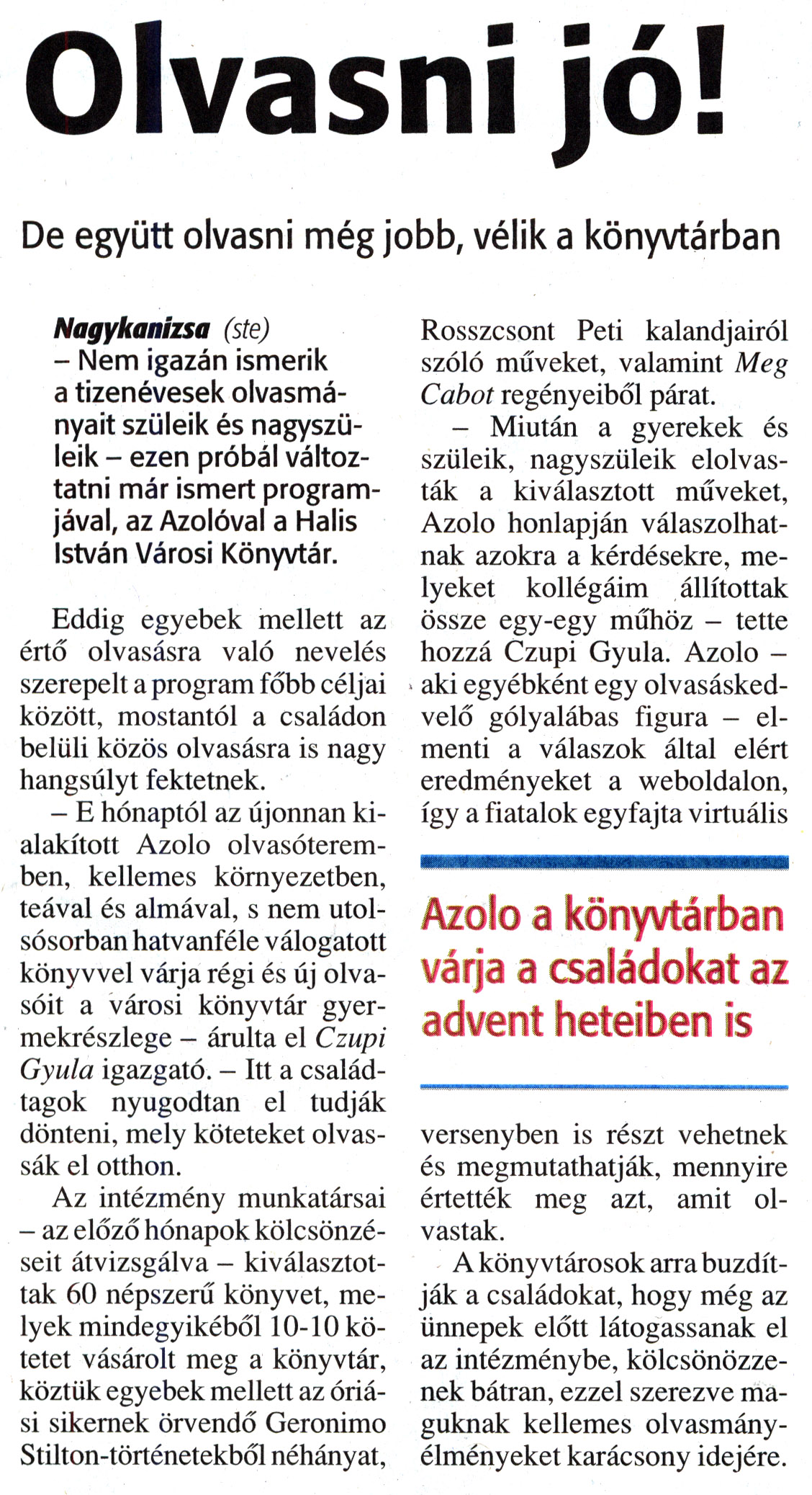 Nyilvános 1753 | 4472 | Zalai Hírlap 2012. december 6. 285. szám 11. oldal - Olvasni jó | Olvasni jó! De együtt olvasni még jobb, vélik a könyvtárban Azolo a könyvtárban várja a családokat az advent heteiben is Nagykanizsa (ste) - Nem igazán ismerik a tizenévesek olvasmányait szüleik és nagyszüleik - ezen próbál változtatni már ismert programjával, az Azolóval a Halis István Városi Könyvtár. Eddig egyebek mellett az értő olvasásra való nevelés szerepelt a program főbb céljai között, mostantól a családon belüli közös olvasásra is nagy hangsúlyt fektetnek. - E hónaptól az újonnan kialakított Azolo olvasóteremben, kellemes környezetben, teával és almával, s nem utolsósorban hatvanféle válogatott könyvvel várja régi és új olvasóit a városi könyvtár gyermekrészlege - árulta el Czupi Gyula igazgató. - Itt a családtagok nyugodtan el tudják dönteni, mely köteteket olvassák el otthon. Az intézmény munkatársai - az előző hónapok kölcsönzéseit átvizsgálva - kiválasztottak 60 népszerű könyvet, melyek mindegyikéből 10-10 kötetet vásárolt meg a könyvtár, köztük egyebek mellett az óriási sikernek örvendő Geronimo Stilton-történetekből néhányat, Rosszcsont Peti kalandjairól szóló műveket, valamint Meg Cabot regényeiből párat. - Miután a gyerekek és szüleik, nagyszüleik elolvasták a kiválasztott műveket, Azolo honlapján válaszolhatnak azokra a kérdésekre, melyeket kollégáim állítottak össze egy-egy műhöz - tette hozzá Czupi Gyula. Azolo -aki egyébként egy olvasáskedvelő gólyalábas figura - elmenti a válaszok által elért eredményeket a weboldalon, így a fiatalok egyfajta virtuális versenyben is részt vehetnek és megmutathatják, mennyire értették meg azt, amit olvastak. A könyvtárosok arra buzdítják a családokat, hogy még az ünnepek előtt látogassanak el az intézménybe, kölcsönözzenek bátran, ezzel szerezve maguknak kellemes olvasmányélményeket karácsony idejére. |