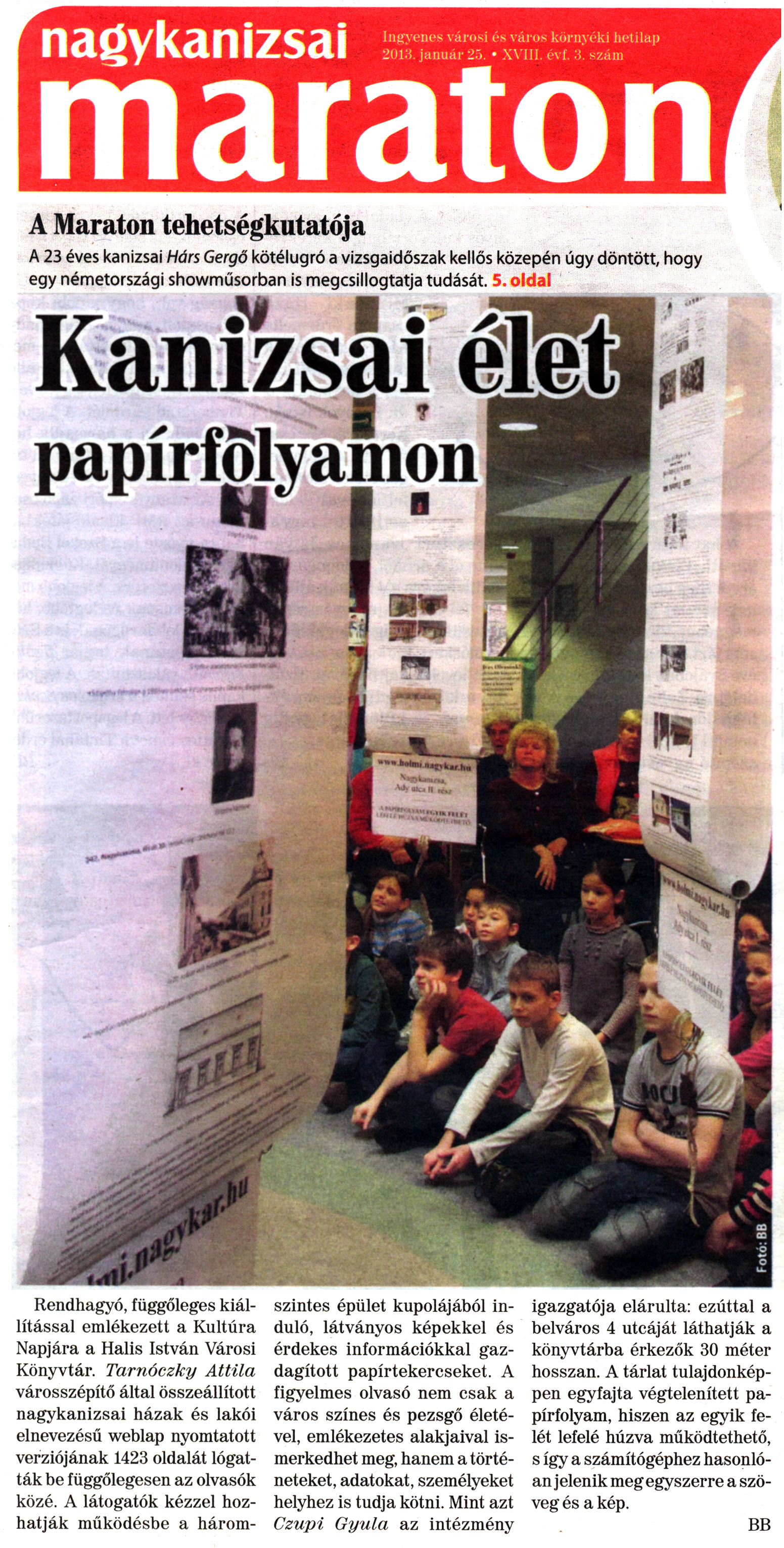 Nyilvános 1792 | 5208 | Nagykanizsai Maraton 2013. január 25. 3. szám 1. oldal - Kanizsai élet papírfolyamon | Kanizsai élet papírfolyamon Rendhagyó, függőleges kiállítással emlékezett a Kultúra Napjára a Halis István Városi Könyvtár. Tarnóczky Attila városszépítő által összeállított nagykanizsai házak és lakói elnevezésű weblap nyomtatott verziójának 1423 oldalát lógatták be függőlegesen az olvasók közé. A látogatók kézzel hozhatják működésbe a háromszintes épület kupolájából induló, látványos képekkel és érdekes információkkal gazdagított papírtekercseket. A figyelmes olvasó nem csak a város színes és pezsgő életével, emlékezetes alakjaival ismerkedhet meg, hanem a történeteket, adatokat, személyeket helyhez is tudja kötni. Mint azt Czupi Gyula az intézmény igazgatója elárulta: ezúttal a belváros 4 utcáját láthatják a könyvtárba érkezők 30 méter hosszan. A tárlat tulajdonképpen egyfajta végtelenített papírfolyam, hiszen az egyik felét lefelé húzva működtethető, s így a számítógéphez hasonlóan jelenik meg egyszerre a szöveg és a kép. BB |