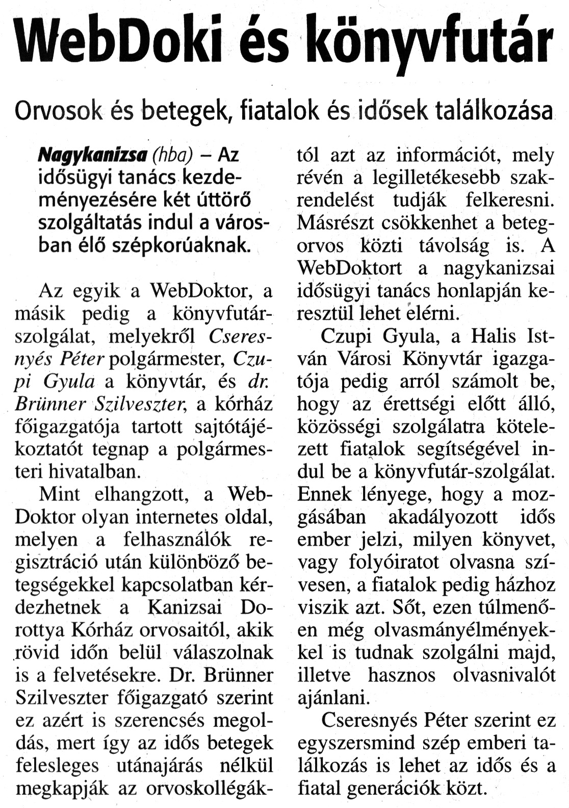 Nyilvános 2152 | 4900 | Zalai Hírlap 2014. április 19 92. szám 3. oldal - WebDoki és könyvfutár | WebDoki és könyvfutár Orvosok és betegek, fiatalok és idősek találkozása Nagykanizsa (hba) - Az idősügyi tanács kezdeményezésére két úttörő szolgáltatás indul a városban élő szépkorúaknak. Az egyik a WebDoktor, a másik pedig a könyvfutárszolgálat, melyekről Cseresnyés Péter polgármester, Czupi Gyula a könyvtár, és dr. Brünner Szilveszter, a kórház főigazgatója tartott sajtótájékoztatót tegnap a polgármesteri hivatalban. Mint elhangzott, a WebDoktor olyan internetes oldal, melyen a felhasználók regisztráció után különböző betegségekkel kapcsolatban kérdezhetnek a Kanizsai Dorottya Kórház orvosaitól, akik rövid időn belül válaszolnak is a felvetésekre. Dr. Brünner Szilveszter főigazgató szerint ez azért is szerencsés megoldás, mert így az idős betegek felesleges utánajárás nélkül megkapják az orvoskollégáktól azt az információt, mely révén a legilletékesebb szakrendelést tudják felkeresni. Másrészt csökkenhet a betegorvos közti távolság is. A WebDoktort a nagykanizsai idősügyi tanács honlapján keresztül lehet elérni. Czupi Gyula, a Halis István Városi Könyvtár igazgatója pedig arról számolt be, hogy az érettségi előtt álló, közösségi szolgálatra kötelezett fiatalok segítségével indul be a könyvfutár-szolgálat. Ennek lényege, hogy a mozgásában akadályozott idős ember jelzi, milyen könyvet, vagy folyóiratot olvasna szívesen, a fiatalok pedig házhoz viszik azt. Sőt, ezen túlmenően még olvasmányélményekkel is tudnak szolgálni majd, illetve hasznos olvasnivalót ajánlani. Cseresnyés Péter szerint ez egyszersmind szép emberi találkozás is lehet az idős és a fiatal generációk közt. |