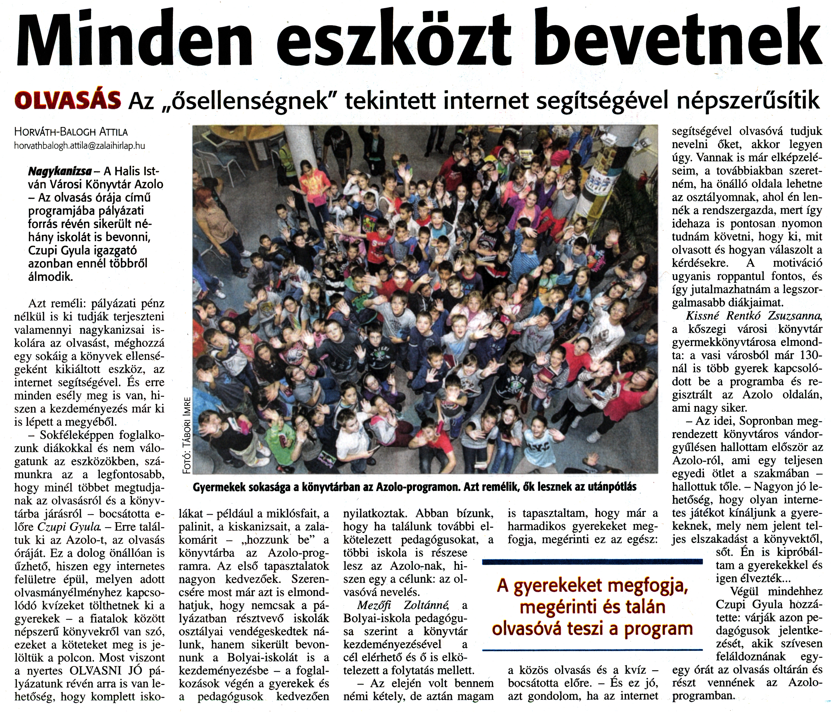 Nyilvános 1887 | 3646 | Zalai Hírlap 2014. november 19. 269. szám 7. oldal - Minden eszközt bevetnek | Minden eszközt bevetnek OLVASÁS Az „ősellenségnek" tekintett internet segítségével népszerűsítik A gyerekeket megfogja, megérinti és talán olvasóvá teszi a program Gyermekek sokasága a könyvtárban az Azolo-programon. Azt remélik, ők lesznek az utánpótlás Horváth-Balogh Attila horvathbalogh.attila@zalaihirlap.hu Nagykanizsa- A Halis István Városi Könyvtár Azolo - Az olvasás órája című programjába pályázati forrás révén sikerült néhány iskolát is bevonni, Czupi Gyula igazgató azonban ennél többről álmodik. Azt reméli: pályázati pénz nélkül is ki tudják terjeszteni valamennyi nagykanizsai iskolára az olvasást, méghozzá egy sokáig a könyvek ellenségeként kikiáltott eszköz, az internet segítségével. És erre minden esély meg is van, hiszen a kezdeményezés már ki is lépett a megyéből. - Sokféleképpen foglalkozunk diákokkal és nem válogatunk az eszközökben, számunkra az a legfontosabb, hogy minél többet megtudjanak az olvasásról és a könyvtárba járásról - bocsátotta e-lőre Czupi Gyula - Erre találtuk ki az Azolo-t, az olvasás óráját. Ez a dolog önállóan is űzhető, hiszen egy internetes felületre épül, melyen adott olvasmányélményhez kapcsolódó kvízeket tölthetnek ki a gyerekek - a fiatalok között népszerű könyvekről van szó, ezeket a köteteket meg is jelöltük a polcon. Most viszont a nyertes OLVASNI JÓ pályázatunk révén arra is van lehetőség, hogy komplett iskolákat - például a miklósfait, a palinit, a kiskanizsait, a zalakomárit - „hozzunk be" a könyvtárba az Azolo-programra. Az első tapasztalatok nagyon kedvezőek. Szerencsére most már azt is elmondhatjuk, hogy nemcsak a pályázatban résztvevő iskolák osztályai vendégeskedtek nálunk, hanem sikerült bevonnunk a Bolyai-iskolát is a kezdeményezésbe - a foglalkozások végén a gyerekek és a pedagógusok kedvezően nyilatkoztak. Abban bízunk, hogy ha találunk további elkötelezett pedagógusokat, a többi iskola is részese lesz az Azolo-nak, hiszen egy a célunk: az olvasóvá nevelés. Mezőfi Zoltánné, a Bolyai-iskola pedagógusa szerint a könyvtár kezdeményezésével a cél elérhető és ő is elkötelezett a folytatás mellett. - Az elején volt bennem némi kétely, de aztán magam is tapasztaltam, hogy már a harmadikos gyerekeket megfogja, megérinti ez az egész: a közös olvasás és a kvíz -bocsátotta előre. - És ez jó, azt gondolom, ha az internet segítségével olvasóvá tudjuk nevelni őket, akkor legyen úgy. Vannak is már elképzeléseim, a továbbiakban szeretném, ha önálló oldala lehetne az osztályomnak, ahol én lennék a rendszergazda, mert így idehaza is pontosan nyomon tudnám követni, hogy ki, mit olvasott és hogyan válaszolt a kérdésekre. A motiváció ugyanis roppantul fontos, és így jutalmazhatnám a legszorgalmasabb diákjaimat. Kissné Rentkó Zsuzsanna a kőszegi városi könyvtár gyermekkönyvtárosa elmondta: a vasi városból már 130-nál is több gyerek kapcsolódott be a programba és regisztrált az Azolo oldalán, ami nagy siker. - Az idei, Sopronban megrendezett könyvtáros vándorgyűlésen hallottam először az Azolo-ról, ami egy teljesen egyedi ötlet a szakmában -hallottuk tőle. - Nagyon jó lehetőség, hogy olyan internetes játékot kínáljunk a gyerekeknek, mely nem jelent teljes elszakadást a könyvektől, sőt. Én is kipróbáltam a gyerekekkel és igen élvezték... Végül mindehhez Czupi Gyula hozzátette: várják azon pedagógusok jelentkezését, akik szívesen feláldoznának egy-egy órát az olvasás oltárán és részt vennének az Azolo-programban. |