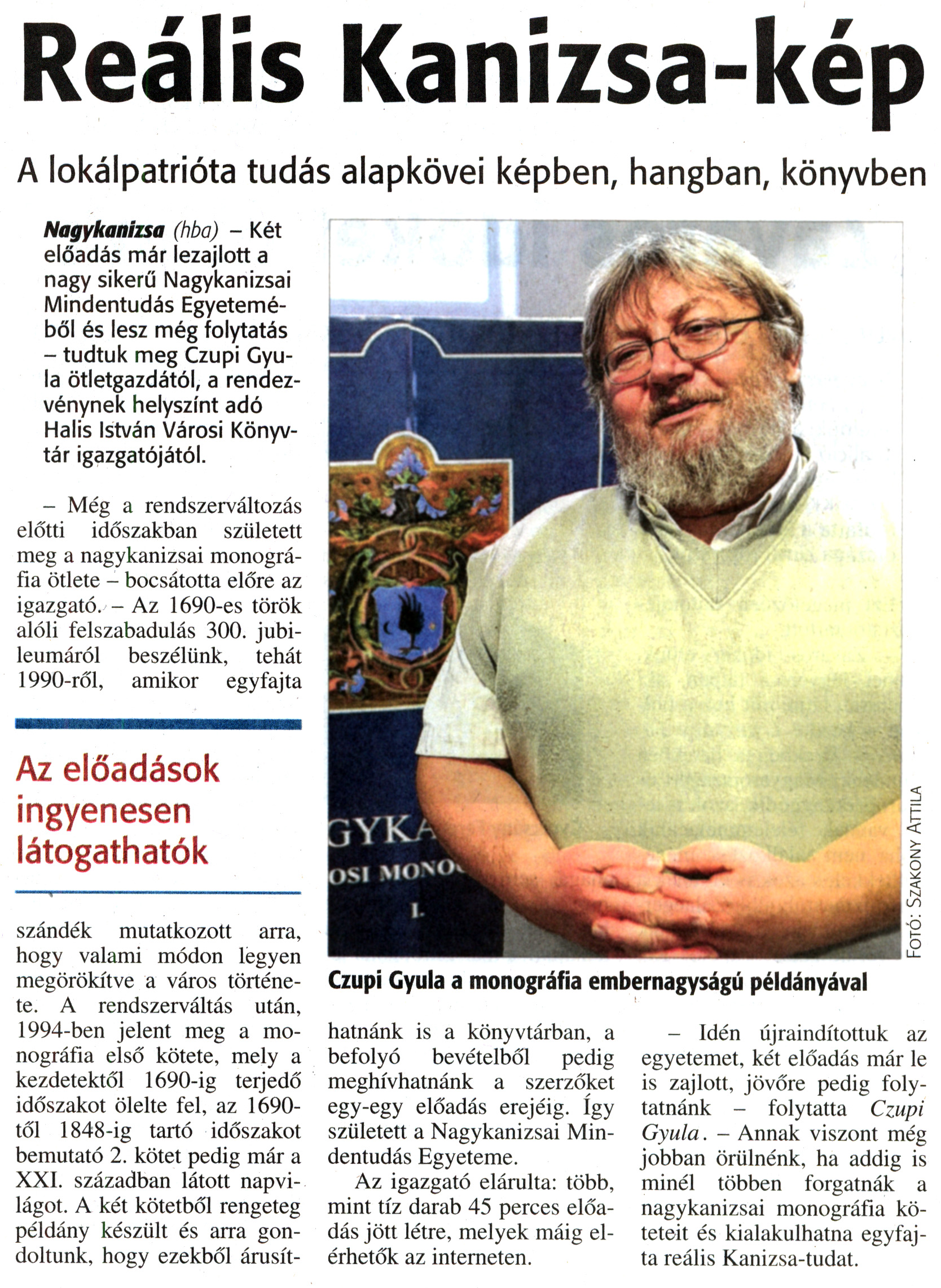 Nyilvános 1915 | 4054 | Zalai Hírlap 2015. november 19. 271. szám 4. oldal | Reális Kanizsa-kép A lokálpatrióta tudás alapkövei képben, hangban, könyvben Nagykanizsa (hba) - Két előadás már lezajlott a nagy sikerű Nagykanizsai Mindentudás Egyeteméből és lesz még folytatás - tudtuk meg Czupi Gyula ötletgazdától, a rendezvénynek helyszínt adó Halis István Városi Könyvtár igazgatójától. - Még a rendszerváltozás előtti időszakban született meg a nagykanizsai monográfia ötlete - bocsátotta előre az igazgató. - Az 1690-es török alóli felszabadulás 300. jubileumáról beszélünk, tehát 1990-ről, amikor egyfajta szándék mutatkozott arra, hogy valami módon legyen megörökítve a város története. A rendszerváltás után, 1994-ben jelent meg a monográfia első kötete, mely a kezdetektől 1690-ig terjedő időszakot ölelte fel, az 1690-től 1848-ig tartó időszakot bemutató 2. kötet pedig már a XXI. században látott napvilágot. A két kötetből rengeteg példány készült és arra gondoltunk, hogy ezekből árusíthatnánk is a könyvtárban, a befolyó bevételből pedig meghívhatnánk a szerzőket egy-egy előadás erejéig. Így született a Nagykanizsai Mindentudás Egyeteme. Az igazgató elárulta: több, mint tíz darab 45 perces előadás jött létre, melyek máig elérhetők az interneten. - Idén újraindítottuk az egyetemet, két előadás már le is zajlott, jövőre pedig folytatnánk - folytatta Czupi Gyula. - Annak viszont még jobban örülnénk, ha addig is minél többen forgatnák a nagykanizsai monográfia köteteit és kialakulhatna egyfajta reális Kanizsa-tudat. |