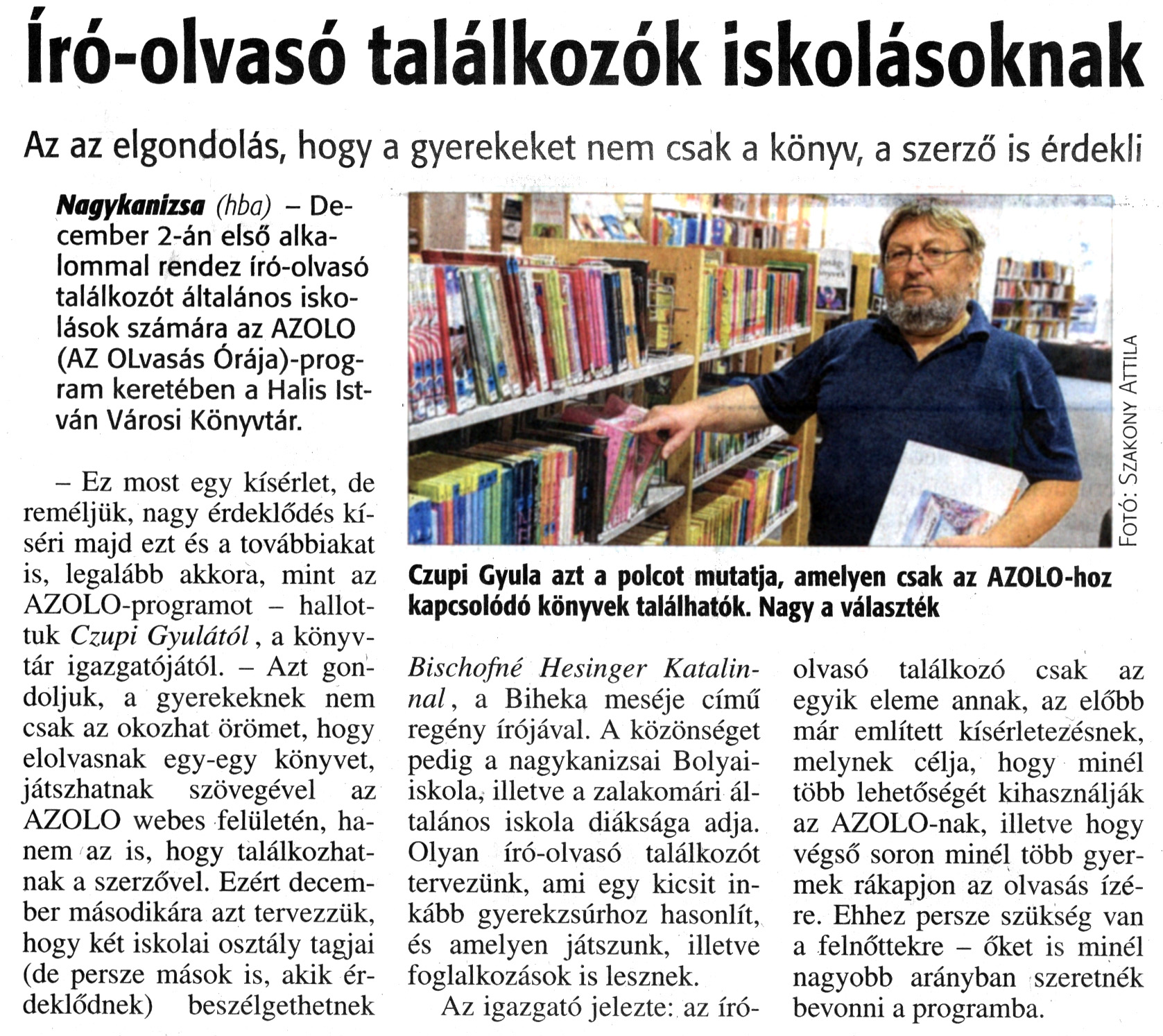 Nyilvános 1681 | 3393 | Zalai Hírlap 2015. november 26. 277. szám 4. oldal | Író-olvasó találkozók iskolásoknak Az az elgondolás, hogy a gyerekeket nem csak a könyv, a szerző is érdekli Nagykanizsa (hba) - December 2-án első alkalommal rendez író-olvasó találkozót általános iskolások számára az AZOLO (AZ OLvasás Órája)-program keretében a Halis István Városi Könyvtár. - Ez most egy kísérlet, de reméljük, nagy érdeklődés kíséri majd ezt és a továbbiakat is, legalább akkora, mint az AZOLO-programot - hallottuk Czupi Gyulától, a könyvtár igazgatójától. - Azt gondoljuk, a gyerekeknek nem csak az okozhat örömet, hogy elolvasnak egy-egy könyvet, játszhatnak szövegével az AZOLO webes felületén, hanem az is, hogy találkozhatnak a szerzővel. Ezért december másodikára azt tervezzük, hogy két iskolai osztály tagjai (de persze mások is, akik érdeklődnek) beszélgethetnek Bischofné Hesinger Katalinnal, a Biheka meséje című regény írójával. A közönséget pedig a nagykanizsai Bolyaiiskola, illetve a zalakomári általános iskola diáksága adja. Olyan író-olvasó találkozót tervezünk, ami egy kicsit inkább gyerekzsúrhoz hasonlít, és amelyen játszunk, illetve foglalkozások is lesznek. Az igazgató jelezte: az író-olvasó találkozó csak az egyik eleme annak, az előbb már említett kísérletezésnek, melynek célja, hogy minél több lehetőségét kihasználják az AZOLO-nak, illetve hogy végső soron minél több gyermek rákapjon az olvasás ízére. Ehhez persze szükség van a felnőttekre - őket is minél nagyobb arányban szeretnék bevonni a programba. Czupi Gyula azt a polcot mutatja, amelyen csak az AZOLO-hoz kapcsolódó könyvek találhatók. Nagy a választék |