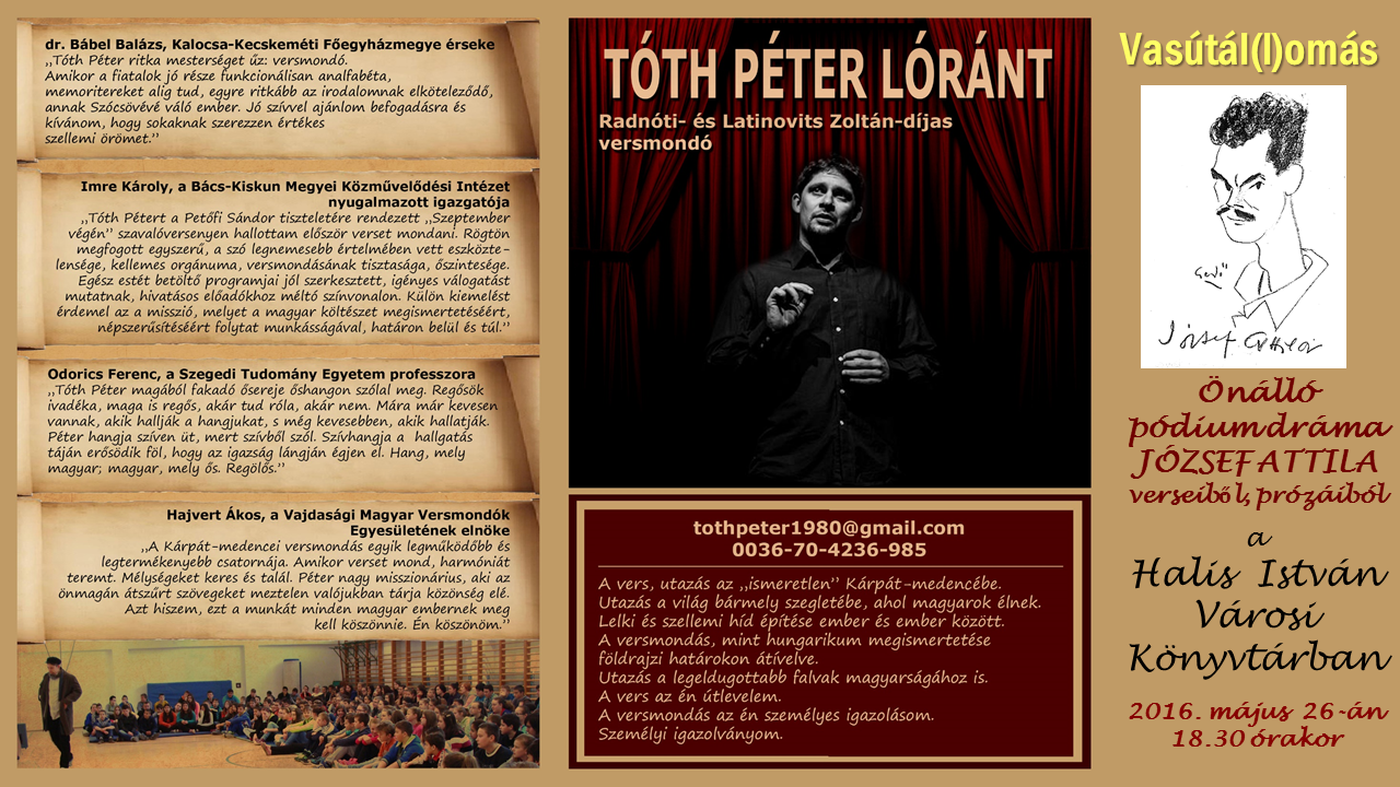 Nyilvános 1615 | 3107 | József Attila est a Halis István Városi Könyvtárban | Aki már látta, újra akarja látni, aki még nem, sajnálja, hogy eddig nem volt lehetősége rá. Így vannak az emberek Tóth Péter Radnóti-díjas előadó VASÚT ÁL(L)OMÁS című pódium-drámájával, melynek megismételt kanizsai előadására 2016. május 26-án 18.30 órakor kerül sor a könyvtárban. Egy ember (jelesül József Attila) megérkezik egy vasútállomásra. Utazik valahová, mert mint minden igaz költőnek, neki is ÚTJA VAN. Amíg várakozik a vonatra, szóba elegyedik a többi utassal (ez esetben a közönséggel). A vonat – mint Magyarországon általában – késik. Így a költőnek bőven van ideje mesélni, elgondolkodni álmairól, vágyairól, életéről, hitéről, édesanyjáról, gyermekkoráról, egyetemi nekibuzdulásáról, az országról, az emberekről, Európáról. Mindezt rendkívüli átéléssel, hittel, lelki áradással. Mindenkit szeretettel várunk. |