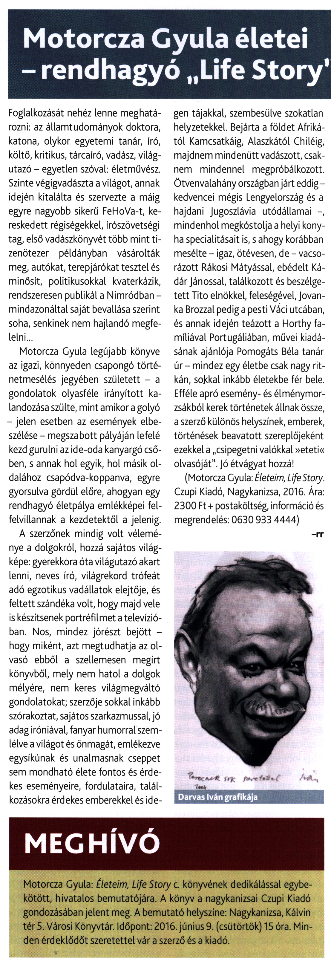 Nyilvános 1895 | 3668 | Nimród vadászújság 2016. június, 54. oldal - Motorcza Gyula életei - rendhagyó Life Story | Foglalkozását nehéz lenne meghatározni: az államtudományok doktora, katona, olykor egyetemi tanár, író, költő, kritikus, tárcaíró, vadász, világutazó - egyetlen szóval: életművész. Szinte végigvadászta a világot, annak idején kitalálta és szervezte a máig egyre nagyobb sikerű FeHoVa-t, kereskedett régiségekkel, írószövetségi tag, első vadászkönyvét több mint tizenötezer példányban vásárolták meg, autókat, terepjárókat tesztel és minősít, politikusokkal kvaterkázik, rendszeresen publikál a Nimródban -mindazonáltal saját bevallása szerint soha, senkinek nem hajlandó megfelelni... Motorcza Gyula legújabb könyve az igazi, könnyeden csapongó történetmesélés jegyében született - a gondolatok olyasféle irányított kalandozása szülte, mint amikor a golyó - jelen esetben az események elbeszélése - megszabott pályáján lefelé kezd gurulni az ide-oda kanyargó csőben, s annak hol egyik, hol másik oldalához csapódva-koppanva, egyre gyorsulva gördül előre, ahogyan egy rendhagyó életpálya emlékképei felfelvillannak a kezdetektől a jelenig. A szerzőnek mindig volt véleménye a dolgokról, hozzá sajátos világképe: gyerekkora óta világutazó akart lenni, neves író, világrekord trófeát adó egzotikus vadállatok elejtője, és feltett szándéka volt, hogy majd vele is készítsenek portréfilmet a televízióban. Nos, mindez jórészt bejött - hogy miként, azt megtudhatja az olvasó ebből a szellemesen megírt könyvből, mely nem hatol a dolgok mélyére, nem keres világmegváltó gondolatokat; szerzője sokkal inkább szórakoztat, sajátos szarkazmussal, jó adag iróniával, fanyar humorral szemlélve a világot és önmagát, emlékezve egysíkúnak és unalmasnak cseppet sem mondható élete fontos és érdekes eseményeire, fordulataira, találkozásokra érdekes emberekkel és idegen tájakkal, szembesülve szokatlan helyzetekkel. Bejárta a földet Afrikától Kamcsatkáig, Alaszkától Chiléig, majdnem mindenütt vadászott, csaknem mindennel megpróbálkozott. Ötvenvalahány országban járt eddig -kedvencei mégis Lengyelország és a hajdani Jugoszlávia utódállamai -, mindenhol megkóstolja a helyi konyha specialitásait is, s ahogy korábban mesélte - igaz, ötévesen, de - vacsorázott Rákosi Mátyással, ebédelt Kádár Jánossal, találkozott és beszélgetett Tito elnökkel, feleségével, Jovan-ka Brozzal pedig a pesti Váci utcában, és annak idején teázott a Horthy famíliával Portugáliában, művei kiadásának ajánlója Pomogáts Béla tanár úr - mindez egy életbe csak nagy ritkán, sokkal inkább életekbe fér bele. Efféle apró esemény- és élménymorzsákból kerek történetek állnak össze, a szerző különös helyszínek, emberek, történések beavatott szereplőjeként ezekkel a csipegetni valókkal »eteti« olvasóját". Jó étvágyat hozzá! (Motorcza Gyula: Életeim, Life Story. Czupi Kiadó, Nagykanizsa, 2016. Ára: 2300 Ft + postaköltség, információ és megrendelés: 0630 933 4444) -rr MEGHÍVÓ Motorcza Gyula: Életeim, Life Story c könyvének dedikálással egybekötött, hivatalos bemutatójára. A könyv a nagykanizsai Czupi Kiadó gondozásában jelent meg. A bemutató helyszíne: Nagykanizsa, Kálvin tér 5. Városi Könyvtár. Időpont: 2016. június 9. (csütörtök) 15 óra. Minden érdeklődőt szeretettel vár a szerző és a kiadó. |