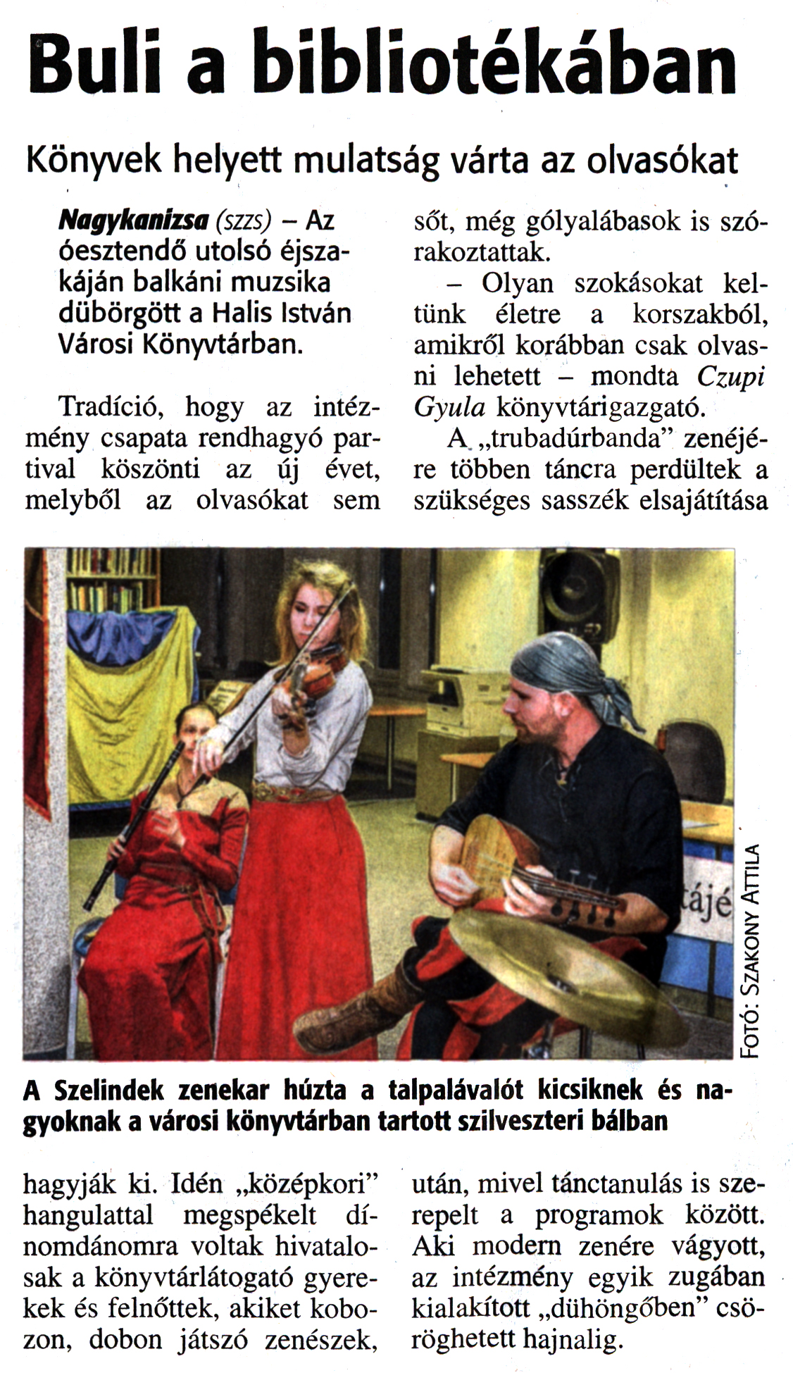 Nyilvános 1848 | 3527 | Zalai Hírlap 2017. január 2. 1. szám 2. oldal - Buli a bibliotékában | Buli a bibliotékában Könyvek helyett mulatság várta az olvasókat Nagykanizsa (szzs) - Az óesztendő utolsó éjszakáján balkáni muzsika dübörgött a Halis István Városi Könyvtárban. Tradíció, hogy az intézmény csapata rendhagyó partival köszönti az új évet, melyből az olvasókat sem hagyják ki. Idén „középkori" hangulattal megspékelt dínomdánomra voltak hivatalosak a könyvtárlátogató gyerekek és felnőttek, akiket kobozon, dobon játszó zenészek, sőt, még gólyalábasok is szórakoztattak. - Olyan szokásokat keltünk életre a korszakból, amikről korábban csak olvasni lehetett - mondta Czupi Gyula könyvtárigazgató. A „trubadúrbanda" zenéjére többen táncra perdültek a szükséges sasszék elsajátítása után, mivel tánctanulás is szerepelt a programok között. Aki modern zenére vágyott, az intézmény egyik zugában kialakított „dühöngőben" csöröghetett hajnalig. |