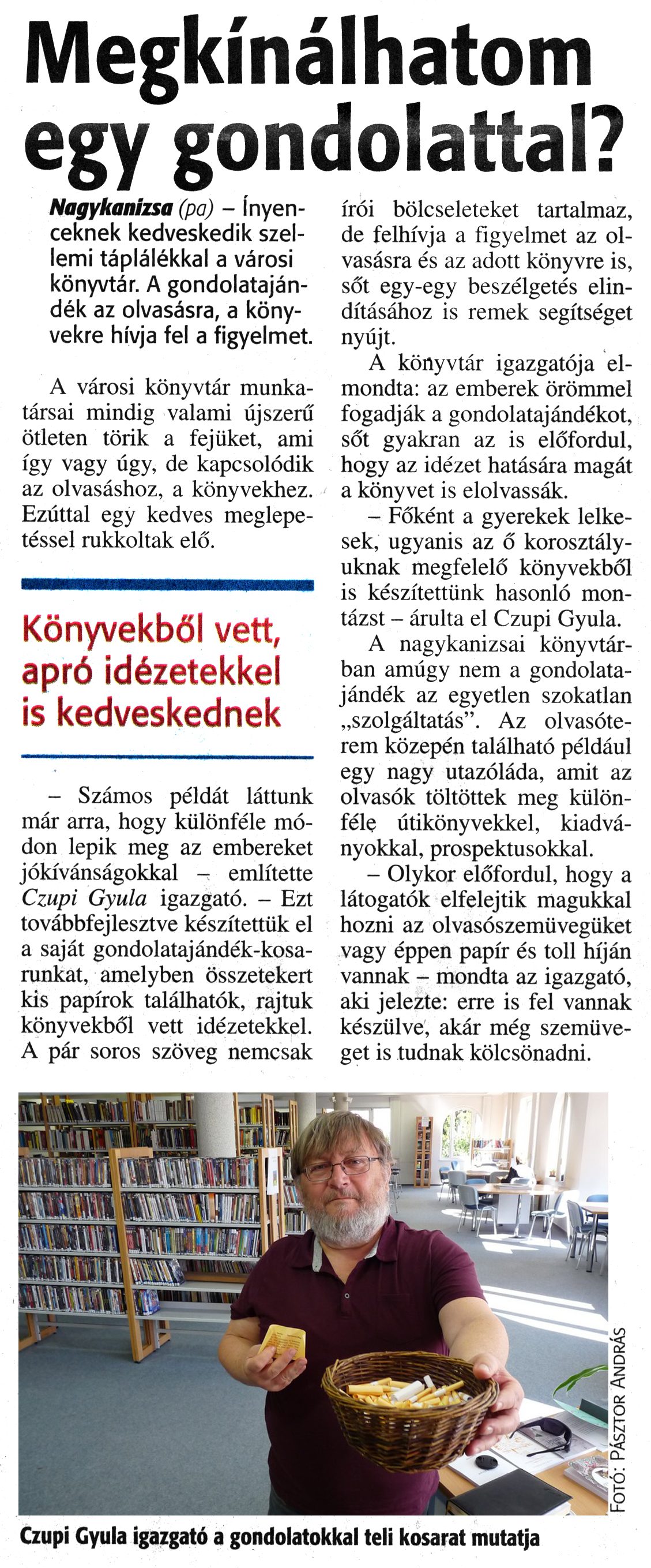 Nyilvános 1848 | 3423 | Zalai Hírlap 2017. március 28. 73. szám 2. oldal | Megkínálhatom egy gondolattal? Nagykanizsa (pa) - Ínyenceknek kedveskedik szellemi táplálékkal a városi könyvtár. A gondolatajándék az olvasásra, a könyvekre hívja fel a figyelmet. A városi könyvtár munkatársai mindig valami újszerű ötleten törik a fejüket, ami így vagy úgy, de kapcsolódik az olvasáshoz, a könyvekhez. Ezúttal egy kedves meglepetéssel rukkoltak elő. Könyvekből vett, apró idézetekkel is kedveskednek - Számos példát láttunk már arra, hogy különféle módon lepik meg az embereket jókívánságokkal - említette Czupi Gyula igazgató. - Ezt továbbfejlesztve készítettük el a saját gondolatajándék-kosarunkat, amelyben összetekert kis papírok találhatók, rajtuk könyvekből vett idézetekkel. A pár soros szöveg nemcsak írói bölcseleteket tartalmaz, de felhívja a figyelmet az olvasásra és az adott könyvre is, sőt egy-egy beszélgetés elindításához is remek segítséget nyújt. A könyvtár igazgatója elmondta: az emberek örömmel fogadják a gondolatajándékot, sőt gyakran az is előfordul, hogy az idézet hatására magát a könyvet is elolvassák. - Főként a gyerekek lelkesek, ugyanis az ő korosztályuknak megfelelő könyvekből is készítettünk hasonló montázst - árulta el Czupi Gyula. A nagykanizsai könyvtárban amúgy nem a gondolatajándék az egyetlen szokatlan „szolgáltatás". Az olvasóterem közepén található például egy nagy utazóláda, amit az olvasók töltöttek meg különféle útikönyvekkel, kiadványokkal, prospektusokkal. - Olykor előfordul, hogy a látogatók elfelejtik magukkal hozni az olvasószemüvegüket vagy éppen papír és toll híján vannak - mondta az igazgató, aki jelezte: erre is fel vannak készülve, akár még szemüveget is tudnak kölcsönadni. Czupi Gyula igazgató a gondolatokkal teli kosarat mutatja |