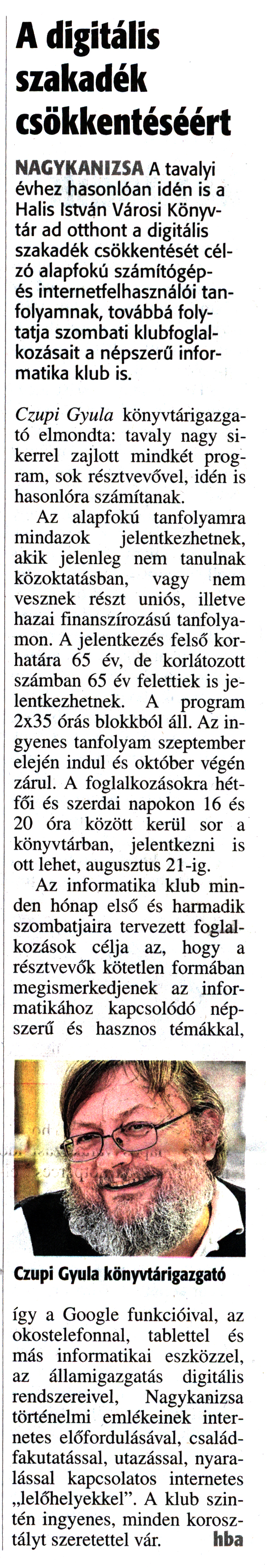 Nyilvános 1680 | 3264 | Zalai Hírlap 2017. augusztus 10. 185. szám 4. oldal | A digitális szakadék csökkentéséért NAGYKANIZSA A tavalyi évhez hasonlóan idén is a Halis István Városi Könyvtár ad otthont a digitális szakadék csökkentését célzó alapfokú számítógép-és internetfelhasználói tanfolyamnak, továbbá folytatja szombati klubfoglalkozásait a népszerű informatika klub is. Czupi Gyula könyvtárigazgató elmondta: tavaly nagy sikerrel zajlott mindkét program, sok résztvevővel, idén is hasonlóra számítanak. Az alapfokú tanfolyamra mindazok jelentkezhetnek, akik jelenleg nem tanulnak közoktatásban, vagy nem vesznek részt uniós, illetve hazai finanszírozású tanfolyamon. A jelentkezés felső korhatára 65 év, de korlátozott számban 65 év felettiek is jelentkezhetnek. A program 2x35 órás blokkból áll. Az ingyenes tanfolyam szeptember elején indul és október végén zárul. A foglalkozásokra hétfői és szerdai napokon 16 és 20 óra között kerül sor a könyvtárban, jelentkezni is ott lehet, augusztus 21-ig. Az informatika klub minden hónap első és harmadik szombatjaira tervezett foglalkozások célja az, hogy a résztvevők kötetlen formában megismerkedjenek az informatikához kapcsolódó népszerű és hasznos témákkal, így a Google funkcióival, az okostelefonnal, tablettel és más informatikai eszközzel, az államigazgatás digitális rendszereivel, Nagykanizsa történelmi emlékeinek internetes előfordulásával, családfakutatással, utazással, nyaralással kapcsolatos internetes „lelőhelyekkel". A klub szintén ingyenes, minden korosztályt szeretettel vár. hba |