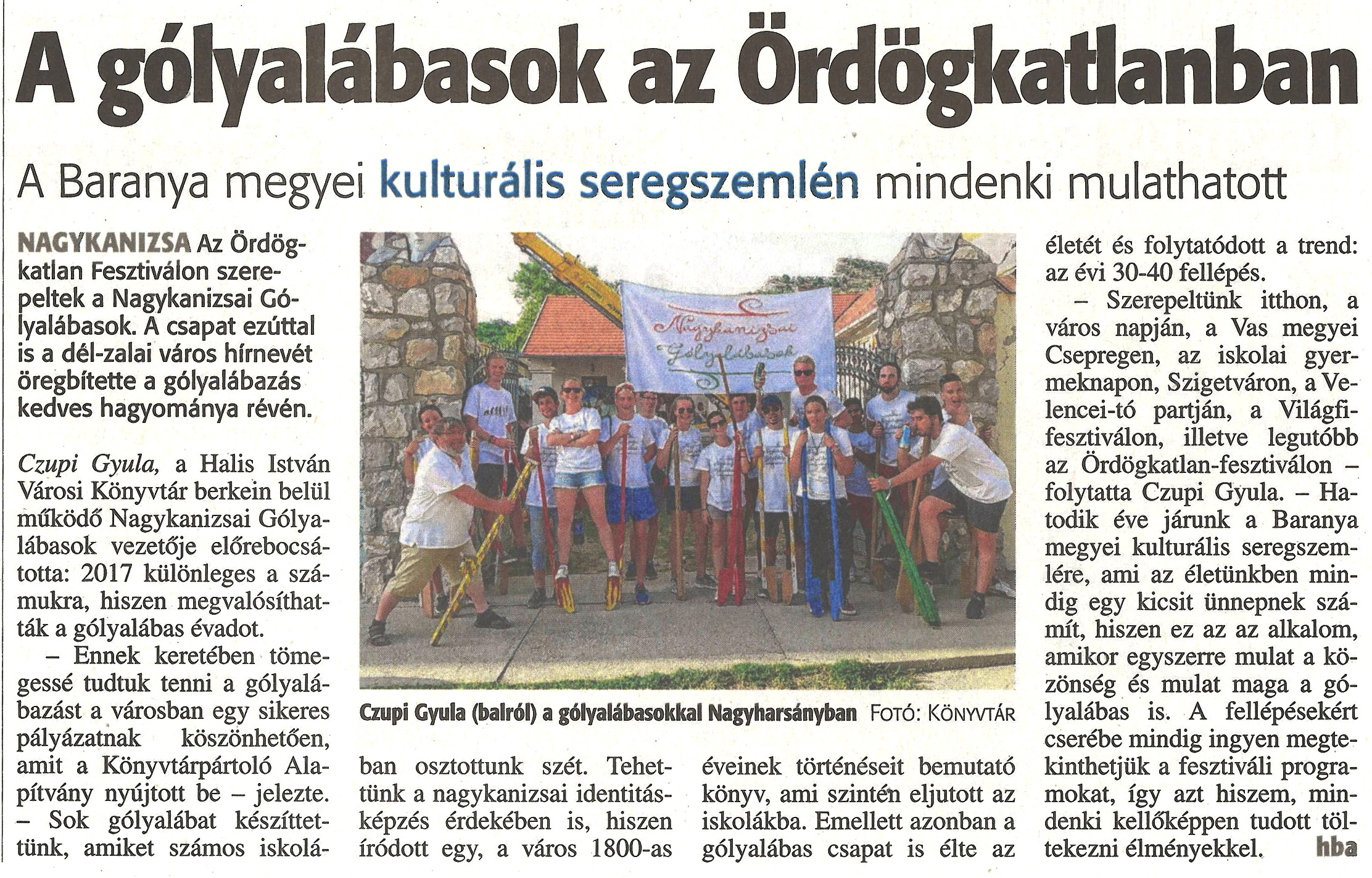 Nyilvános 1392 | 2109 | A gólyalábasok az Ördögkatlanban | A Baranya megyei kulturális seregszemlén mindenki mulathatott NAGYKANIZSA Az Ördög- katlan Fesztiválon szere-peltek a Nagykanizsai Gó-lyalábasok. A csapat ezúttal is a dél-zalai város hírnevét öregbítette a gólyalábazás kedves hagyománya révén. Czupi Gyula, a Halis István Városi Könyvtár berkein belül működő Nagykanizsai Gólya¬lábasok vezetője előrebocsá¬totta: 2017 különleges a szá¬mukra, hiszen megvalósíthat¬ták a gólyalábas évadot. - Ennek keretében töme-gessé tudtuk tenni a gólyalá- bazást a városban egy sikeres pályázatnak köszönhetően, amit a Könyvtárpártoló Ala-pítvány nyújtott be - jelezte. - Sok gólyalábat készíttet-tünk, amiket számos iskolá- Czupi Gyula (balról) a gólyalábasokkal Nagyharsányban FOTÓ: KÖNYVTÁR ban osztottunk szét. Tehet- éveinek történéseit bemutató tünk a nagykanizsai identitás- könyv, ami szintén eljutott az képzés érdekében is, hiszen iskolákba. Emellett azonban a íródott egy, a város 1800-as gólyalábas csapat is élte az életét és folytatódott a trend: az évi 30-40 fellépés. - Szerepeltünk itthon, a város napján, a Vas megyei Csepregen, az iskolai gyer-meknapon, Szigetváron, a Ve¬lencei-tó partján, a Világfi- fesztiválon, illetve legutóbb az Ördögkatlan-fesztiválon - folytatta Czupi Gyula. - Ha-todik éve járunk a Baranya megyei kulturális seregszem¬lére, ami az életünkben min¬dig egy kicsit ünnepnek szá¬mít, hiszen ez az az alkalom, amikor egyszerre mulat a kö¬zönség és mulat maga a gó¬lyalábas is. A fellépésekért cserébe mindig ingyen megte-kinthetjük a fesztiváli progra¬mokat, így azt hiszem, min¬denki kellőképpen tudott töl¬tekezni élményekkel, hba |