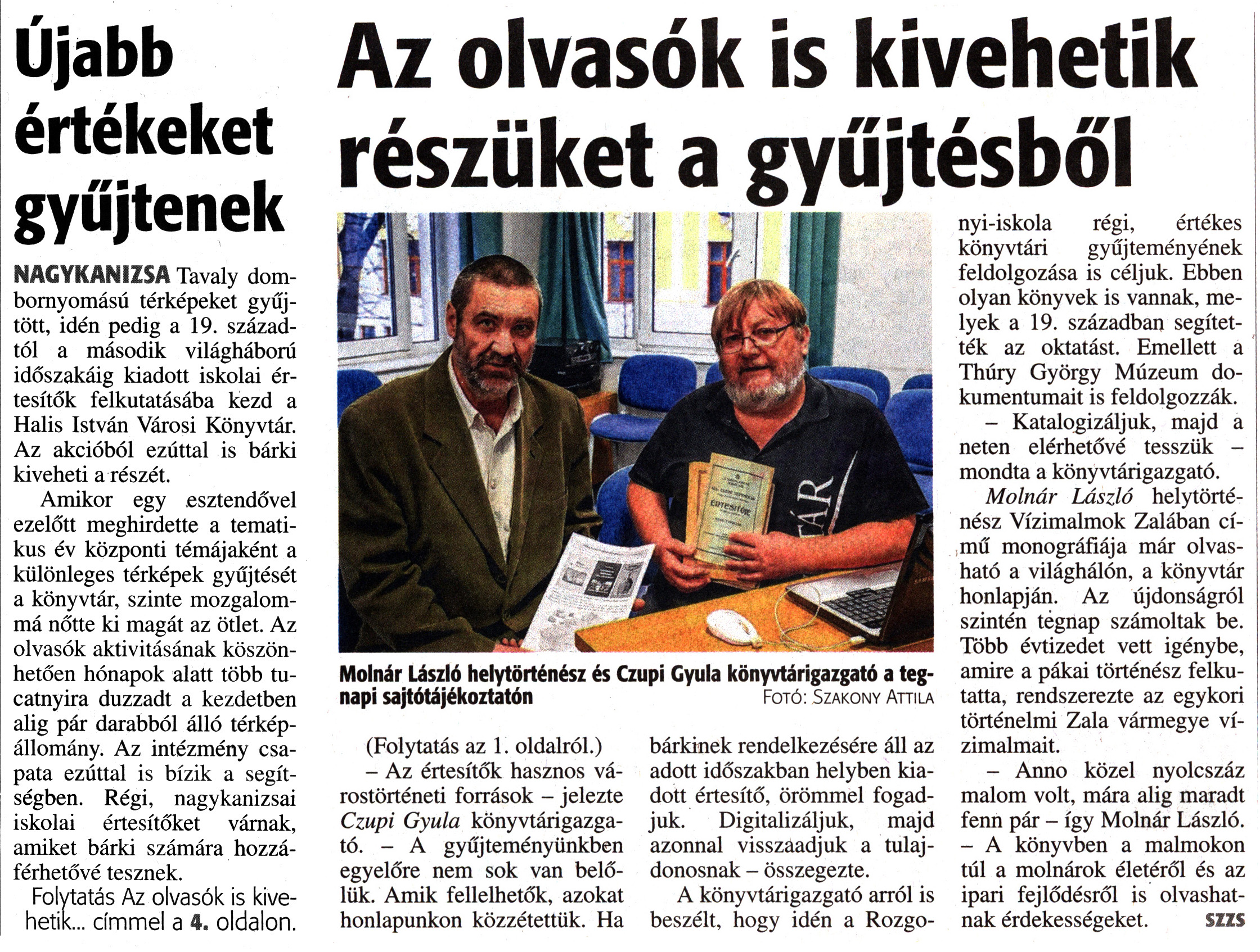 Nyilvános 1860 | 3124 | Zalai Hírlap 2018. január 3. 2. szám 1, 4. oldal | Újabb értékeket gyűjtenek NAGYKANIZSA Tavaly dombornyomású térképeket gyűjtött, idén pedig a 19. századtól a második világháború időszakáig kiadott iskolai értesítők felkutatásába kezd a Halis István Városi Könyvtár. Az akcióból ezúttal is bárki kiveheti a részét. Amikor egy esztendővel ezelőtt meghirdette a tematikus év központi témájaként a különleges térképek gyűjtését a könyvtár, szinte mozgalommá nőtte ki magát az ötlet. Az olvasók aktivitásának köszönhetően hónapok alatt több tucatnyira duzzadt a kezdetben alig pár darabból álló térképállomány. Az intézmény csapata ezúttal is bízik a segítségben. Régi, nagykanizsai iskolai értesítőket várnak, amiket bárki számára hozzáférhetővé tesznek. Folytatás Az olvasók is kivehetik... címmel a 4. oldalon. Az olvasók is kivehetik részüket a gyűjtésből Molnár László helytörténész és Czupi Gyula könyvtárigazgató a tegnapi sajtótájékoztatón Fotó: Szakony Attila (Folytatás az 1. oldalról.) - Az értesítők hasznos várostörténeti források - jelezte Czupi Gyula könyvtárigazgató. - A gyűjteményünkben egyelőre nem sok van belőlük. Amik fellelhetők, azokat honlapunkon közzétettük. Ha bárkinek rendelkezésére áll az adott időszakban helyben kiadott értesítő, örömmel fogadjuk. Digitalizáljuk, majd azonnal visszaadjuk a tulajdonosnak - összegezte. A könyvtárigazgató arról is beszélt, hogy idén a Rozgonyi-iskola régi, értékes könyvtári gyűjteményének feldolgozása is céljuk. Ebben olyan könyvek is vannak, melyek a 19. században segítették az oktatást. Emellett a Thúry György Múzeum dokumentumait is feldolgozzák. - Katalogizáljuk, majd a neten elérhetővé tesszük - mondta a könyvtárigazgató. Molnár László helytörténész Vízimalmok Zalában című monográfiája már olvasható a világhálón, a könyvtár honlapján. Az újdonságról szintén tegnap számoltak be. Több évtizedet vett igénybe, amire a pákai történész felkutatta, rendszerezte az egykori történelmi Zala vármegye vízimalmait. - Anno közel nyolcszáz malom volt, mára alig maradt fenn pár - így Molnár László. - A könyvben a malmokon túl a molnárok életéről és az ipari fejlődésről is olvashatnak érdekességeket. SZZS |