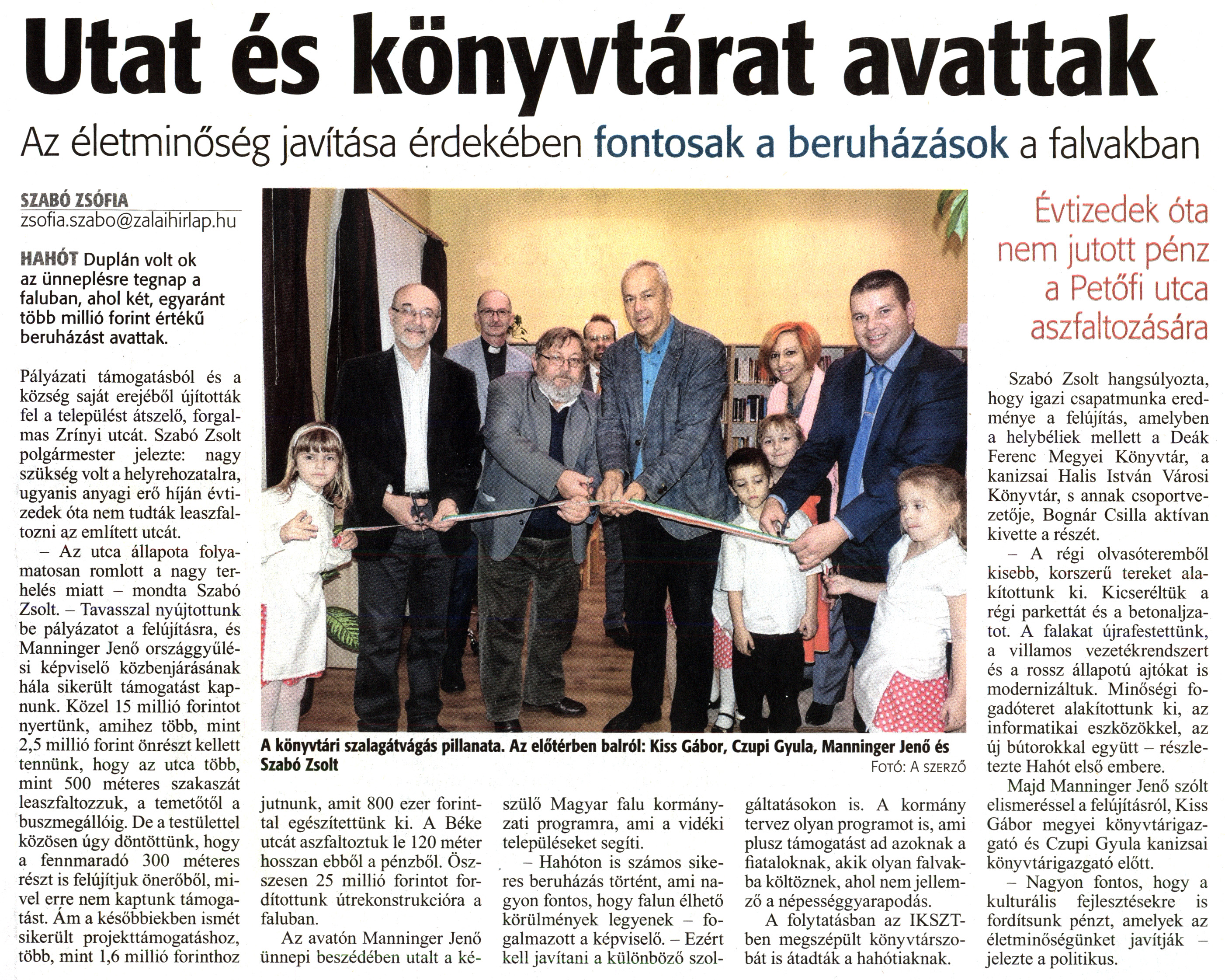 Nyilvános 1559 | 2602 | Zalai Hírlap 2018. november 24. 273. szám 3. oldal | Utat és könyvtárat avattak Az életminőség javítása érdekében fontosak a beruházások a falvakban A könyvtári szalagátvágás pillanata. Az előtérben balról: Kiss Gábor, Czupi Gyula, Manninger Jenő és Szabó Zsolt Fotó: A szerző SZABÓ ZSÓFIA_______ zsofia.szabo@zalaihirlap.hu HAHÓT Duplán volt ok az ünneplésre tegnap a faluban, ahol két, egyaránt több millió forint értékű beruházást avattak. Pályázati támogatásból és a község saját erejéből újították fel a települést átszelő, forgalmas Zrínyi utcát. Szabó Zsolt polgármester jelezte: nagy szükség volt a helyrehozatalra, ugyanis anyagi erő híján évtizedek óta nem tudták leaszfaltozni az említett utcát. - Az utca állapota folyamatosan romlott a nagy terhelés miatt - mondta Szabó Zsolt. - Tavasszal nyújtottunk be pályázatot a felújításra, és Manninger Jenő országgyűlési képviselő közbenjárásának hála sikerült támogatást kapnunk. Közel 15 millió forintot nyertünk, amihez több, mint 2,5 millió forint önrészt kellett tennünk, hogy az utca több, mint 500 méteres szakaszát leaszfaltozzuk, a temetőtől a buszmegállóig. De a testülettel közösen úgy döntöttünk, hogy a fennmaradó 300 méteres részt is felújítjuk önerőből, mivel erre nem kaptunk támogatást. Ám a későbbiekben ismét sikerült projekttámogatáshoz, több, mint 1,6 millió forinthoz jutnunk, amit 800 ezer forinttal egészítettünk ki. A Béke utcát aszfaltoztuk le 120 méter hosszan ebből a pénzből. Összesen 25 millió forintot fordítottunk útrekonstrukcióra a faluban. Az avatón Manninger Jenő ünnepi beszédében utalt a ké- szülő Magyar falu kormányzati programra, ami a vidéki településeket segíti. - Hahóton is számos sikeres beruházás történt, ami nagyon fontos, hogy falun élhető körülmények legyenek - fogalmazott a képviselő. - Ezért kell javítani a különböző szol- gáltatásokon is. A kormány tervez olyan programot is, ami plusz támogatást ad azoknak a fiataloknak, akik olyan falvakba költöznek, ahol nem jellemző a népességgyarapodás. A folytatásban az IKSZT-ben megszépült könyvtárszobát is átadták a hahótiaknak. Évtizedek óta nem jutott pénz a Petőfi utca aszfaltozására Szabó Zsolt hangsúlyozta, hogy igazi csapatmunka eredménye a felújítás, amelyben a helybéliek mellett a Deák Ferenc Megyei Könyvtár, a kanizsai Halis István Városi Könyvtár, s annak csoportvezetője, Bognár Csilla aktívan kivette a részét. - A régi olvasóteremből kisebb, korszerű tereket alakítottunk ki. Kicseréltük a régi parkettát és a betonaljzatot. A falakat újrafestettünk, a villamos vezetékrendszert és a rossz állapotú ajtókat is modernizáltuk. Minőségi fogadóteret alakítottunk ki, az informatikai eszközökkel, az új bútorokkal együtt - részletezte Hahót első embere. Majd Manninger Jenő szólt elismeréssel a felújításról, Kiss Gábor megyei könyvtárigazgató és Czupi Gyula kanizsai könyvtárigazgató előtt. - Nagyon fontos, hogy a kulturális fejlesztésekre is fordítsunk pénzt, amelyek az életminőségünket javítják - jelezte a politikus. |