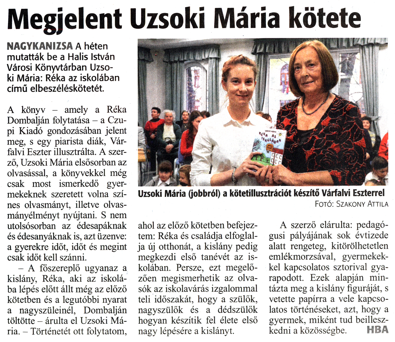 Nyilvános 1576 | 2761 | Zalai Hírlap 2018. december 20. 295. szám 6. oldal | Megjelent Uzsoki Mária kötete NAGYKANIZSA A héten mutatták be a Halis István Városi Könyvtárban Uzsoki Mária: Réka az iskolában című elbeszéléskötetét. A könyv - amely a Réka Dombalján folytatása - a Czupi Kiadó gondozásában jelent meg, s egy piarista diák, Várfalvi Eszter illusztrálta. A szerző, Uzsoki Mária elsősorban az olvasással, a könyvekkel még csak most ismerkedő gyermekeknek szeretett volna színes olvasmányt, illetve olvasmányélményt nyújtani. S nem utolsósorban az édesapáknak és édesanyáknak is, azt üzenve: a gyerekre időt, időt és megint csak időt kell szánni. - A főszereplő ugyanaz a kislány, Réka, aki az iskolába lépés előtt állt még az előző kötetben és a legutóbbi nyarat a nagyszüleinél, Dombalján töltötte - árulta el Uzsoki Mária. - Történetét ott folytatom, ahol az előző kötetben befejeztem: Réka és családja elfoglalja új otthonát, a kislány pedig megkezdi első tanévét az iskolában. Persze, ezt megelőzően megismerhetik az olvasók az iskolavárás izgalommal teli időszakát, hogy a szülők, nagyszülők és a dédszülők hogyan készítik fel élete első nagy lépésére a kislányt. A szerző elárulta: pedagógusi pályájának sok évtizede alatt rengeteg, kitörölhetetlen emlékmorzsával, gyermekekkel kapcsolatos sztorival gyarapodott. Ezek alapján mintázta meg a kislány figuráját, s vetette papírra a vele kapcsolatos történéseket, azt, hogy a gyermek, miként tud beilleszkedni a közösségbe. HBA Uzsoki Mária (jobbról) a kötetillusztrációt készítő Várfalvi Eszterrel Fotó: Szakony Attila |