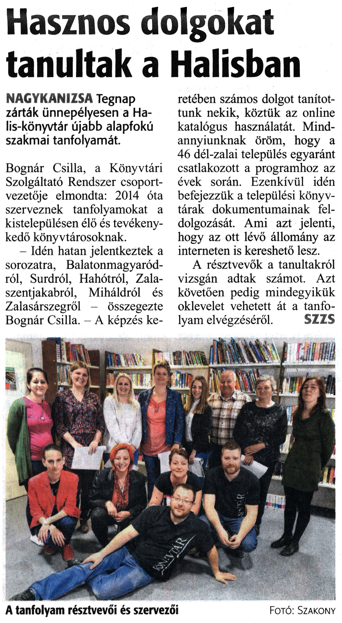 Nyilvános 1588 | 2865 | Zalai Hírlap 2019. április 10. 84. szám 3. oldal | Hasznos dolgokat tanultak a Halisban NAGYKANIZSA Tegnap zárták ünnepélyesen a Halis-könyvtár újabb alapfokú szakmai tanfolyamát. Bognár Csilla, a Könyvtári Szolgáltató Rendszer csoportvezetője elmondta: 2014 óta szerveznek tanfolyamokat a kistelepülésen élő és tevékenykedő könyvtárosoknak. - Idén hatan jelentkeztek a sorozatra, Balatonmagyaródról, Surdról, Hahótról, Zalaszentjakabról, Miháldról és Zalasárszegről - összegezte Bognár Csilla. - A képzés keretében számos dolgot tanítottunk nekik, köztük az online katalógus használatát. Mindannyiunknak öröm, hogy a 46 dél-zalai település egyaránt csatlakozott a programhoz az évek során. Ezenkívül idén befejezzük a települési könyvtárak dokumentumainak feldolgozását. Ami azt jelenti, hogy az ott lévő állomány az interneten is kereshető lesz. A résztvevők a tanultakról vizsgán adtak számot. Azt követően pedig mindegyikük oklevelet vehetett át a tanfolyam elvégzéséről. SZZS |