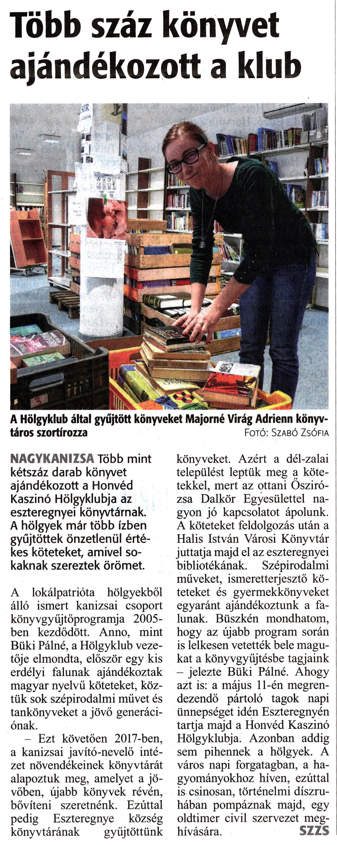 Nyilvános 1987 | 3199 | Zalai Hírlap 2019. április 25. 95. szám 16. oldal | Több száz könyvet ajándékozott a klub A Hölgyklub által gyűjtött könyveket Majorné Virág Adrienn könyvtáros szortírozza Fotó: Szabó Zsófia NAGYKANIZSA Több mint kétszáz darab könyvet ajándékozott a Honvéd Kaszinó Hölgyklubja az eszteregnyei könyvtárnak. A hölgyek már több ízben gyűjtöttek önzetlenül értékes köteteket, amivel sokaknak szereztek örömet. A lokálpatrióta hölgyekből álló ismert kanizsai csoport könyvgyűjtőprogramja 2005-ben kezdődött. Anno, mint Büki Pálné, a Hölgyklub vezetője elmondta, először egy kis erdélyi falunak ajándékoztak magyar nyelvű köteteket, köztük sok szépirodalmi müvet és tankönyveket a jövő generációnak. - Ezt követően 2017-ben, a kanizsai javító-nevelő intézet növendékeinek könyvtárát alapoztuk meg, amelyet a jövőben, újabb könyvek révén, bővíteni szeretnénk. Ezúttal pedig Eszteregnye község könyvtárának gyűjtöttünk könyveket. Azért a dél-zalai települést leptük meg a kötetekkel, mert az ottani Őszirózsa Dalkör Egyesülettel nagyon jó kapcsolatot ápolunk. A köteteket feldolgozás után a Halis István Városi Könyvtár juttatja majd el az eszteregnyei bibliotékának. Szépirodalmi műveket, ismeretterjesztő köteteket és gyermekkönyveket egyaránt ajándékoztunk a falunak. Büszkén mondhatom, hogy az újabb program során is lelkesen vetették bele magukat a könyvgyűjtésbe tagjaink - jelezte Büki Pálné. Ahogy azt is: a május 11-én megrendezendő pártoló tagok napi ünnepséget idén Eszteregnyén tartja majd a Honvéd Kaszinó Hölgyklubja. Azonban addig sem pihennek a hölgyek. A város napi forgatagban, a hagyományokhoz híven, ezúttal is csinosan, történelmi díszruhában pompáznak majd, egy oldtimer civil szervezet meghívására. SZZS |