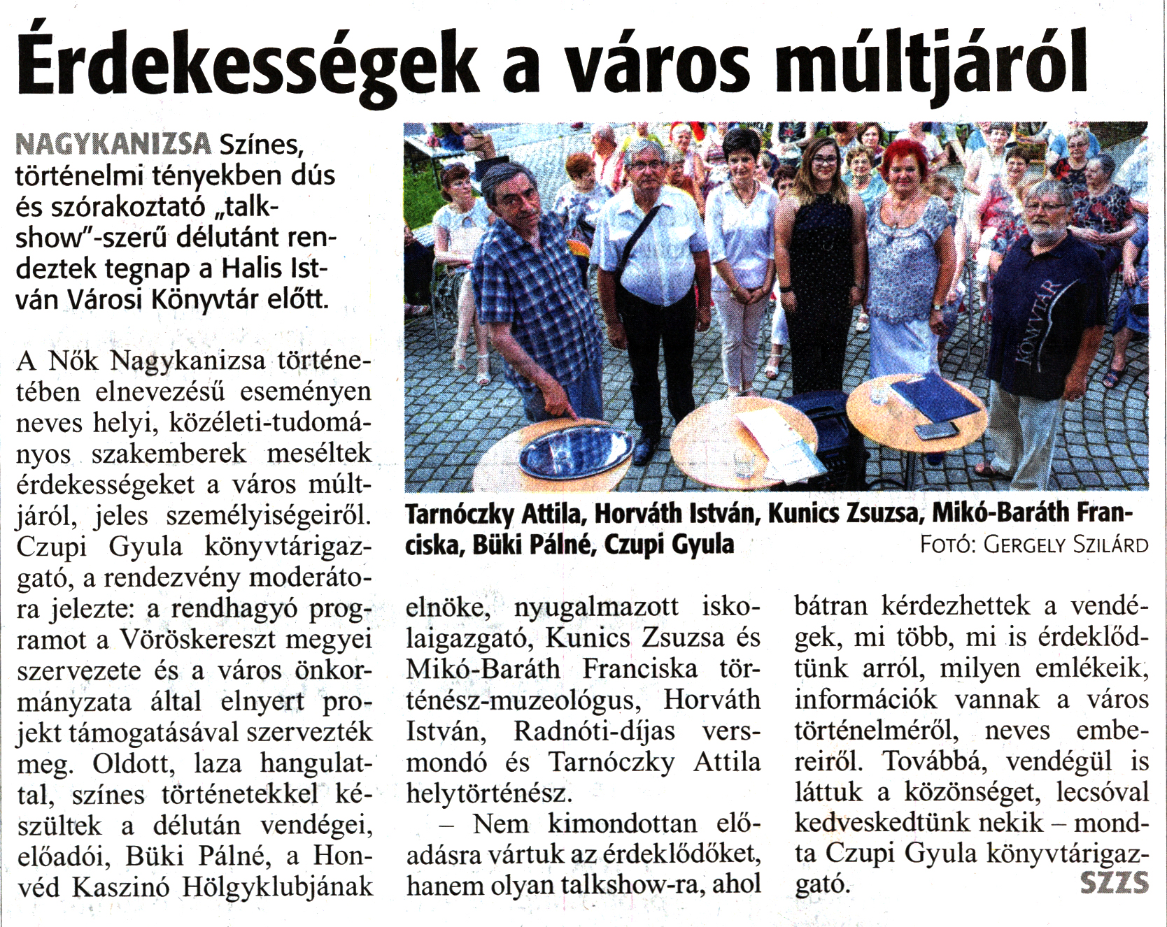 Nyilvános 1742 | 2480 | Zalai Hírlap 2020. július 30. 177. szám 16. oldal | Érdekességek a város múltjáról Tarnóczky Attila, Horváth István, Kunics Zsuzsa, Mikó-Baráth Franciska, Büki Pálné, Czupi Gyula Fotó: Gergely Szilárd NAGYKANIZSA Színes, történelmi tényekben dús és szórakoztató „talk-show"-szerű délutánt rendeztek tegnap a Halis István Városi Könyvtár előtt. A Nők Nagykanizsa történetében elnevezésű eseményen neves helyi, közéleti-tudományos szakemberek meséltek érdekességeket a város múltjáról, jeles személyiségeiről. Czupi Gyula könyvtárigazgató, a rendezvény moderátora jelezte: a rendhagyó programot a Vöröskereszt megyei szervezete és a város önkormányzata által elnyert projekt támogatásával szervezték meg. Oldott, laza hangulattal, színes történetekkel készültek a délután vendégei, előadói, Büki Pálné, a Honvéd Kaszinó Hölgyklubjának elnöke, nyugalmazott iskolaigazgató, Kunics Zsuzsa és Mikó-Baráth Franciska történész-muzeológus, Horváth István, Radnóti-díjas versmondó és Tarnóczky Attila helytörténész. - Nem kimondottan előadásra vártuk az érdeklődőket, hanem olyan talkshow-ra, ahol bátran kérdezhettek a vendégek, mi több, mi is érdeklődtünk arról, milyen emlékeik, információk vannak a város történelméről, neves embereiről. Továbbá, vendégül is láttuk a közönséget, lecsóval kedveskedtünk nekik - mondta Czupi Gyula könyvtárigazgató. szzs |