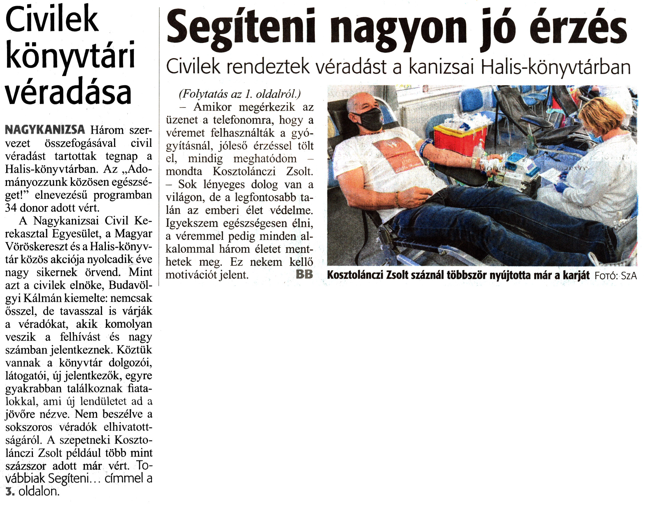 Nyilvános 1366 | 1992 | Zalai Hírlap 2020. október 10. 238. szám 1, 3. oldal | Civilek könyvtári véradása NAGYKANIZSA Három szervezet összefogásával civil véradást tartottak tegnap a Halis-könyvtárban. Az „Adományozzunk közösen egészséget!" elnevezésű programban 34 donor adott vért. A Nagykanizsai Civil Kerekasztal Egyesület, a Magyar Vöröskereszt és a Halis-könyvtár közös akciója nyolcadik éve nagy sikernek örvend. Mint azt a civilek elnöke, Budavölgyi Kálmán kiemelte: nemcsak ősszel, de tavasszal is várják a véradókat, akik komolyan veszik a felhívást és nagy számban jelentkeznek. Köztük vannak a könyvtár dolgozói, látogatói, új jelentkezők, egyre gyakrabban találkoznak fiatalokkal, ami új lendületet ad a jövőre nézve. Nem beszélve a sokszoros véradók elhivatottságáról. A szepetneki Kosztolánczi Zsolt például több mint százszor adott már vért. Továbbiak Segíteni... címmel a 3. oldalon. Segíteni nagyon jó érzés Civilek rendeztek véradást a kanizsai Halis-könyvtárban (Folytatás az 1. oldalról.) - Amikor megérkezik az üzenet a telefonomra, hogy a véremet felhasználták a gyógyításnál, jóleső érzéssel tölt el, mindig meghatódom - mondta Kosztolánczi Zsolt. - Sok lényeges dolog van a világon, de a legfontosabb talán az emberi élet védelme. Igyekszem egészségesen élni, a véremmel pedig minden alkalommal három életet menthetek meg. Ez nekem kellő motivációt jelent. BB Kosztolánczi Zsolt száznál többször nyújtotta már a karját Fotó: SzA |