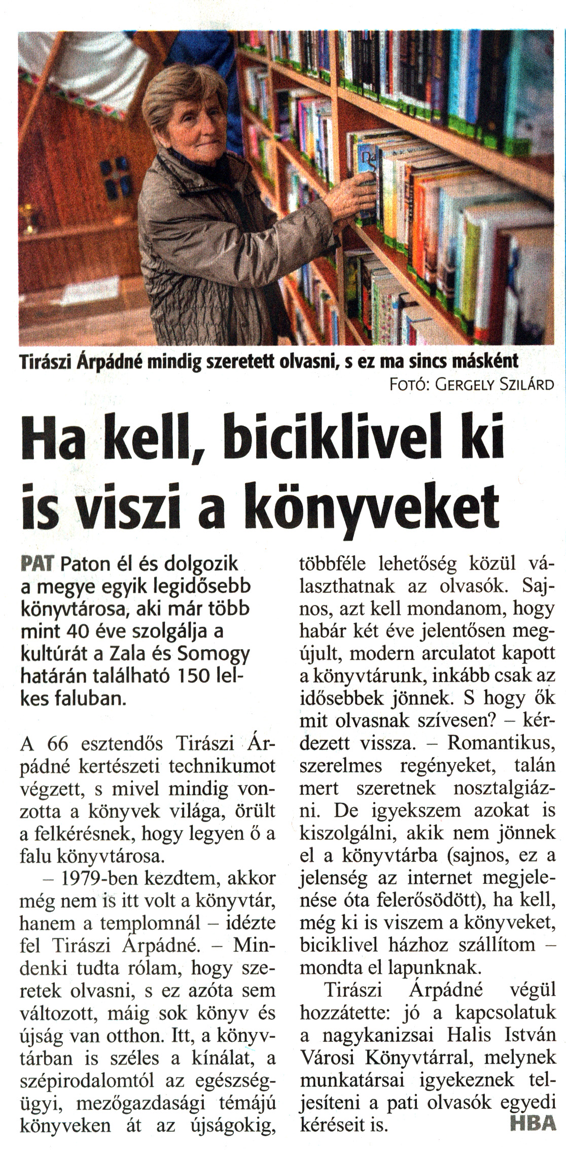 Nyilvános 1699 | 2131 | Zalai Hírlap 2020. december 28. 302. szám 5. oldal | Fotó: Gergely Szilárd Ha kell, biciklivel ki is viszi a könyveket Tirászi Árpádné mindig szeretett olvasni, s ez ma sincs másként PAT Paton él és dolgozik a megye egyik legidősebb könyvtárosa, aki már több mint 40 éve szolgálja a kultúrát a Zala és Somogy határán található 150 lelkes faluban. A 66 esztendős Tirászi Árpádné kertészeti technikumot végzett, s mivel mindig vonzotta a könyvek világa, örült a felkérésnek, hogy legyen ő a falu könyvtárosa. - 1979-ben kezdtem, akkor még nem is itt volt a könyvtár, hanem a templomnál - idézte fel Tirászi Arpádné. - Mindenki tudta rólam, hogy szeretek olvasni, s ez azóta sem változott, máig sok könyv és újság van otthon. Itt, a könyvtárban is széles a kínálat, a szépirodalomtól az egészségügyi, mezőgazdasági témájú könyveken át az újságokig, többféle lehetőség közül választhatnak az olvasók. Sajnos, azt kell mondanom, hogy habár két éve jelentősen megújult, modern arculatot kapott a könyvtárunk, inkább csak az idősebbek jönnek. S hogy ők mit olvasnak szívesen? - kérdezett vissza. - Romantikus, szerelmes regényeket, talán mert szeretnek nosztalgiázni. De igyekszem azokat is kiszolgálni, akik nem jönnek el a könyvtárba (sajnos, ez a jelenség az internet megjelenése óta felerősödött), ha kell, még ki is viszem a könyveket, biciklivel házhoz szállítom - mondta el lapunknak. Tirászi Arpádné végül hozzátette: jó a kapcsolatuk a nagykanizsai Halis István Városi Könyvtárral, melynek munkatársai igyekeznek teljesíteni a pati olvasók egyedi kéréseit is. HBA |