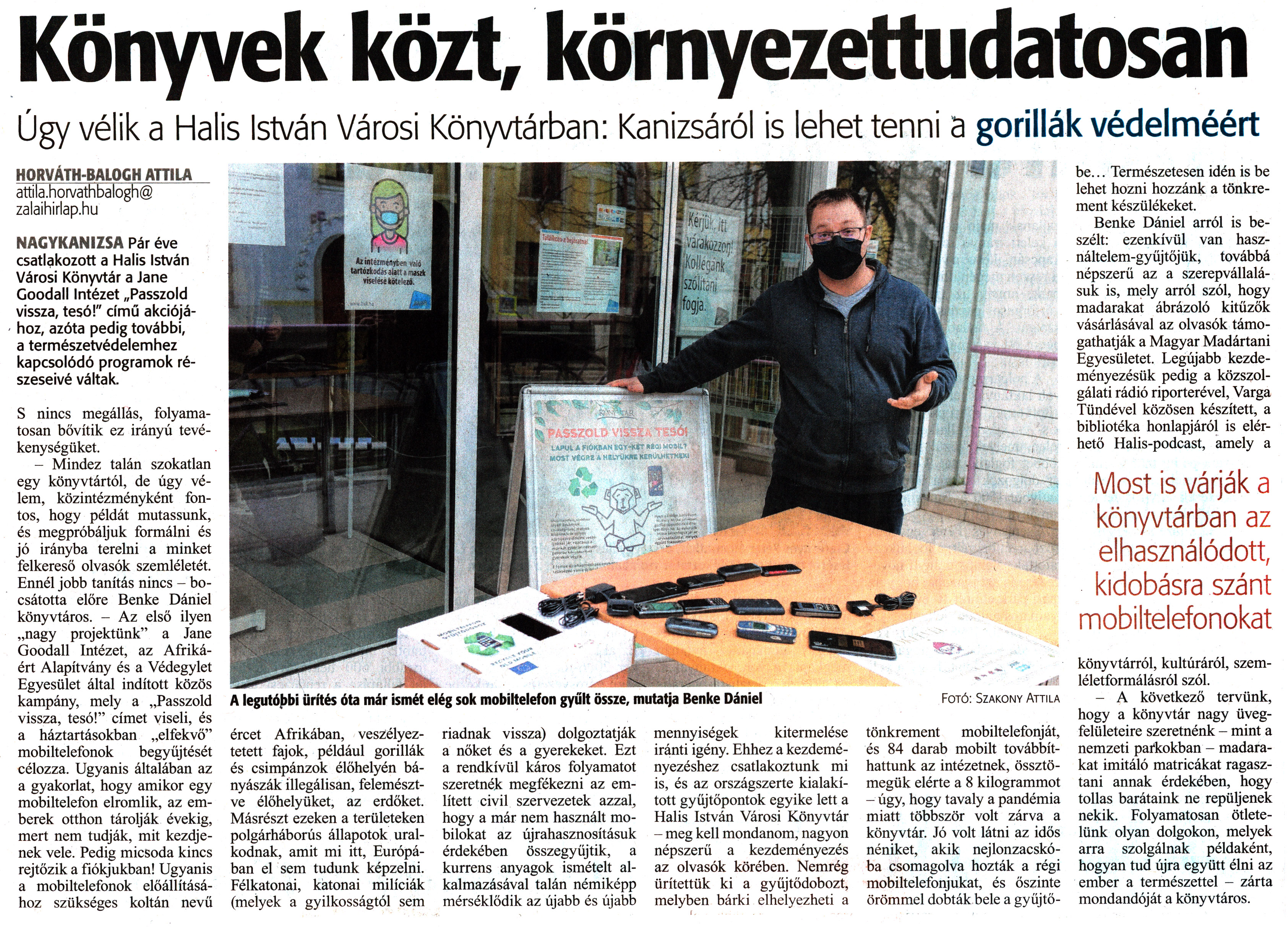 Nyilvános 1346 | 1820 | Zalai Hírlap 2021. február 8. 32. szám 4. oldal | Könyvek közt, környezettudatosan NAGYKANIZSA Pár éve csatlakozott a Halis István Városi Könyvtár a Jane Goodall Intézet „Passzold vissza, tesó!" című akciójához, azóta pedig további, a természetvédelemhez kapcsolódó programok részeseivé váltak. S nincs megállás, folyamatosan bővítik ez irányú tevékenységüket. - Mindez talán szokatlan egy könyvtártól, de úgy vélem, közintézményként fontos, hogy példát mutassunk, és megpróbáljuk formálni és jó irányba terelni a minket felkereső olvasók szemléletét. Ennél jobb tanítás nincs - bocsátotta előre Benke Dániel könyvtáros. - Az első ilyen „nagy projektünk" a Jane Goodall Intézet, az Afrikáért Alapítvány és a Védegylet Egyesület által indított közös kampány, mely a „Passzold vissza, tesó!" címet viseli, és a háztartásokban „elfekvő" mobiltelefonok begyűjtését célozza. Ugyanis általában az a gyakorlat, hogy amikor egy mobiltelefon elromlik, az emberek otthon tárolják évekig, mert nem tudják, mit kezdjenek vele. Pedig micsoda kincs rejtőzik a fiókjukban! Ugyanis a mobiltelefonok előállításához szükséges koltán nevű ércet Afrikában, veszélyeztetett fajok, például gorillák és csimpánzok élőhelyén bányásszák illegálisan, felemésztve élőhelyüket, az erdőket. Másrészt ezeken a területeken polgárháborús állapotok uralkodnak, amit mi itt, Európában el sem tudunk képzelni. Félkatonai, katonai milíciák (melyek a gyilkosságtól sem riadnak vissza) dolgoztatják a nőket és a gyerekeket. Ezt a rendkívül káros folyamatot szeretnék megfékezni az említett civil szervezetek azzal, hogy a már nem használt mobilokat az újrahasznosításuk érdekében összegyűjtik, a kurrens anyagok ismételt alkalmazásával talán némiképp mérséklődik az újabb és újabb mennyiségek kitermelése iránti igény. Ehhez a kezdeményezéshez csatlakoztunk mi is, és az országszerte kialakított gyűjtőpontok egyike lett a Halis István Városi Könyvtár - meg kell mondanom, nagyon népszerű a kezdeményezés az olvasók körében. Nemrég ürítettük ki a gyüjtődobozt, melyben bárki elhelyezheti a tönkrement mobiltelefonját, és 84 darab mobilt továbbíthattunk az intézetnek, össztömegük elérte a 8 kilogrammot - úgy, hogy tavaly a pandémia miatt többször volt zárva a könyvtár. Jó volt látni az idős néniket, akik nejlonzacskóba csomagolva hozták a régi mobiltelefonjukat, és őszinte örömmel dobták bele a gyűjtőbe... Természetesen idén is be lehet hozni hozzánk a tönkrement készülékeket. Benke Dániel arról is beszélt: ezenkívül van használtelem-gyüjtőjük, továbbá népszerű az a szerepvállalásuk is, mely arról szól, hogy madarakat ábrázoló kitűzők vásárlásával az olvasók támogathatják a Magyar Madártani Egyesületet. Legújabb kezdeményezésük pedig a közszolgálati rádió riporterével, Varga Tündével közösen készített, a bibliotéka honlapjáról is elérhető Halis-podcast, amely a könyvtárról, kultúráról, szemléletformálásról szól. - A következő tervünk, hogy a könyvtár nagy üvegfelületeire szeretnénk - mint a nemzeti parkokban - madarakat imitáló matricákat ragasztani annak érdekében, hogy tollas barátaink ne repüljenek nekik. Folyamatosan ötletelünk olyan dolgokon, melyek arra szolgálnak példaként, hogyan tud újra együtt élni az ember a természettel - zárta mondandóját a könyvtáros. HORVÁTH-BALOGH ATTILA attila.horvathbalogh@ zalaihirlap.hu |
