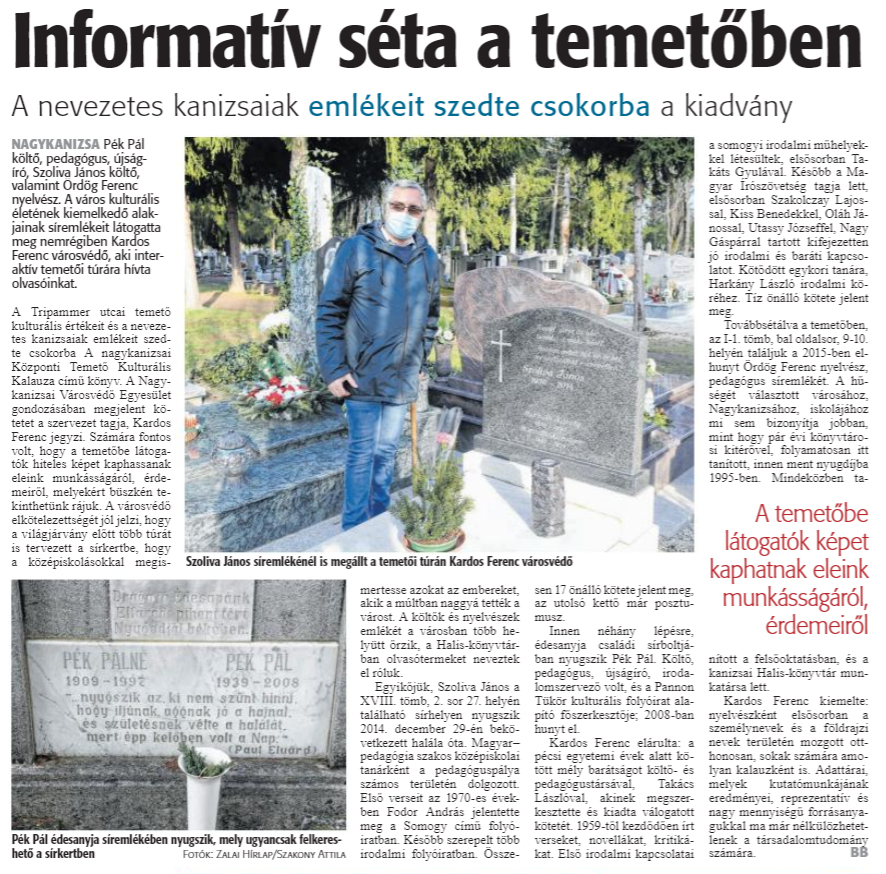 Nyilvános 1215 | 1718 | Informatív séta a temetőben | A nevezetes kanizsaiak emlékeit szedte csokorba a kiadvány NAGYKANIZSA Pék Pál költő, pedagógus, újságíró, Szoliva János költő, valamint Ördög Ferenc nyelvész. A város kulturális életének kiemelkedő alakjainak síremlékeit látogatta meg nemrégiben Kardos Ferenc városvédő, aki interaktív temetői túrára hívta olvasóinkat. A Tripammer utcai temető kulturális értékeit és a nevezetes kanizsaiak emlékeit szedte csokorba A nagykanizsai Központi Temető Kulturális Kalauza cimü könyv. A Nagykanizsai Városvédő Egyesület gondozásában megjelent kötetet a szervezet tagja, Kardos Ferenc jegyzi. Számára fontos volt, hogy a temetőbe látogatók hiteles képet kaphassanak eleink munkásságáról, érdemeiről, melyekért büszkén tekinthetünk rájuk. A városvédő elkötelezettségét jól jelzi, hogy a világjárvány előtt több túrát is tervezett a sírkertbe, hogy a középiskolásokkal megismertesse azokat az embereket, akik a múltban naggyá tették a várost. A költők és nyelvészek emlékét a városban több helyütt őrzik, a Halis-könyvtárban olvasótermeket neveztek el róluk. Egyikőjük, Szoliva János a XVIII. tömb, 2. sor 27. helyén található sírhelyen nyugszik 2014. december 29-én bekövetkezett halála óta. Magyarpedagógia szakos középiskolai tanárként a pedagóguspálya számos területén dolgozott. Első verseit az 1970-es években Fodor András jelentette meg a Somogy című folyóiratban. Később szerepelt több irodalmi folyóiratban. Összesen 17 önálló kötete jelent meg, az utolsó kettő már posztumusz. Innen néhány lépésre, édesanyja családi sírboltjában nyugszik Pék Pál. Költő, pedagógus, újságíró, irodalomszervező volt, és a Pannon Tükör kulturális folyóirat alapító főszerkesztője; 2008-ban hunyt el. Kardos Ferenc elárulta: a pécsi egyetemi évek alatt kötött mély barátságot költő- és pedagógustársával, Takács Lászlóval, akinek megszerkesztette és kiadta válogatott kötetét. 1959-tól kezdődően írt verseket, novellákat, kritikákat. Első irodalmi kapcsolatai a somogyi irodalmi műhelyekkel létesültek, elsősorban Takáts Gyulával. Később a Magyar Írószövetség tagja lett, elsősorban Szakolczay Lajossal, Kiss Benedekkel, Oláh Jánossal, Utassy Józseffel, Nagy Gáspárral tartott kifejezetten jó irodalmi és baráti kapcsolatot. Kötődött egykori tanára, Harkány László irodalmi köréhez. Tíz önálló kötete jelent meg. Továbbsétálva a temetőben, az I-1. tömb, bal oldalsor, 9-10. helyén találjuk a 2015-ben elhunyt Ördög Ferenc nyelvész, pedagógus síremlékét. A hűségét választott városához, Nagykanizsához, iskolájához mi sem bizonyítja jobban, mint hogy pár évi könyvtárosi kitérővel, folyamatosan itt tanított, innen ment nyugdíjba 1995-ben. Mindeközben tanított a felsőoktatásban, és a kanizsai Halis-könyvtár munkatársa lett. Kardos Ferenc kiemelte: nyelvészként elsősorban a személynevek és a földrajzi nevek területén mozgott otthonosan, sokak számára amolyan kalauzként is. Adattárai, melyek kutatómunkájának eredményei, reprezentatív és nagy mennyiségű forrásanyagukkal ma már nélkülözhetetlenek a társadalomtudomány számára. |