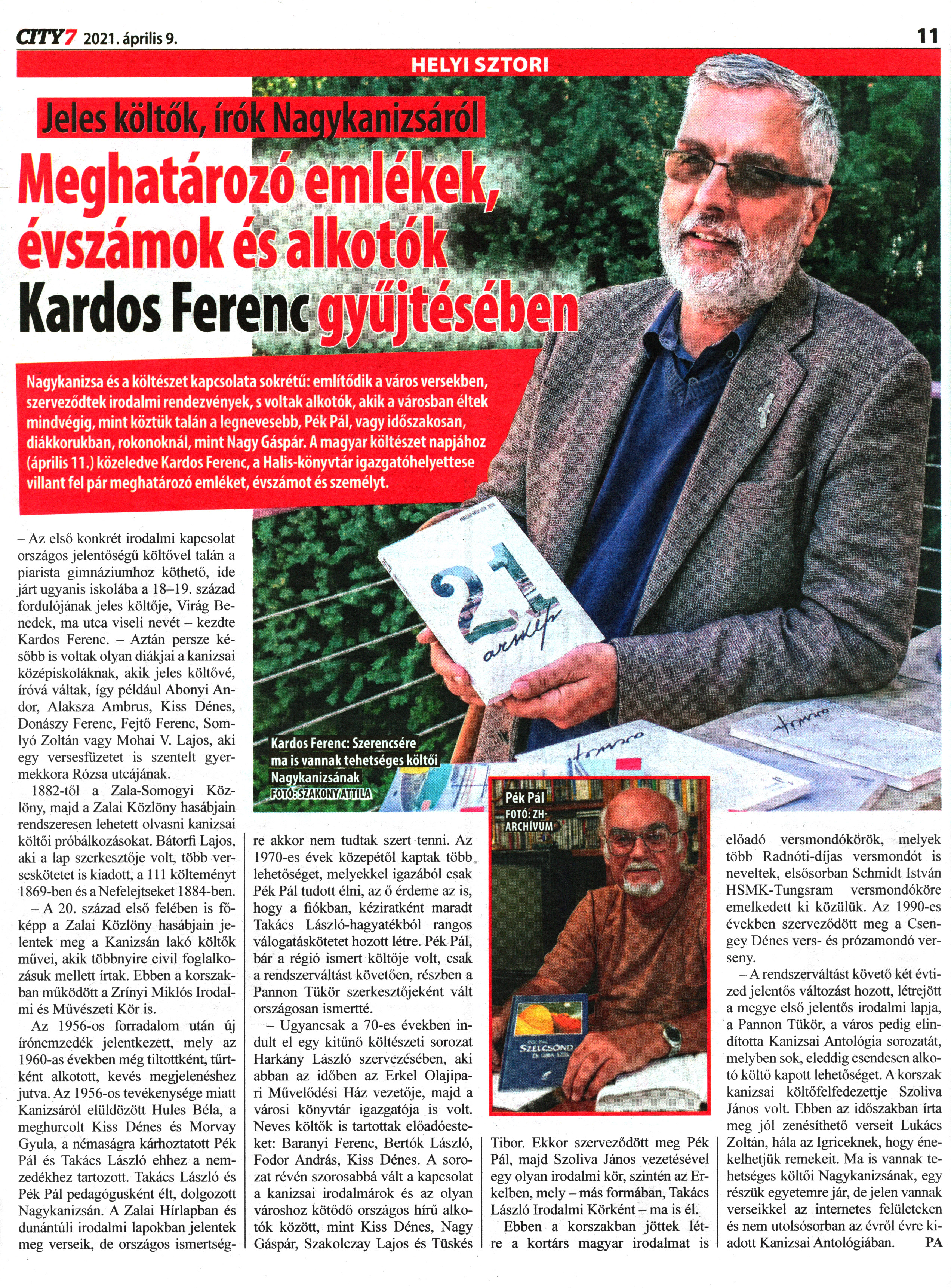 Nyilvános 1781 | 2847 | City7 2021. április 9. 3. szám 11. oldal | Jeles költők, írók Nagykanizsáról Meghatározó emlékek, évszámok és alkotók Kardos Ferenc gyűjtésében Nagykanizsa és a költészet kapcsolata sokrétű: említődik a város versekben, szerveződtek irodalmi rendezvények, s voltak alkotók, akik a városban éltek mindvégig, mint köztük talán a legnevesebb, Pék Pál, vagy időszakosan, diákkorukban, rokonoknál, mint Nagy Gáspár. A magyar költészet napjához (április 11.) közeledve Kardos Ferenc, a Halis-könyvtár igazgatóhelyettese villant fel pár meghatározó emléket, évszámot és személyt. - Az első konkrét irodalmi kapcsolat országos jelentőségű költővel talán a piarista gimnáziumhoz köthető, ide járt ugyanis iskolába a 18-19. század fordulójának jeles költője, Virág Benedek, ma utca viseli nevét - kezdte Kardos Ferenc. - Aztán persze később is voltak olyan diákjai a kanizsai középiskoláknak, akik jeles költővé, íróvá váltak, így például Abonyi Andor, Alaksza Ambrus, Kiss Dénes, Donászy Ferenc, Fejtő Ferenc, Somlyó Zoltán vagy Mohai V. Lajos, aki egy versesfuzetet is szentelt gyermekkora Rózsa utcájának. 1882-től a Zala-Somogyi Közlöny, majd a Zalai Közlöny hasábjain rendszeresen lehetett olvasni kanizsai költői próbálkozásokat. Bátorfi Lajos, aki a lap szerkesztője volt, több verseskötetet is kiadott, a 111 költeményt 1869-ben és a Nefelejtseket 1884-ben. - A 20. század első felében is főképp a Zalai Közlöny hasábjain jelentek meg a Kanizsán lakó költők művei, akik többnyire civil foglalkozásuk mellett írtak. Ebben a korszakban működött a Zrínyi Miklós Irodalmi és Művészeti Kör is. Az 1956-os forradalom után új írónemzedék jelentkezett, mely az 1960-as években még tiltottként, törtként alkotott, kevés megjelenéshez jutva. Az 1956-os tevékenysége miatt Kanizsáról elüldözött Hules Béla, a meghurcolt Kiss Dénes és Morvay Gyula, a némaságra kárhoztatott Pék Pál és Takács László ehhez a nemzedékhez tartozott. Takács László és Pék Pál pedagógusként élt, dolgozott Nagykanizsán. A Zalai Hírlapban és dunántúli irodalmi lapokban jelentek meg verseik, de országos ismertségre akkor nem tudtak szert tenni. Az 1970-es évek közepétől kaptak több lehetőséget, melyekkel igazából csak Pék Pál tudott élni, az ő érdeme az is, hogy a fiókban, kéziratként maradt Takács László-hagyatékból rangos válogatáskötetet hozott létre. Pék Pál, bár a régió ismert költője volt, csak a rendszerváltást követően, részben a Pannon Tükör szerkesztőjeként vált országosan ismertté. - Ugyancsak a 70-es években indult el egy kitűnő költészeti sorozat Harkány László szervezésében, aki abban az időben az Erkel Olajipari Művelődési Ház vezetője, majd a városi könyvtár igazgatója is volt. Neves költők is tartottak előadóesteket: Bárányi Ferenc, Bertók László, Fodor András, Kiss Dénes. A sorozat révén szorosabbá vált a kapcsolat a kanizsai irodalmárok és az olyan városhoz kötődő országos hírű alkotók között, mint Kiss Dénes, Nagy Gáspár, Szakolczay Lajos és Tüskés Tibor. Ekkor szerveződött meg Pék Pál, majd Szoliva János vezetésével egy olyan irodalmi kör, szintén az Erkelben, mely - más formában, Takács László Irodalmi Körként - ma is él. Ebben a korszakban jöttek létre a kortárs magyar irodalmat is előadó versmondókörök, melyek több Radnóti-díjas versmondót is neveltek, elsősorban Schmidt István HSMK-Tungsram versmondóköre emelkedett ki közülük. Az 1990-es években szerveződött meg a Csen-gey Dénes vers- és prózamondó verseny. - A rendszerváltást követő két évtized jelentős változást hozott, létrejött a megye első jelentős irodalmi lapja, a Pannon Tükör, a város pedig elindította Kanizsai Antológia sorozatát, melyben sok, eleddig csendesen alkotó költő kapott lehetőséget. A korszak kanizsai költőfelfedezettje Szoliva János volt. Ebben az időszakban írta meg jól zenésíthető verseit Lukács Zoltán, hála az Igriceknek, hogy énekelhetjük remekeit. Ma is vannak tehetséges költői Nagykanizsának, egy részük egyetemre jár, de jelen vannak verseikkel az internetes felületeken és nem utolsósorban az évről évre kiadott Kanizsai Antológiában. PA |