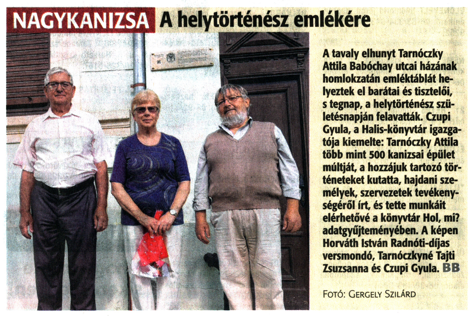 Nyilvános 1280 | 2116 | Zalai Hírlap 2021. június 12. 134. szám 3. oldal | A tavaly elhunyt Tarnóczky Attila Babóchay utcai házának homlokzatán emléktáblát helyeztek el barátai és tisztelői, s tegnap, a helytörténész születésnapján felavatták. Czupi Gyula, a Halis-könyvtár igazgatója kiemelte: Tarnóczky Attila több mint 500 kanizsai épület múltját, a hozzájuk tartozó történeteket kutatta, hajdani személyek, szervezetek tevékenységéről írt és tette munkáit elérhetővé a könyvtár Hol, mi? adatgyűjteményében. A képen Horváth István Radnóti-díjas versmondó, Tarnóczkyné Tajti Zsuzsanna és Czupi Gyula. BB Fotó: Gergely Szilárd |