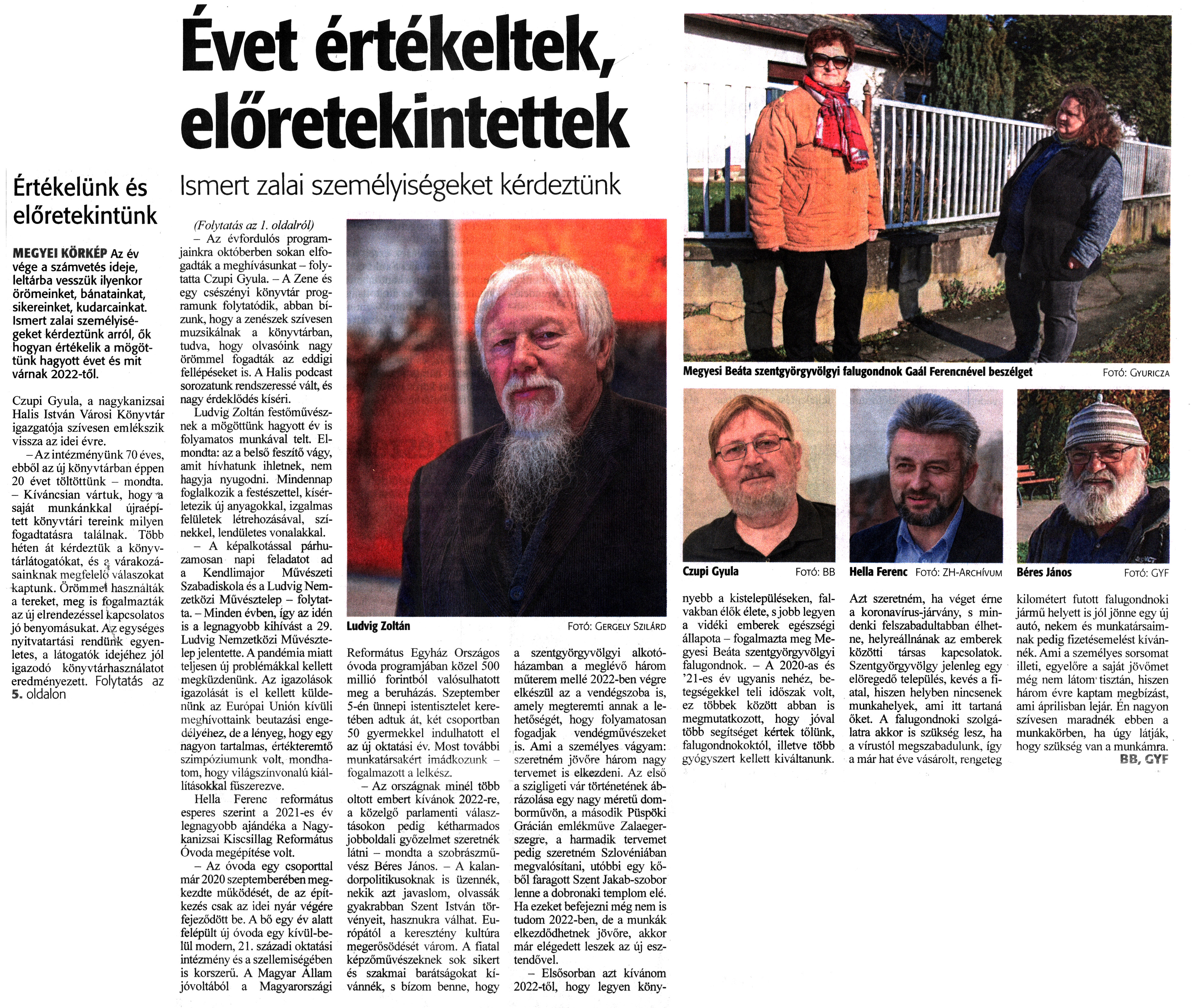 Nyilvános 1262 | 1858 | Zalai Hírlap 2021. december 31. 303. szám 1, 5. oldal | Évet értékeltek, előretekintettek Ismert zalai személyiségeket kérdeztünk Értékelünk és előretekintünk MEGYEI KÖRKÉP Az év vége a számvetés ideje, leltárba vesszük ilyenkor örömeinket, bánatainkat, sikereinket, kudarcainkat. Ismert zalai személyiségeket kérdeztünk arról, ők hogyan értékelik a mögöttünk hagyott évet és mit várnak 2022-től. Czupi Gyula, a nagykanizsai Halis István Városi Könyvtár igazgatója szívesen emlékszik vissza az idei évre. - Az intézményünk 70 éves, ebből az új könyvtárban éppen 20 évet töltöttünk - mondta. - Kíváncsian vártuk, hogy a saját munkánkkal újraépített könyvtári tereink milyen fogadtatásra találnak. Több héten át kérdeztük a könyvtárlátogatókat, és a várakozásainknak megfelelő válaszokat kaptunk. Örömmel használták a tereket, meg is fogalmazták az új elrendezéssel kapcsolatos jó benyomásukat. Az egységes nyitvatartási rendünk egyenletes, a látogatók idejéhez jól igazodó könyvtárhasználatot eredményezett. Folytatás az 5. oldalon (Folytatás az 1. oldalról) - Az évfordulós programjainkra októberben sokan elfogadták a meghívásunkat - folytatta Czupi Gyula. - A Zene és egy csészényi könyvtár programunk folytatódik, abban bízunk, hogy a zenészek szívesen muzsikálnak a könyvtárban, tudva, hogy olvasóink nagy örömmel fogadták az eddigi fellépéseket is. A Halis podcast sorozatunk rendszeressé vált, és nagy érdeklődés kíséri. Ludvig Zoltán festőművésznek a mögöttünk hagyott év is folyamatos munkával telt. Elmondta: az a belső feszítő vágy, amit hívhatunk ihletnek, nem hagyja nyugodni. Mindennap foglalkozik a festészettel, kísérletezik új anyagokkal, izgalmas felületek létrehozásával, színekkel, lendületes vonalakkal. - A képalkotással párhuzamosan napi feladatot ad a Kendlimajor Művészeti Szabadiskola és a Ludvig Nemzetközi Művésztelep - folytatta. - Minden évben, így az idén is a legnagyobb kihívást a 29. Ludvig Nemzetközi Művésztelepjelentette. A pandémia miatt teljesen új problémákkal kellett megküzdenünk. Az igazolások igazolását is el kellett küldenünk az Európai Unión kívüli meghívottaink beutazási engedélyéhez, de a lényeg, hogy egy nagyon tartalmas, értékteremtő szimpóziumunk volt, mondhatom, hogy világszínvonalú kiállításokkal fűszerezve. Hella Ferenc református esperes szerint a 202l-es év legnagyobb ajándéka a Nagykanizsai Kiscsillag Református Óvoda megépítése volt. - Az óvoda egy csoporttal már 2020 szeptemberében megkezdte működését, de az építkezés csak az idei nyár végére fejeződött be. A bő egy év alatt felépült új óvoda egy kívül-belül modern, 21. századi oktatási intézmény és a szellemiségében is korszerű. A Magyar Állam jóvoltából a Magyarországi Református Egyház Országos óvoda programjában közel 500 millió forintból valósulhatott meg a beruházás. Szeptember 5-én ünnepi istentisztelet keretében adtuk át, két csoportban 50 gyermekkel indulhatott el az új oktatási év. Most további munkatársakért imádkozunk - fogalmazott a lelkész. - Az országnak minél több oltott embert kívánok 2022-re, a közelgő parlamenti választásokon pedig kétharmados jobboldali győzelmet szeretnék látni - mondta a szobrászművész Béres János. - A kalandorpolitikusoknak is üzennék, nekik azt javaslom, olvassák gyakrabban Szent István törvényeit, hasznukra válhat. Európától a keresztény kultúra megerősödését várom. A fiatal képzőművészeknek sok sikert és szakmai barátságokat kívánnék, s bízom benne, hogy a szentgyörgyvölgyi alkotóházamban a meglévő három műterem mellé 2022-ben végre elkészül az a vendégszoba is, amely megteremti annak a lehetőségét, hogy folyamatosan fogadjak vendégművészeket is. Ami a személyes vágyam: szeretném jövőre három nagy tervemet is elkezdeni. Az első a szigligeti vár történetének ábrázolása egy nagy méretű domborművön, a második Püspöki Grácián emlékműve Zalaegerszegre, a harmadik tervemet pedig szeretném Szlovéniában megvalósítani, utóbbi egy kőből faragott Szent Jakab-szobor lenne a dobronaki templom elé. Ha ezeket befejezni még nem is tudom 2022-ben, de a munkák elkezdődhetnek jövőre, akkor már elégedett leszek az új esztendővel. - Elsősorban azt kívánom 2022-től, hogy legyen könnyebb a kistelepüléseken, falvakban élők élete, s jobb legyen a vidéki emberek egészségi állapota - fogalmazta meg Megyesi Beáta szentgyörgyvölgyi falugondnok. - A 2020-as és ''''21-es év ugyanis nehéz, betegségekkel teli időszak volt, ez többek között abban is megmutatkozott, hogy jóval több segítséget kértek tőlünk, falugondnokoktól, illetve több gyógyszert kellett kiváltanunk. Azt szeretném, ha véget érne a koronavírus-járvány, s mindenki felszabadultabban élhetne, helyreállnának az emberek közötti társas kapcsolatok. Szentgyörgyvölgy jelenleg egy elöregedő település, kevés a fiatal, hiszen helyben nincsenek munkahelyek ami itt tartaná őket. A falugondnoki szolgálatra akkor is szükség lesz, ha a vírustól megszabadulunk, így a már hat éve vásárolt, rengeteg kilométert futott falugondnoki jármű helyett is jól jönne egy új autó, nekem és munkatársaimnak pedig fizetésemelést kívánnék. Ami a személyes sorsomat illeti, egyelőre a saját jövőmet még nem látom tisztán, hiszen három évre kaptam megbízást, ami áprilisban lejár. Én nagyon szívesen maradnék ebben a munkakörben, ha úgy látják, hogy szükség van a munkámra. BB, GYF |