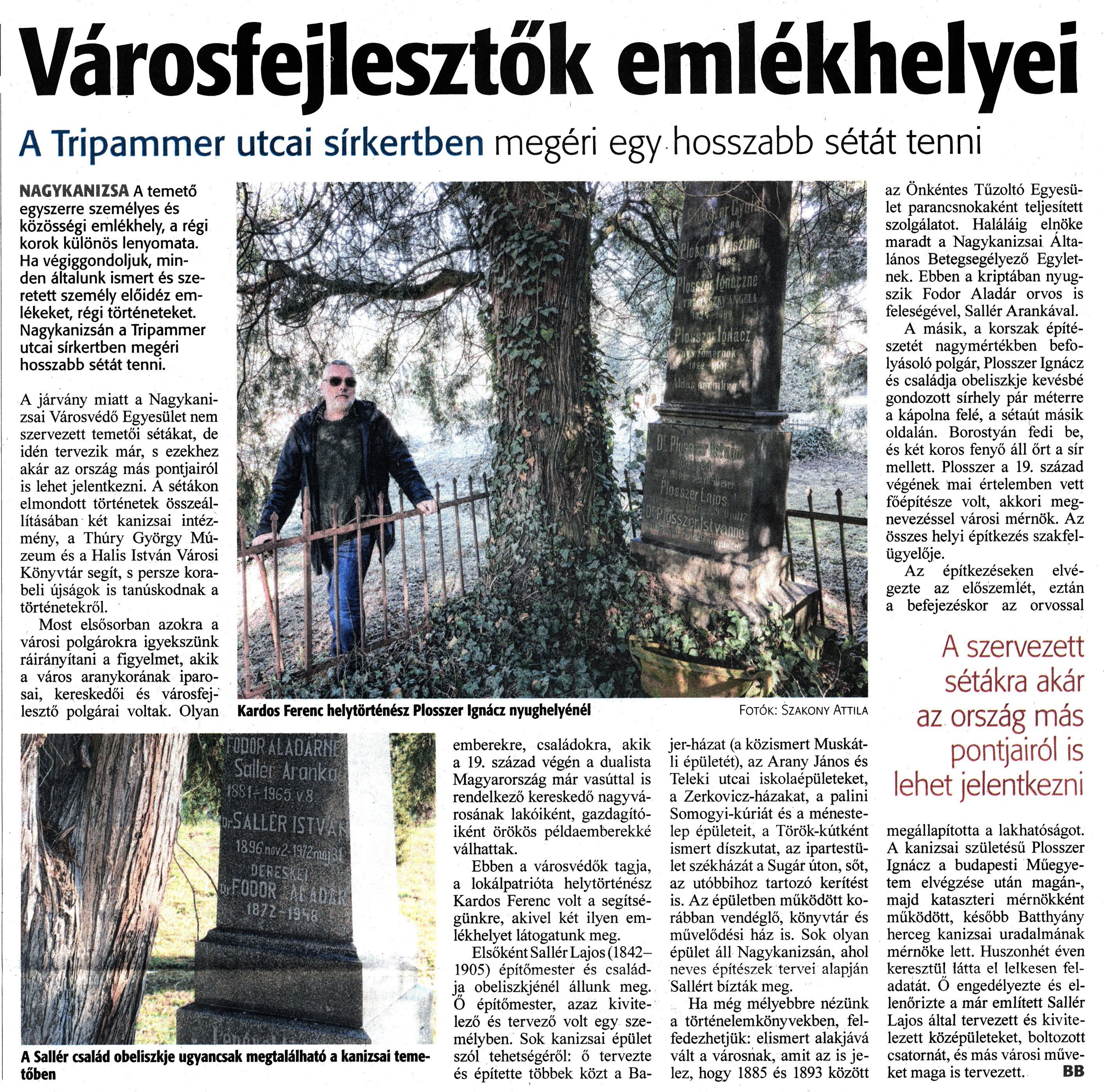 Nyilvános 1218 | 1622 | Zalai Hírlap 2022. február 16. 39. szám 10. oldal | Városfejlesztők emlékhelyei A Tripammer utcai sírkertben megéri egy hosszabb sétát tenni NAGYKANIZSA A temető egyszerre személyes és közösségi emlékhely, a régi korok különös lenyomata. Ha végiggondoljuk, minden általunk ismert és szeretett személy előidéz emlékeket, régi történeteket. Nagykanizsán a Tripammer utcai sírkertben megéri hosszabb sétát tenni. A járvány miatt a Nagykanizsai Városvédő Egyesület nem szervezett temetői sétákat, de idén tervezik már, s ezekhez akár az ország más pontjairól is lehet jelentkezni. A sétákon elmondott történetek összeállításában két kanizsai intézmény, a Thúry György Múzeum és a Halis István Városi Könyvtár segít, s persze korabeli újságok is tanúskodnak a történetekről. Most elsősorban azokra a városi polgárokra igyekszünk ráirányítani a figyelmet, akik a város aranykorának iparosai, kereskedői és városfejlesztő polgárai voltak. Olyan emberekre, családokra, akik a 19. század végén a dualista Magyarország már vasúttal is rendelkező kereskedő nagyvárosának lakóiként, gazdagító-iként örökös példaemberekké válhattak. Ebben a városvédők tagja, a lokálpatrióta helytörténész Kardos Ferenc volt a segítségünkre, akivel két ilyen emlékhelyet látogatunk meg. Elsőként Sallér Lajos (1842-1905) építőmester és családja obeliszkjénél állunk meg. Ő építőmester, azaz kivitelező és tervező volt egy személyben. Sok kanizsai épület szól tehetségéről: ő tervezte és építette többek közt a Bajer-házat (a közismert Muskátli épületét), az Arany János és Teleki utcai iskolaépületeket, a Zerkovicz-házakat, a palini Somogyi-kúriát és a ménestelep épületeit, a Török-kútként ismert díszkutat, az ipartestület székházát a Sugár úton, sőt, az utóbbihoz tartozó kerítést is. Az épületben működött korábban vendéglő, könyvtár és művelődési ház is. Sok olyan épület áll Nagykanizsán, ahol neves építészek tervei alapján Sallért bízták meg. Ha még mélyebbre nézünk a történelemkönyvekben, felfedezhetjük: elismert alakjává vált a városnak, amit az is jelez, hogy 1885 és 1893 között az Önkéntes Tűzoltó Egyesület parancsnokaként teljesített szolgálatot. Haláláig elnöke maradt a Nagykanizsai Általános Betegsegélyező Egyletnek. Ebben a kriptában nyugszik Fodor Aladár orvos is feleségével, Sallér Arankával. A másik, a korszak építészetét nagymértékben befolyásoló polgár, Plosszer Ignácz és családja obeliszkje kevésbé gondozott sírhely pár méterre a kápolna felé, a sétaút másik oldalán. Borostyán fedi be, és két koros fenyő áll őrt a sír mellett. Plosszer a 19. század végének mai értelemben vett főépítésze volt, akkori megnevezéssel városi mérnök. Az összes helyi építkezés szakfelügyelője. Az építkezéseken elvégezte az előszemlét, eztán a befejezéskor az orvossal megállapította a lakhatóságot. A kanizsai születésű Plosszer Ignácz a budapesti Műegyetem elvégzése után magán-, majd kataszteri mérnökként működött, később Batthyány herceg kanizsai uradalmának mérnöke lett. Huszonhét éven keresztül látta el lelkesen feladatát. Ő engedélyezte és ellenőrizte a már említett Sallér Lajos által tervezett és kivitelezett középületeket, boltozott csatornát, és más városi műveket maga is tervezett. BB A Sallér család obeliszkje ugyancsak megtalálható a kanizsai temetőben Kardos Ferenc helytörténész Plosszer Ignácz nyughelyénél Fotók: Szakony Attila |