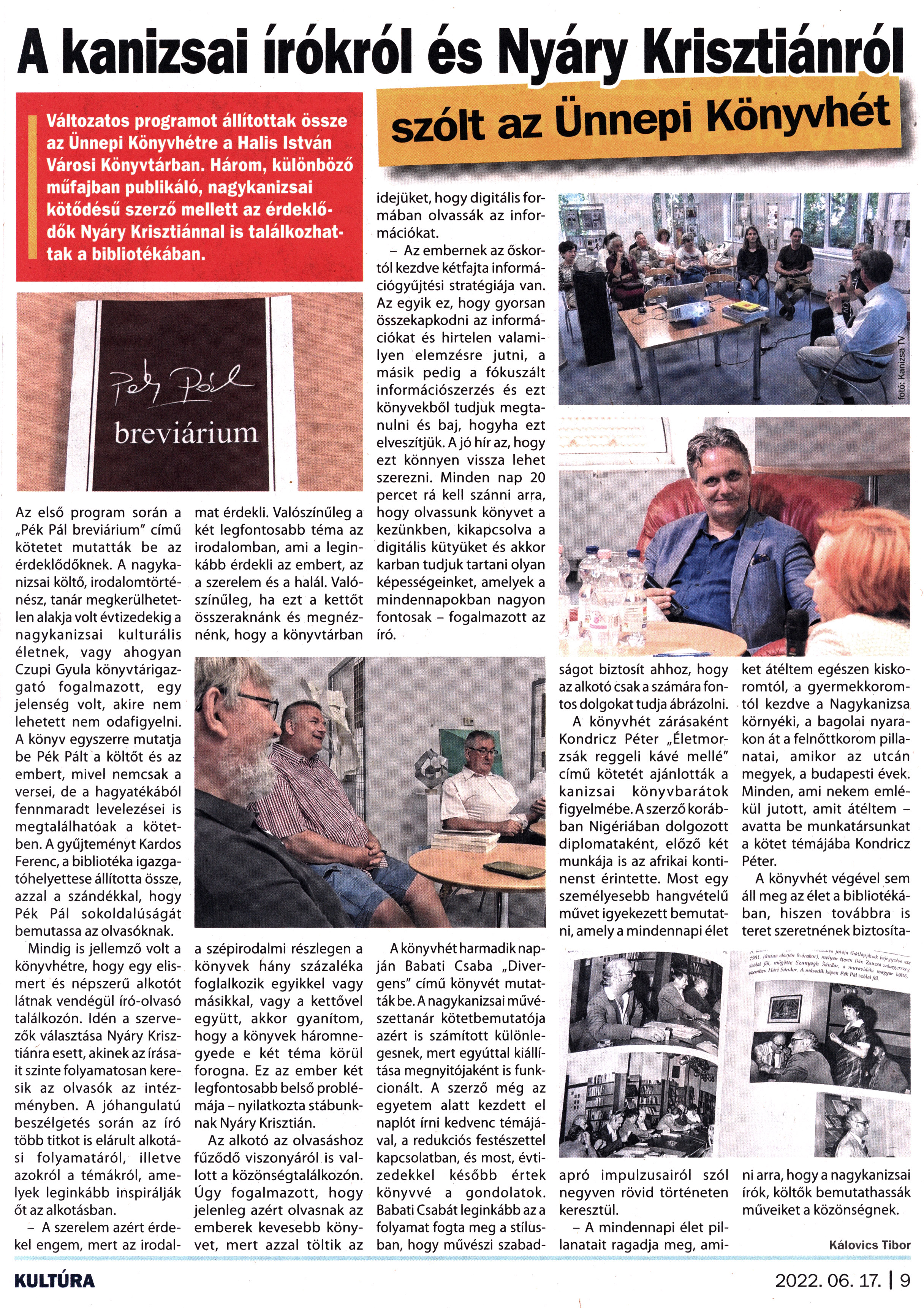 Nyilvános 1312 | 2259 | Kanizsa 2022. június 17. 12. szám 9. oldal | A kanizsai írókról és Nyáry Krisztiánról szólt az Ünnepi Könyvhét Változatos programot állítottak össze az Ünnepi Könyvhétre a Halis István Városi Könyvtárban. Három, különböző műfajban publikáló, nagykanizsai kötődésű szerző mellett az érdeklődők Nyáry Krisztiánnal is találkozhattak a bibliotékában. Az első program során a „Pék Pál breviárium" című kötetet mutatták be az érdeklődőknek. A nagykanizsai költő, irodalomtörténész, tanár megkerülhetetlen alakja volt évtizedekig a nagykanizsai kulturális életnek, vagy ahogyan Czupi Gyula könyvtárigazgató fogalmazott, egy jelenség volt, akire nem lehetett nem odafigyelni. A könyv egyszerre mutatja be Pék Pált a költőt és az embert, mivel nemcsak a versei, de a hagyatékából fennmaradt levelezései is megtalálhatóak a kötetben. A gyűjteményt Kardos Ferenc, a bibliotéka igazgatóhelyettese állította össze, azzal a szándékkal, hogy Pék Pál sokoldalúságát bemutassa az olvasóknak. Mindig is jellemző volt a könyvhétre, hogy egy elismert és népszerű alkotót látnak vendégül író-olvasó találkozón. Idén a szervezők választása Nyáry Krisztiánra esett, akinek az írásait szinte folyamatosan keresik az olvasók az intézményben. A jóhangulatú beszélgetés során az író több titkot is elárult alkotási folyamatáról, illetve azokról a témákról, amelyek leginkább inspirálják őt az alkotásban. - A szerelem azért érdekel engem, mert az irodalmat érdekli. Valószínűleg a két legfontosabb téma az irodalomban, ami a leginkább érdekli az embert, az a szerelem és a halál. Valószínűleg, ha ezt a kettőt összeraknánk és megnéznénk, hogy a könyvtárban a szépirodalmi részlegen a könyvek hány százaléka foglalkozik egyikkel vagy másikkal, vagy a kettővel együtt, akkor gyanítom, hogy a könyvek háromnegyede e két téma körül forogna. Ez az ember két legfontosabb belső problémája - nyilatkozta stábunknak Nyáry Krisztián. Az alkotó az olvasáshoz fűződő viszonyáról is vallott a közönségtalálkozón. Úgy fogalmazott, hogy jelenleg azért olvasnak az emberek kevesebb könyvet, mert azzal töltik az idejüket, hogy digitális formában olvassák az információkat. - Az embernek az őskortól kezdve kétfajta információgyűjtési stratégiája van. Az egyik ez, hogy gyorsan összekapkodni az információkat és hirtelen valamilyen elemzésre jutni, a másik pedig a fókuszált információszerzés és ezt könyvekből tudjuk megtanulni és baj, hogyha ezt elveszítjük. A jó hír az, hogy ezt könnyen vissza lehet szerezni. Minden nap 20 percet rá kell szánni arra, hogy olvassunk könyvet a kezünkben, kikapcsolva a digitális kütyüket és akkor karban tudjuk tartani olyan képességeinket, amelyek a mindennapokban nagyon fontosak - fogalmazott az író. A könyvhét harmadik napján Babati Csaba „Divergens" című könyvét mutatták be. A nagykanizsai művészettanár kötetbemutatója azért is számított különlegesnek, mert egyúttal kiállítása megnyitójaként is funkcionált. A szerző még az egyetem alatt kezdett el naplót írni kedvenc témájával, a redukciós festészettel kapcsolatban, és most, évtizedekkel később értek könyvvé a gondolatok. Babati Csabát leginkább az a folyamat fogta meg a stílusban, hogy művészi szabad- ságot biztosít ahhoz, hogy az alkotó csak a számára fontos dolgokat tudja ábrázolni. A könyvhét zárásaként Kondricz Péter „Életmorzsák reggeli kávé mellé" című kötetét ajánlották a kanizsai könyvbarátok figyelmébe. A szerző korábban Nigériában dolgozott diplomataként, előző két munkája is az afrikai kontinenst érintette. Most egy személyesebb hangvételű művet igyekezett bemutatni,amelya mindennapi élet apró impulzusairól szól negyven rövid történeten keresztül. - A mindennapi élet pillanatait ragadja meg, amiket átéltem egészen kiskoromtól, a gyermekkoromtól kezdve a Nagykanizsa környéki, a bagolai nyarakon át a felnőttkorom pillanatai, amikor az utcán megyek, a budapesti évek. Minden, ami nekem emlékül jutott, amit átéltem -avatta be munkatársunkat a kötet témájába Kondricz Péter. A könyvhét végével sem áll meg az élet a bibliotékában, hiszen továbbra is teret szeretnének biztosítani arra, hogy a nagykanizsai írók, költők bemutathassák műveiket a közönségnek. Kálovics Tibor KULTÚRA 2022. 06. 17. | 9 |