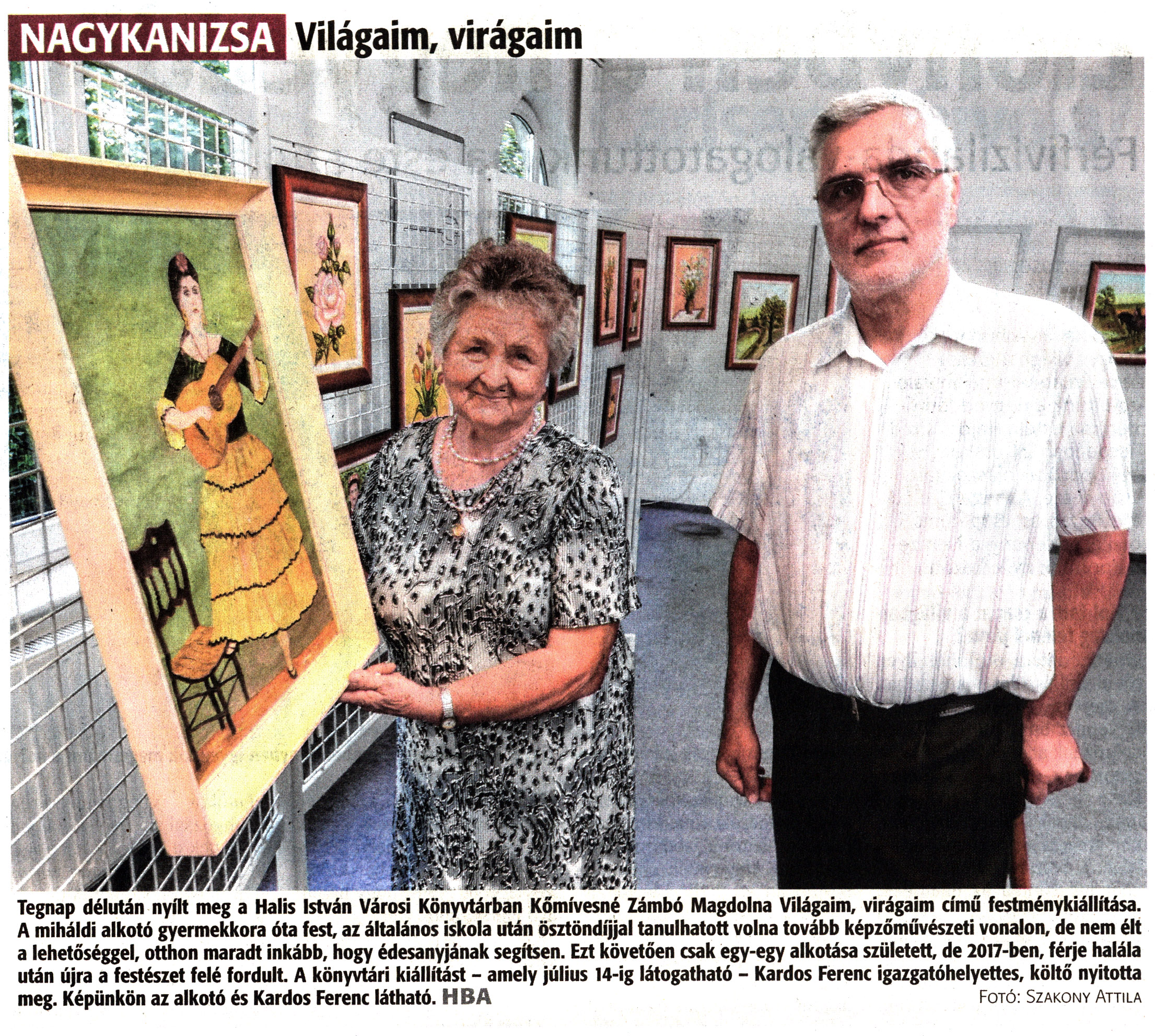Nyilvános 1568 | 1818 | Zalai Hírlap 2022. június 29. 149. szám 16. oldal | NAGYKANIZSA Világaim, virágaim Tegnap délután nyílt meg a Halis István Városi Könyvtárban Kőmívesné Zámbó Magdolna Világaim, virágaim című festménykiállítása. A miháldi alkotó gyermekkora óta fest, az általános iskola után ösztöndíjjal tanulhatott volna tovább képzőművészeti vonalon, de nem élt a lehetőséggel, otthon maradt inkább, hogy édesanyjának segítsen. Ezt követően csak egy-egy alkotása született, de 2017-ben, férje halála után újra a festészet felé fordult. A könyvtári kiállítást - amely július 14-ig látogatható - Kardos Ferenc igazgatóhelyettes, költő nyitotta meg. Képünkön az alkotó és Kardos Ferenc látható. HBA Fotó: Szakony Attila |