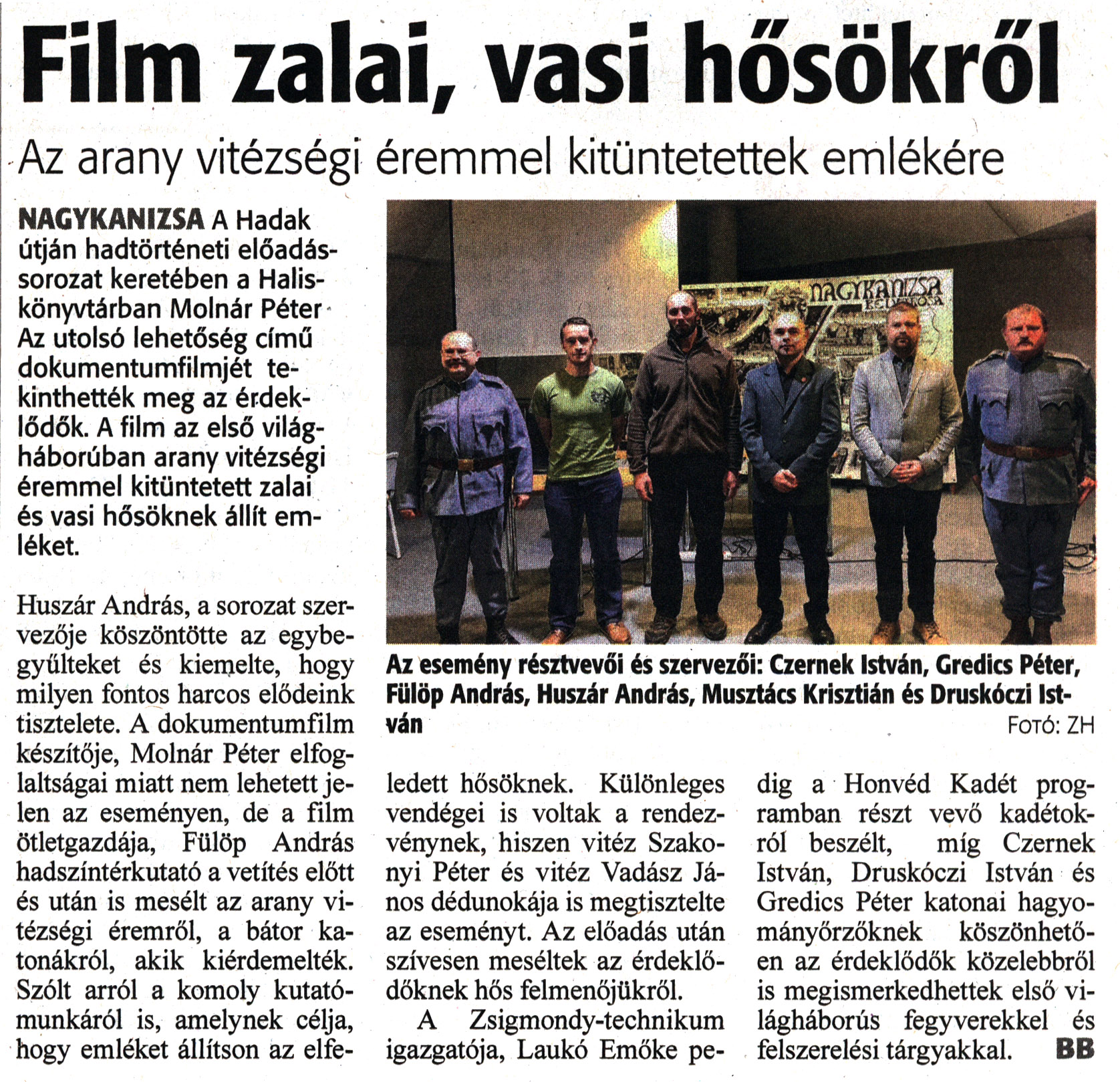 Nyilvános 1504 | 3738 | Zalai Hírlap 2022. december 14. 291. szám 5. oldal | Film zalai, vasi hősökről Az arany vitézségi éremmel kitüntetettek emlékére NAGYKANIZSA A Hadak útján hadtörténeti előadássorozat keretében a Halis-könyvtárban Molnár Péter Az utolsó lehetőség című dokumentumfilmjét tekinthették meg az érdeklődők. A film az első világháborúban arany vitézségi éremmel kitüntetett zalai és vasi hősöknek állít emléket. Huszár András, a sorozat szervezője köszöntötte az egybegyűlteket és kiemelte, hogy milyen fontos harcos elődeink tisztelete. A dokumentumfilm készítője, Molnár Péter elfoglaltságai miatt nem lehetett jelen az eseményen, de a film ötletgazdája, Fülöp András hadszíntérkutató a vetítés előtt és után is mesélt az arany vitézségi éremről, a bátor katonákról, akik kiérdemelték. Szólt arról a komoly kutatómunkáról is, amelynek célja, hogy emléket állítson az elfe- ledett hősöknek. Különleges vendégei is voltak a rendezvénynek, hiszen vitéz Szakonyi Péter és vitéz Vadász János dédunokája is megtisztelte az eseményt. Az előadás után szívesen meséltek az érdeklődőknek hős felmenőjükről. A Zsigmondy-technikum igazgatója, Laukó Emőke pedig a Honvéd Kadét programban részt vevő kadétokról beszélt, míg Czernek István, Druskóczi István és Gredics Péter katonai hagyományőrzőknek köszönhetően az érdeklődők közelebbről is megismerkedhettek első világháborús fegyverekkel és felszerelési tárgyakkal. BB Az esemény résztvevői és szervezői: Czernek István, Gredics Péter, Fülöp András, Huszár András, Musztács Krisztián és Druskóczi István Fotó: ZH |