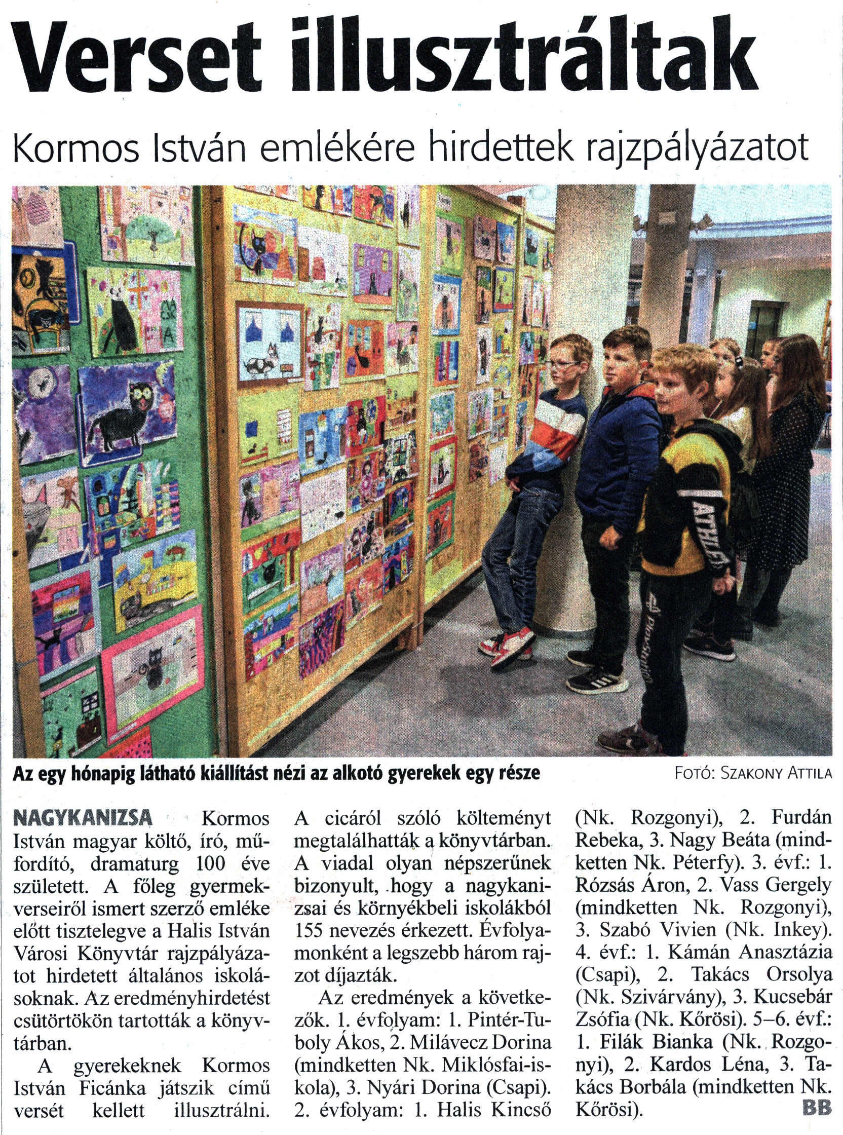Nyilvános 924 | 1266 | Zalai Hírlap 2023. május 19. 115. szám 16. oldal | Verset illusztráltak Kormos István emlékére hirdettek rajzpályázatot NAGYKANIZSA Kormos István magyar költő, író, műfordító, dramaturg 100 éve született. A főleg gyermekverseiről ismert szerző emléke előtt tisztelegve a Halis István Városi Könyvtár rajzpályázatot hirdetett általános iskolásoknak. Az eredményhirdetést csütörtökön tartották a könyvtárban. A gyerekeknek Kormos István Ficánka játszik című versét kellett illusztrálni. A cicáról szóló költeményt megtalálhatták a könyvtárban. A viadal olyan népszerűnek bizonyult, hogy a nagykanizsai és környékbeli iskolákból 155 nevezés érkezett. Évfolyamonként a legszebb három rajzot díjazták. Az eredmények a következők. 1. évfolyam: 1. Pintér-Tuboly Ákos, 2. Milávecz Dorina (mindketten Nk. Miklósfai-iskola), 3. Nyári Dorina (Csapi). 2. évfolyam: 1. Halis Kincső (Nk. Rozgonyi), 2. Furdán Rebeka, 3. Nagy Beáta (mindketten Nk. Péterfy). 3. évf.: 1. Rózsás Áron, 2. Vass Gergely (mindketten Nk. Rozgonyi), 3. Szabó Vivien (Nk. Inkey). 4. évf.: 1. Kámán Anasztázia (Csapi), 2. Takács Orsolya (Nk. Szivárvány), 3. Kucsebár Zsófia (Nk. Körösi). 5-6. évf.: 1. Filák Bianka (Nk. Rozgonyi), 2. Kardos Léna, 3. Takács Borbála (mindketten Nk. Körösi). BB Az egy hónapig látható kiállítást nézi az alkotó gyerekek egy része Fotó: Szakony Attila |