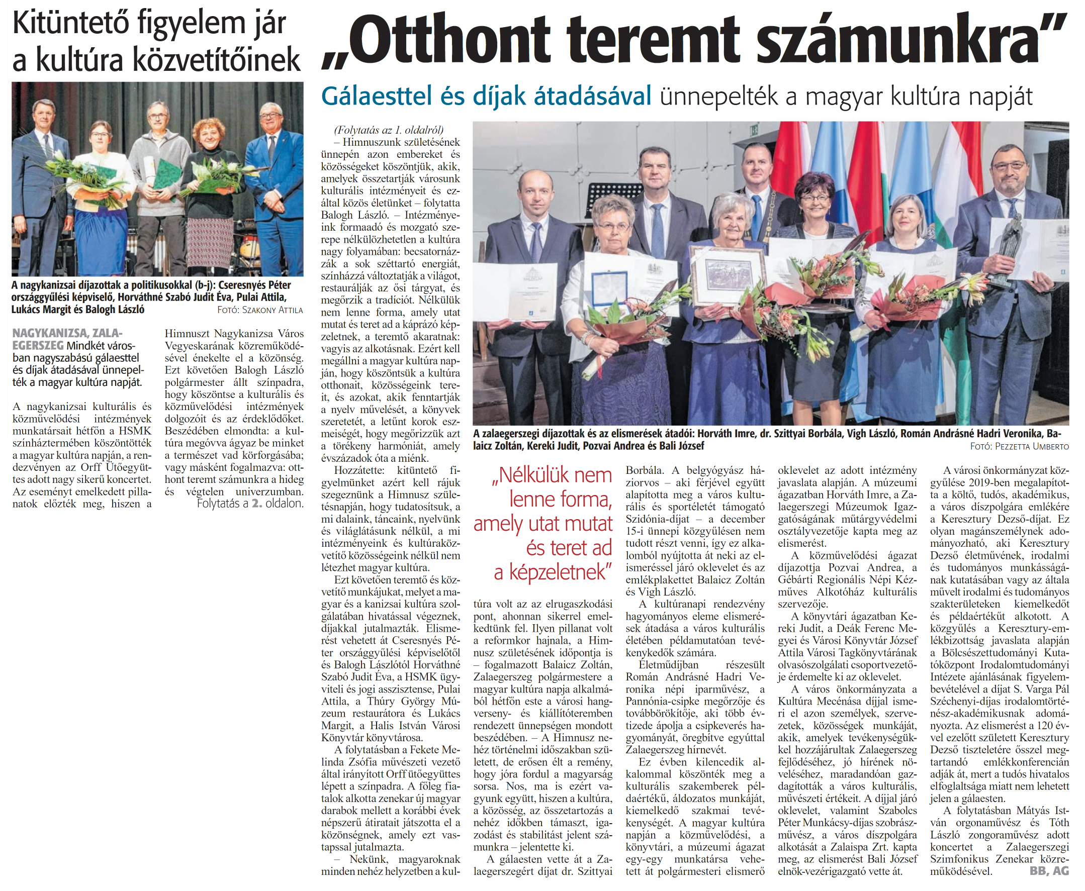 Nyilvános 1108 | 2013 | Zalai Hírlap 2024. január 24. 20. szám 1-2. oldal | Kitüntető figyelem jár a kultúra közvetítőinek A nagykanizsai díjazottak a politikusokkal (b-j): Cseresnyés Péter országgyűlési képviselő, Horváthné Szabó Judit Éva, Pulai Attila, Lukács Margit és Balogh László Fotó: Szakony Attila NAGYKANIZSA, ZALAEGERSZEG Mindkét városban nagyszabású gálaesttel és díjak átadásával ünnepelték a magyar kultúra napját. A nagykanizsai kulturális és közművelődési intézmények munkatársait hétfőn a HSMK színháztermében köszöntötték a magyar kultúra napján, a rendezvényen az Orff Ütőegyüttes adott nagy sikerű koncertet. Az eseményt emelkedett pillanatok előzték meg, hiszen a Himnuszt Nagykanizsa Város Vegyeskarának közreműködésével énekelte el a közönség. Ezt követően Balogh László polgármester állt színpadra, hogy köszöntse a kulturális és közművelődési intézmények dolgozóit és az érdeklődőket. Beszédében elmondta: a kultúra megóvva ágyaz be minket a természet vad körforgásába; vagy másként fogalmazva: otthont teremt számunkra a hideg és végtelen univerzumban. Folytatás a 2. oldalon. „Otthont teremt számunkra" Gálaesttel és díjak átadásával ünnepelték a magyar kultúra napját A zalaegerszegi díjazottak és az elismerések átadói: Horváth Imre, dr. Szittyái Borbála, Vigh László, Román Andrásné Hadri Veronika, Balaicz Zoltán, Kereki Judit, Pozvai Andrea és Bali József Fotó: Pezzetta Umberto (Folytatás az 1. oldalról) - Himnuszunk születésének ünnepén azon embereket és közösségeket köszöntjük, akik, amelyek összetartják városunk kulturális intézményeit és ezáltal közös életünket - folytatta Balogh László. - Intézményeink formaadó és mozgató szerepe nélkülözhetetlen a kultúra nagy folyamában: becsatornázzák a sok széttartó energiát, színházzá változtatják a világot, restaurálják az ősi tárgyat, és megőrzik a tradíciót. Nélkülük nem lenne forma, amely utat mutat és teret ad a káprázó képzeletnek, a teremtő akaratnak: vagyis az alkotásnak. Ezért kell megállni a magyar kultúra napján, hogy köszöntsük a kultúra otthonait, közösségeink tereit, és azokat, akik fenntartják a nyelv művelését, a könyvek szeretetét, a letűnt korok eszmeiségét, hogy megőrizzük azt a törékeny harmóniát, amely évszázadok óta a miénk. Hozzátette: kitüntető figyelmünket azért kell rájuk szegeznünk a Himnusz születésnapján, hogy tudatosítsuk, a mi dalaink, táncaink, nyelvünk és világlátásunk nélkül, a mi intézményeink és kultúraközvetítő közösségeink nélkül nem létezhet magyar kultúra. Ezt követően teremtő és közvetítő munkájukat, melyet a magyar és a kanizsai kultúra szolgálatában hivatással végeznek, díjakkal jutalmazták. Elismerést vehetett át Cseresnyés Péter országgyűlési képviselőtől és Balogh Lászlótól Horváthné Szabó Judit Éva, a HSMK ügyviteli és jogi asszisztense, Pulai Attila, a Thúry György Múzeum restaurátora és Lukács Margit, a Malis István Városi Könyvtár könyvtárosa. A folytatásban a Fekete Melinda Zsófia művészeti vezető által irányított Orff ütőegyüttes lépett a színpadra. A főleg fiatalok alkotta zenekar új magyar darabok mellett a korábbi évek népszerű átiratait játszotta el a közönségnek, amely ezt vastapssal jutalmazta. - Nekünk, magyaroknak minden nehéz helyzetben a kultúra volt az az elrugaszkodási pont, ahonnan sikerrel emelkedtünk fel. Ilyen pillanat volt a reformkor hajnala, a Himnusz születésének időpontja is - fogalmazott Balaicz Zoltán, Zalaegerszeg polgármestere a magyar kultúra napja alkalmából hétfőn este a városi hangverseny- és kiállítóteremben rendezett ünnepségen mondott beszédében. - A Himnusz nehéz történelmi időszakban született, de erősen élt a remény, hogy jóra fordul a magyarság sorsa. Nos, ma is ezért vagyunk együtt, hiszen a kultúra, a közösség, az összetartozás a nehéz időkben támaszt, igazodást és stabilitást jelent számunkra -jelentette ki. A gálaesten vette át a Zalaegerszegért díjat dr. Szittyai Borbála. A belgyógyász háziorvos - aki férjével együtt alapította meg a város kulturális és sportéletét támogató Szidónia-díjat - a december 15-i ünnepi közgyűlésen nem tudott részt venni, így ez alkalomból nyújtotta át neki az elismeréssel járó oklevelet és az emlékplakettet Balaicz Zoltán és Vigh László. A kultúranapi rendezvény hagyományos eleme elismerések átadása a város kulturális életében példamutatóan tevékenykedők számára. Életműdíjban részesült Román Andrásné Hadri Veronika népi iparművész, a Pannónia-csipke megőrzője és továbbörökítője, aki több évtizede ápolja a csipkeverés hagyományát, öregbítve egyúttal Zalaegerszeg hírnevét. Ez évben kilencedik alkalommal köszönték meg a kulturális szakemberek példaértékű, áldozatos munkáját, kiemelkedő szakmai tevékenységét. A magyar kultúra napján a közművelődési, a könyvtári, a múzeumi ágazat egy-egy munkatársa vehetett át polgármesteri elismerő oklevelet az adott intézmény javaslata alapján. A múzeumi ágazatban Horváth Imre, a Zalaegerszegi Múzeumok Igazgatóságának műtárgyvédelmi osztályvezetője kapta meg az elismerést. A közművelődési ágazat díjazottja Pozvai Andrea, a Gébárti Regionális Népi Kézműves Alkotóház kulturális szervezője. A könyvtári ágazatban Kereki Judit, a Deák Ferenc Megyei és Városi Könyvtár József Attila Városi Tagkönyvtárának olvasószolgálati csoportvezetője érdemelte ki az oklevelet. A város önkormányzata a Kultúra Mecénása díjjal ismeri el azon személyek, szervezetek, közösségek munkáját, akik, amelyek tevékenységükkel hozzájárultak Zala
