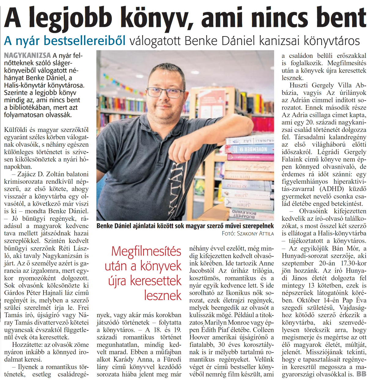 Nyilvános 963 | 1302 | Zalai Hírlap 2024. szeptember 9. 210. szám 2. oldal | A legjobb könyv, ami nincs bent NAGYKANIZSA A nyár felnőtteknek szóló slágerkönyveiből válogatott néhányat Benke Dániel, a Halis-könyvtár könyvtárosa. Szerinte a legjobb könyv mindig az, ami nincs bent a bibliotékában, mert azt folyamatosan olvassák. Külföldi és magyar szerzőktől egyaránt széles körben válogatnak olvasóik, s néhány egészen különleges történetet is szívesen kikölcsönöztek a nyári hónapokban. - Zajácz D. Zoltán balatoni krimisorozata rendkívül népszerű, az első kötete, ahogy visszaér a könyvtárba egy olvasótól, a következő már viszi is ki - mondta Benke Dániel. - Jó bűnügyi regények, ráadásul a magyarok kedvenc tava mellett játszódnak hazai szereplőkkel. Szintén kedvelt bűnügyi szerzőnk Réti László, aki tavaly Nagykanizsán is járt. Az ő személye azért is garancia az izgalomra, mert egykor nyomozóként dolgozott. Sok olvasónk kölcsönözte ki Gárdos Péter Hajnali láz című regényét is, melyben a szerző szülei szerelmét írja le. Frei Tamás író, újságíró vagy Náray Tamás divattervező kötetei ugyancsak évszaktól függetlenül évek óta keresettek. Hozzátette: az olvasók zöme nyáron inkább a könnyed irodalmat keresi. - Ilyenek a romantikus történetek, esetleg családregények, vagy akár más korokban játszódó történetek - folytatta a könyvtáros. - A 18. és 19. századi romantikus történet megunhatatlan, mindig kedvelt marad. Ebben a műfajban alkot Karády Anna, a Füredi lány című könyvvel kezdődő sorozata hiába jelent meg már néhány évvel ezelőtt, még mindig kifejezetten kedvelt olvasóink körében. Ide tartozik Anne Jacobstól Az úriház trilógia, kosztümös, romantikus és a nyár egyik kedvence lett. S ide sorolható az Ikonikus nők sorozat, ezek életrajzi regények, melyek beengedik az olvasót a kulisszák mögé. Például a titokzatos Marilyn Monroe vagy éppen Edith Piaf életébe. Colleen Hoover amerikai újságírónő a fiatalabb, 30 éves korosztálynak is ír mélyebb tartalmú romantikus regényeket. Velünk véget ér című bestseller könyvéből nemrég film készült, ami a családon belüli erőszakkal is foglalkozik. Megfilmesítés után a könyvek újra keresettek lesznek. Huszti Gergely Villa Abbázia, vagyis Az úrilányok az Adrián címmel indított sorozatot. Ennek második része Az Adria csillaga címet kapta, ami egy 20. századi nagykanizsai család történetét dolgozza fel. Társadalmi kalandregény az első világháború előtti időszakról. Légrádi Gergely Falaink című könyve nem éppen könnyed olvasnivaló, de érdemes rá időt szánni: egy figyelemhiányos hiperaktivitás-zavarral (ADHD) küzdő gyermeket nevelő csonka család életébe enged betekintést. - Olvasóink kifejezetten kedvelik az író-olvasó találkozókat, s most ősszel két szerző is ellátogat a Halis-könyvtárba - tájékoztatott a könyvtáros. - Az egyikőjük Bán Mór, a Hunyadi-sorozat szerzője, aki szeptember 20-án 17.30-kor jön hozzánk. Az író Hunyadi János életét dolgozta fel mintegy 13 kötetben, ezek is népszerűek látogatóink körében. Október 14-én Pap Éva szegedi születésű, Vajdasághoz kötődő szerző érkezik a könyvtárba, aki szenvedélyesen törekszik arra, hogy megismerje és megértse az ott élő magyarok életét, múltját, jelenét. Missziójának tekinti, hogy e tapasztalásait regényein keresztül megossza a magyarországi olvasókkal is. BB A nyár bestsellereiből válogatott Benke Dániel kanizsai könyvtáros Benke Dániel ajánlatai között sok magyar szerző művei szerepelnek Fotó: Szakony Attila |