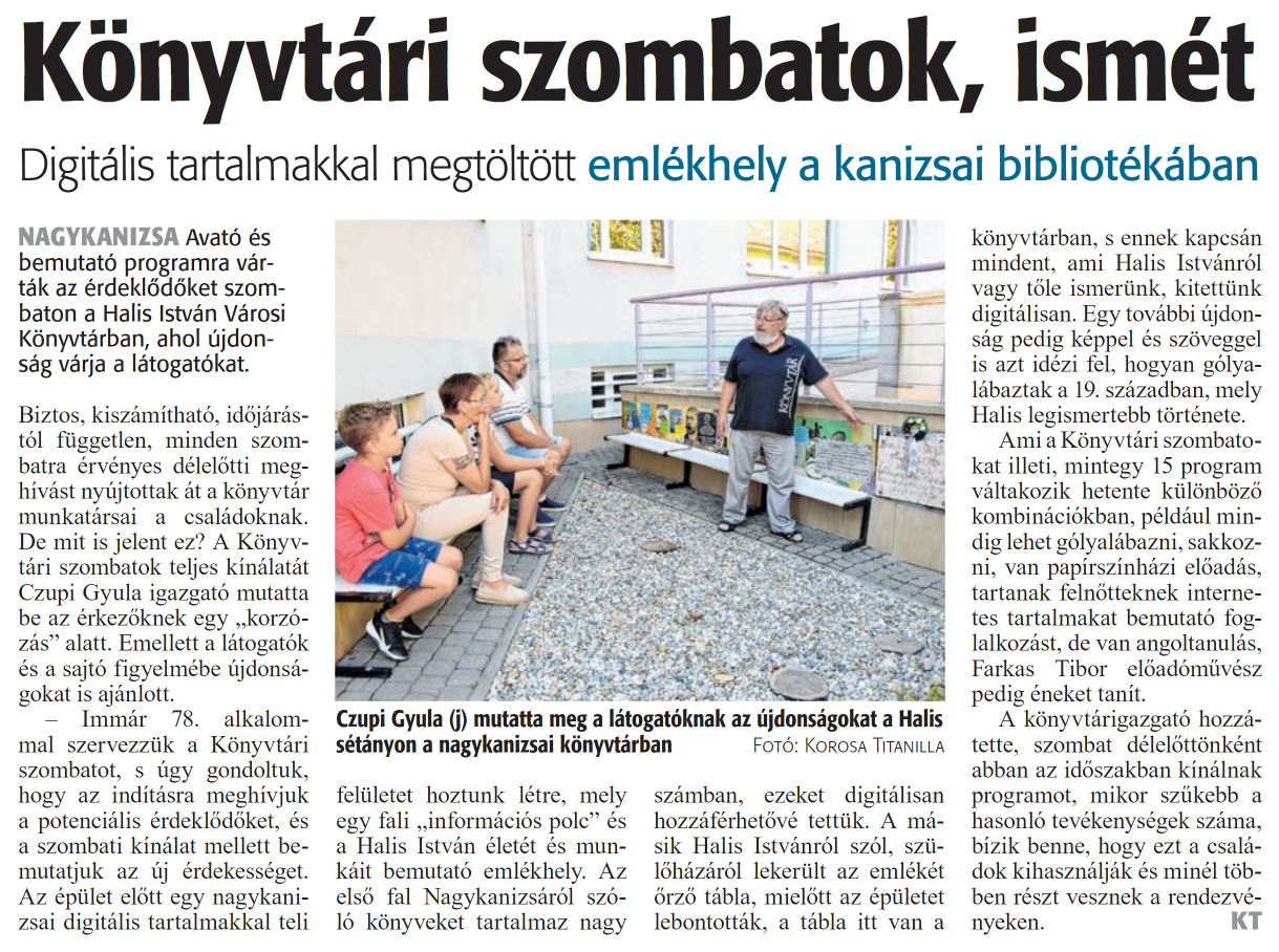 Nyilvános 978 | 1251 | Zalai Hírlap 2024. szeptember 9. 210. szám 4. oldal | Könyvtári szombatok, ismét Digitális tartalmakkal megtöltött emlékhely a kanizsai bibliotékában NAGYKANIZSA Avató és bemutató programra várták az érdeklődőket szombaton a Halis István Városi Könyvtárban, ahol újdonság várja a látogatókat. Biztos, kiszámítható, időjárástól független, minden szombatra érvényes délelőtti meghívást nyújtottak át a könyvtár munkatársai a családoknak. De mit is jelent ez? A Könyvtári szombatok teljes kínálatát Czupi Gyula igazgató mutatta be az érkezőknek egy „korzózás" alatt. Emellett a látogatók és a sajtó figyelmébe újdonságokat is ajánlott. - Immár 78. alkalommal szervezzük a Könyvtári szombatot, s úgy gondoltuk, hogy az indításra meghívjuk a potenciális érdeklődőket, és a szombati kínálat mellett bemutatjuk az új érdekességet. Az épület előtt egy nagykanizsai digitális tartalmakkal teli felületet hoztunk létre, mely egy fali „információs polc" és a Halis István életét és munkáit bemutató emlékhely. Az első fal Nagykanizsáról szóló könyveket tartalmaz nagy számban, ezeket digitálisan hozzáférhetővé tettük. A másik Halis Istvánról szól, szülőházáról lekerült az emlékét őrző tábla, mielőtt az épületet lebontották, a tábla itt van a könyvtárban, s ennek kapcsán mindent, ami Halis Istvánról vagy tőle ismerünk, kitettünk digitálisan. Egy további újdonság pedig képpel és szöveggel is azt idézi fel, hogyan gólyalábaztak a 19. században, mely Halis legismertebb története. Ami a Könyvtári szombatokat illeti, mintegy 15 program váltakozik hetente különböző kombinációkban, például mindig lehet gólyalábazni, sakkozni, van papírszínházi előadás, tartanak felnőtteknek internetes tartalmakat bemutató foglalkozást, de van angoltanulás, Farkas Tibor előadóművész pedig éneket tanít. A könyvtárigazgató hozzátette, szombat délelőttönként abban az időszakban kínálnak programot, mikor szűkebb a hasonló tevékenységek száma, bízik benne, hogy ezt a családok kihasználják és minél többen részt vesznek a rendezvényeken. KT Czupi Gyula (j) mutatta meg a látogatóknak az újdonságokat a Halis sétányon a nagykanizsai könyvtárban Fotó: Korosa Titanilla |