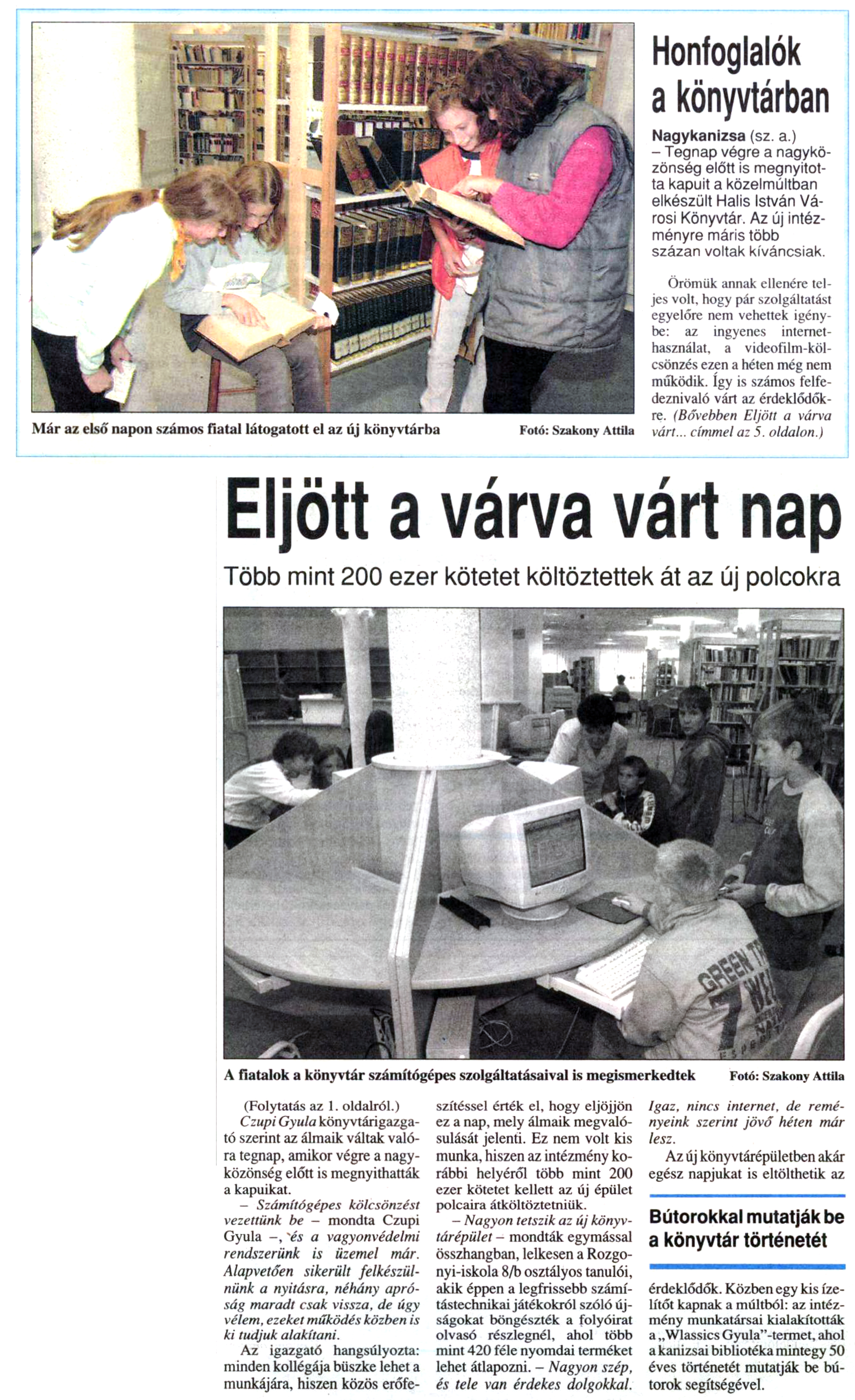 Nyilvános 1347 | 1484 | Zalai Hírlap 2001. október 2. 230. szám 1, 5. oldal | Már az első napon számos fiatal látogatott el az új könyvtárba Fotó: Szakony Attila Honfoglalók a könyvtárban Nagykanizsa (sz. a.) - Tegnap végre a nagyközönség előtt is megnyitotta kapuit a közelmúltban elkészült Halis István Városi Könyvtár. Az új intézményre máris több százan voltak kíváncsiak. Örömük annak ellenére teljes volt, hogy pár szolgáltatást egyelőre nem vehettek igénybe: az ingyenes internethasználat, a videofilm-kölcsönzés ezen a héten még nem működik. így is számos felfe-deznivaló várt az érdeklődőkre. (Bővebben Eljött a várva várt... címmel az 5. oldalon.) Eljött a várva várt nap Több mint 200 ezer kötetet költöztettek át az új polcokra A fiatalok a könyvtár számítógépes szolgáltatásaival is megismerkedtek Fotó: Szakony Attila (Folytatás az 1. oldalról.) Czupi Gyula könyvtárigazgató szerint az álmaik váltak valóra tegnap, amikor végre a nagyközönség előtt is megnyithatták a kapuikat. - Számítógépes kölcsönzést vezettünk be - mondta Czupi Gyula -, és a vagyonvédelmi rendszerünk is üzemel már. Alapvetően sikerült felkészülnünk a nyitásra, néhány apróság maradt csak vissza, de úgy vélem, ezeket működés közben is ki tudjuk alakítani. Az igazgató hangsúlyozta: minden kollégája büszke lehet a munkájára, hiszen közös erőfeszítéssel érték el, hogy eljöjjön ez a nap, mely álmaik megvalósulását jelenti. Ez nem volt kis munka, hiszen az intézmény korábbi helyéről több mint 200 ezer kötetet kellett az új épület polcaira átköltöztetniük. — Nagyon tetszik az új könyvtárépület - mondták egymással összhangban, lelkesen a Rozgonyi-iskola 8/b osztályos tanulói, akik éppen a legfrissebb számítástechnikai játékokról szóló újságokat böngészték a folyóirat olvasó részlegnél, ahol több mint 420 féle nyomdai terméket lehet átlapozni. - Nagyon szép, és tele van érdekes dolgokkal. Igaz, nincs internet, de reményeink szerint jövő héten már lesz. Az új könyvtárépületben akár egész napjukat is eltölthetik az érdeklődők. Közben egy kis ízelítőt kapnak a múltból: az intézmény munkatársai kialakították a „Wlassics Gyula"-termet, ahol a kanizsai bibliotéka mintegy 50 éves történetét mutatják be bútorok segítségével. |