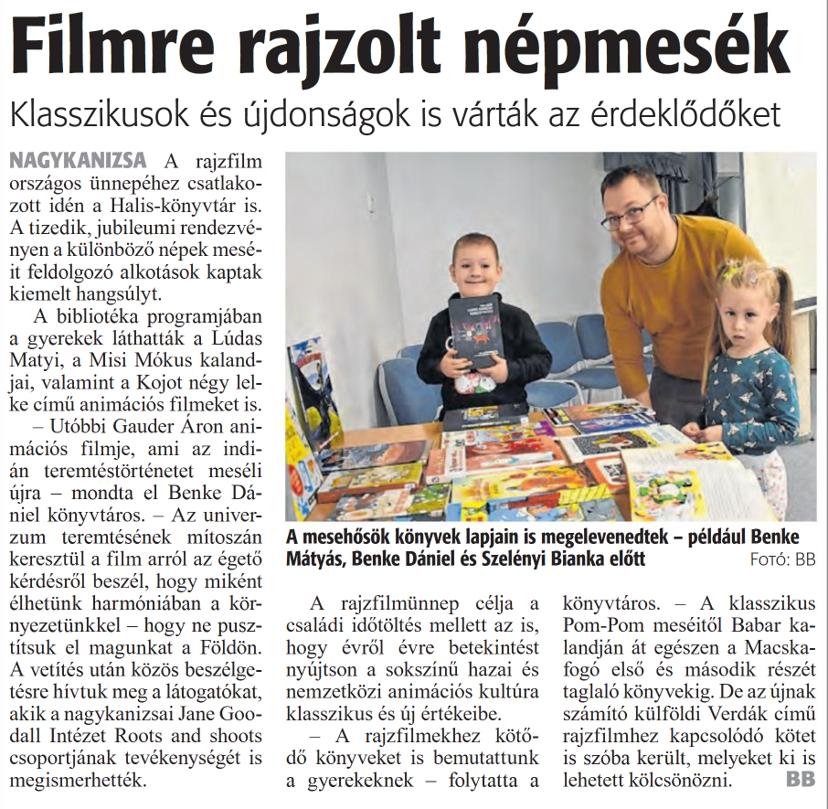 Nyilvános 930 | 1160 | Zalai Hírlap 2024. november 18. 268. szám 16. oldal | Filmre rajzolt népmesék Klasszikusok és újdonságok is várták az érdeklődőket NAGYKANIZSA A rajzfilm országos ünnepéhez csatlakozott idén a Halis-könyvtár is. A tizedik, jubileumi rendezvényen a különböző népek meséit feldolgozó alkotások kaptak kiemelt hangsúlyt. A bibliotéka programjában a gyerekek láthatták a Lúdas Matyi, a Misi Mókus kalandjai, valamint a Kojot négy lelke című animációs filmeket is. - Utóbbi Gauder Áron animációs filmje, ami az indián teremtéstörténetet meséli újra - mondta el Benke Dániel könyvtáros. - Az univerzum teremtésének mítoszán keresztül a film arról az égető kérdésről beszél, hogy miként élhetünk harmóniában a környezetünkkel - hogy ne pusztítsuk el magunkat a Földön. A vetítés után közös beszélgetésre hívtuk meg a látogatókat, akik a nagykanizsai Jane Goo-dall Intézet Roots and shoots csoportjának tevékenységét is megismerhették. A rajzfilmünnep célja a családi időtöltés mellett az is, hogy évről évre betekintést nyújtson a sokszínű hazai és nemzetközi animációs kultúra klasszikus és új értékeibe. - A rajzfilmekhez kötődő könyveket is bemutattunk a gyerekeknek - folytatta a könyvtáros. - A klasszikus Pom-Pom meséitől Babar kalandján át egészen a Macskafogó első és második részét taglaló könyvekig. De az újnak számító külföldi Verdák című rajzfilmhez kapcsolódó kötet is szóba került, melyeket ki is lehetett kölcsönözni. BB A mesehősök könyvek lapjain is megelevenedtek - például Benke Mátyás, Benke Dániel és Szelényi Bianka előtt Fotó: BB |