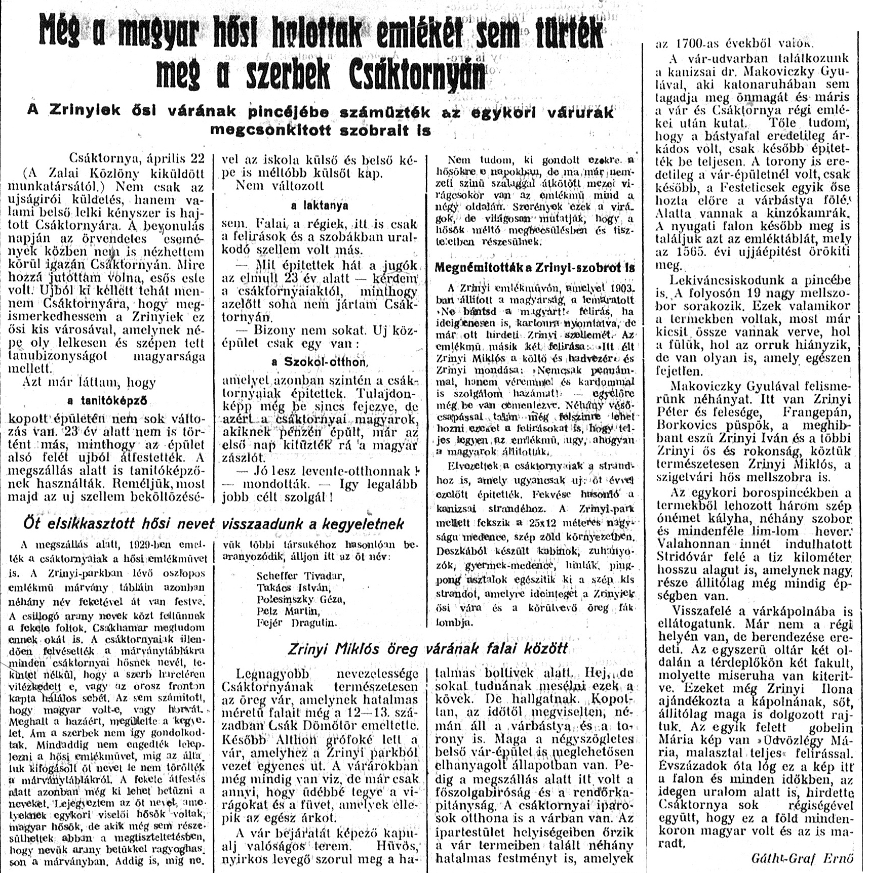 Nyilvános 1194 | 2387 | Zalai Közlöny 1941. április 22. 91. szám 1-2. oldal - Még a magyar hősi halottak... | Még a magyar hősi halottak emlékét sem tűrték meg a szerbek Csáktornyán A Zrínyiek ősi várának pincéjébe száműzték az egykori várurak megcsonkított szobrait is Csáktornya, április 22. (A Zalai Közlöny kiküldött munkatársától.) Nem csak az újságírói küldetés, hanem valami belső lelki kényszer is hajtott Csáktornyára. A bevonulás napján az örvendetes események közben nem is nézhettem körül igazán Csáktornyán. Mire hozzá jutottam volna, esős este volt. Újból ki kellett tehát mennem Csáktornyára, hogy megismerkedhessem a Zrínyiek ez ősi kis városával, amelynek népe oly lelkesen és szépen tett tanúbizonyságot magyarsága mellett. Azt már láttam, hogy a tanítóképző kopott épületén nem sok változás van. 23 év alatt nem is történt más, minthogy az épület alsó felét újból átfestették. A megszállás alatt is tanítóképzőnek használták. Reméljük, most majd az új szellem beköltözésével az iskola külső és belső képe is méltóbb külsői kap. Nem változott a laktanya sem. Falai a régiek, itt is csak a felírások és a szobákban uralkodó szellem volt más. – Mit építettek hát a jugók az elmúlt 23 év alatt – kérdem a csáktornyaiaktól, minthogy azelőtt soha nem jártam Csáktornyán. – Bizony nem sokat. Új középület csak egy van: a Szokol-otthon, amelyet azonban szintén a csáktornyaiak építettek. Tulajdonképp még be sincs fejezve, de azért a csáktornyai magyarok, akiknek pénzén épült, már az első nap kitűzték rá a magyar zászlót. – Jó lesz levente-otthonnak! – mondották. – Így legalább jobb célt szolgál! Öt elsikkasztott hősi nevet visszaadunk a kegyeletnek A megszállás alatt, 1929-ben emelték a csáktornyaiak a hősi emlékművet is. A Zrínyi-parkban lévő oszlopos emlékmű márvány tábláin azonban néhány név feketével át van festve. A csillogó arany nevek közt feltűnnek a fekete foltok. Csakhamar megtudom ennek okát is. A csáktornyaiak illendően felvésették a márványtáblákra minden csáktornyai hősnek nevét, tekintet nélkül, hogy a szerb harctéren vitézkedett-e, vagy az orosz fronton kapta halálos sebét. Az sem számított, hogy magyar volt-e, vagy horvát. Meghalt a hazáért, megillette a kegyelet. Ám a szerbek nem így gondolkodtak. Mindaddig nem engedték leleplezni a hősi emlékművet, míg az általuk kifogásolt öt nevet le nem törölték a márványtáblákról. A fekete átfestés alatt azonban még ki lehet betűzni a neveket. Lejegyeztem az öt nevet, amelyeknek egykori viselői hősök voltak, magyar hősök, de akik még sem részesülhettek abban a megtiszteltetésben, hogy nevük arany betűkkel ragyoghasson a márványban. Addig is, míg nevük többi társukéhoz hasonlóan bearanyozódik, álljon itt az öt név: Scheffer Tivadar, Takács István, Polesinszky Géza, Petz Martin, Fejér Dragutin. Nem tudom, ki gondolt ezekre a hősökre e napokban, de ma már nemzeti színű szalaggal átkötött mezei virágcsokor van az emlékmű mind a négy oldalán. Szerények ezek a virágok, de világosan mutatják, hogy a hősök méltó megbecsülésben és tiszteletben részesülnek. Megnémították a Zrínyi-szobrot is A Zrínyi emlékművön, amelyet 1903-ban állított a magyarság, a lemaratott „Ne bántsd a magyart!” felírás, ha ideiglenesen is, kartonra nyomtatva, de már ott hirdeti Zrínyi szellemét. Az emlékmű másik két felírása: „Itt élt Zrínyi Miklós a költő és hadvezér” és Zrínyi mondása: „Nemcsak pennámmal, hanem véremmel és kardommal is szolgálom hazámat!” - egyelőre még be van cementezve. Néhány vésőcsapással talán még felszínre lehet hozni ezeket a felírásokat is, hogy teljes legyen az emlékmű, úgy, ahogyan a magyarok állították. Elvezettek a csáktornyaiak a strandhoz is, amely ugyancsak új: öt évvel ezelőtt építették. Fekvése hasonló a kanizsai strandéhoz. A Zrínyi-park mellett fekszik a 25x12 méteres nagyságú medence, szép zöld környezetben. Deszkából készült kabinok, zuhanyozók, gyermek-medence, hinták, pingpong asztalok egészítik ki a szép kis strandot, amelyre ideinteget a Zrínyiek ősi vára és a körülvevő öreg fák lombja. Zrínyi Miklós öreg várának falai között Legnagyobb nevezetessége Csáktornyának természetesen az öreg vár, amelynek hatalmas méretű falait még a 12—13. században Csák Dömötör emeltette. Később Althon grófoké lett a vár, amelyhez a Zrínyi parkból vezet egyenes út. A várárokban még mindig van víz, de már csak annyi, hogy üdébbé tegye a virágokat és a füvet, amelyek ellepik az egész árkot. A vár bejáratát képező kapualj valóságos terem. Hűvös, nyirkos levegő szorul meg a hatalmas boltívek alatt. Hej, de sokat tudnának mesélni ezek a kövek. De hallgatnak. Kopottan, az időtől megviselten, némán áll a várbástya és a torony is. Maga a négyszögletes belső vár-épület is, meglehetősen elhanyagolt állapotban van. Pedig a megszállás alatt itt volt a főszolgabíróság és a rendőrkapitányság. A csáktornyai iparosok otthona is a várban van. Az ipartestület helyiségeiben őrzik a vár termeiben talált néhány hatalmas festményt is, amelyek az 1700-as évekből valók. A vár-udvarban találkozunk a kanizsai dr. Makoviczky Gyulával, aki katonaruhában sem tagadja meg önmagát és máris a vár és Csáktornya régi emlékei után kutat. Tőle tudom, hogy a bástyafal eredetileg árkádos volt, csak később építették be teljesen. A torony is eredetileg a vár-épületnél volt, csak később, a Festeticsek egyik őse hozta előre a várbástya fölé. Alatta vannak a kínzókamrák. A nyugati falon később meg is találjuk azt az emléktáblát, mely az 1565. évi újjáépí