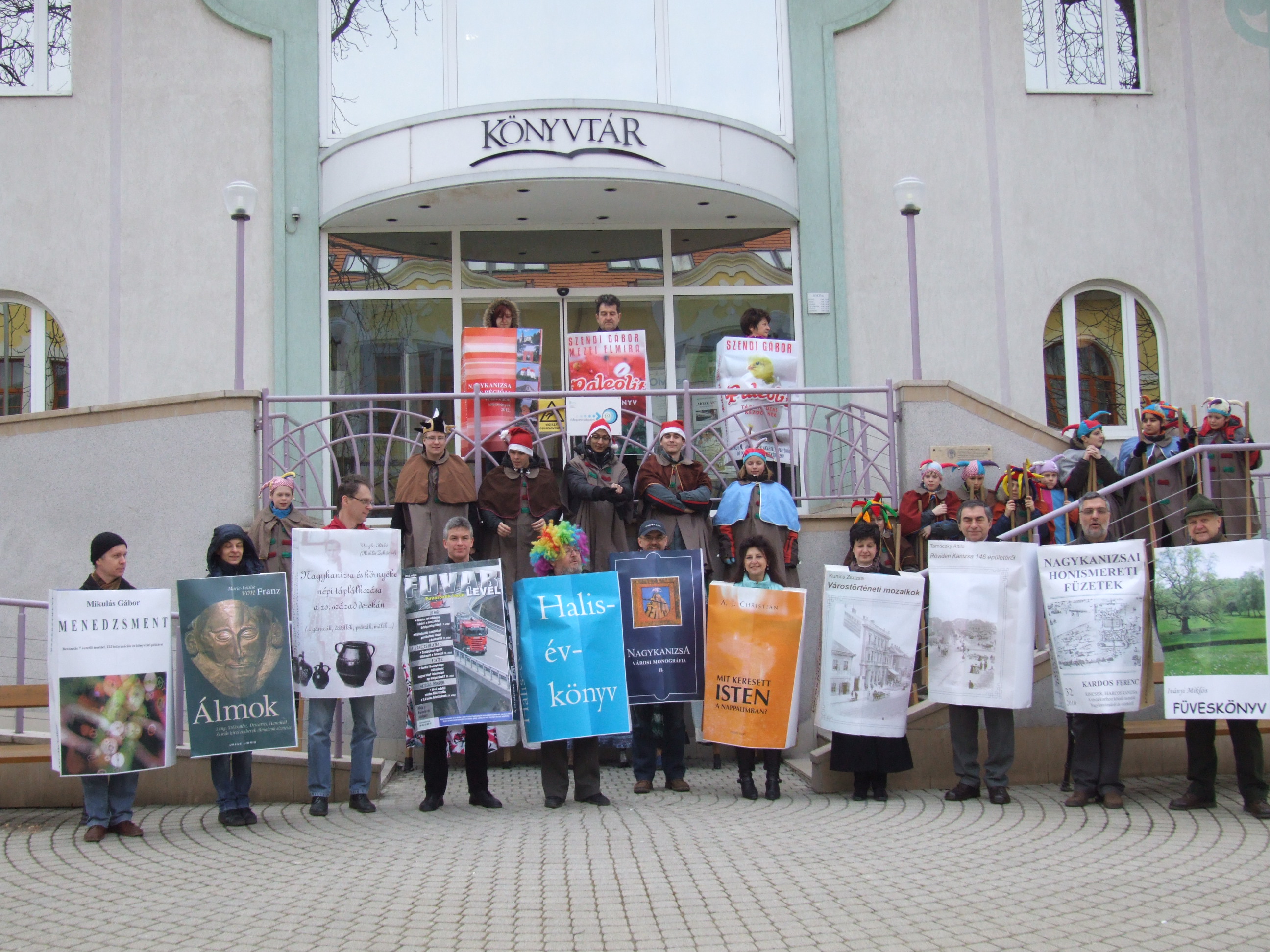 Nyilvános 1455 | 3043 | 2013. február 9. A farsangi fánkfesztiválra készülve felhívásban kértük olvasóinkat, hogy öltsék magukra kedves könyvüket. Egy „könyvespolcnyi” jelentkező vette magára kedves olvasmányát, az ő vonulásukról készültek ezek a képek. A környezetükben néhol láthatók a Nagykanizsai Gólyalábasok, akik szintén a könyvtárhoz kötődnek. A „felvonuló kötetek” a könyvtár épületében még megtekinthetők. | |
