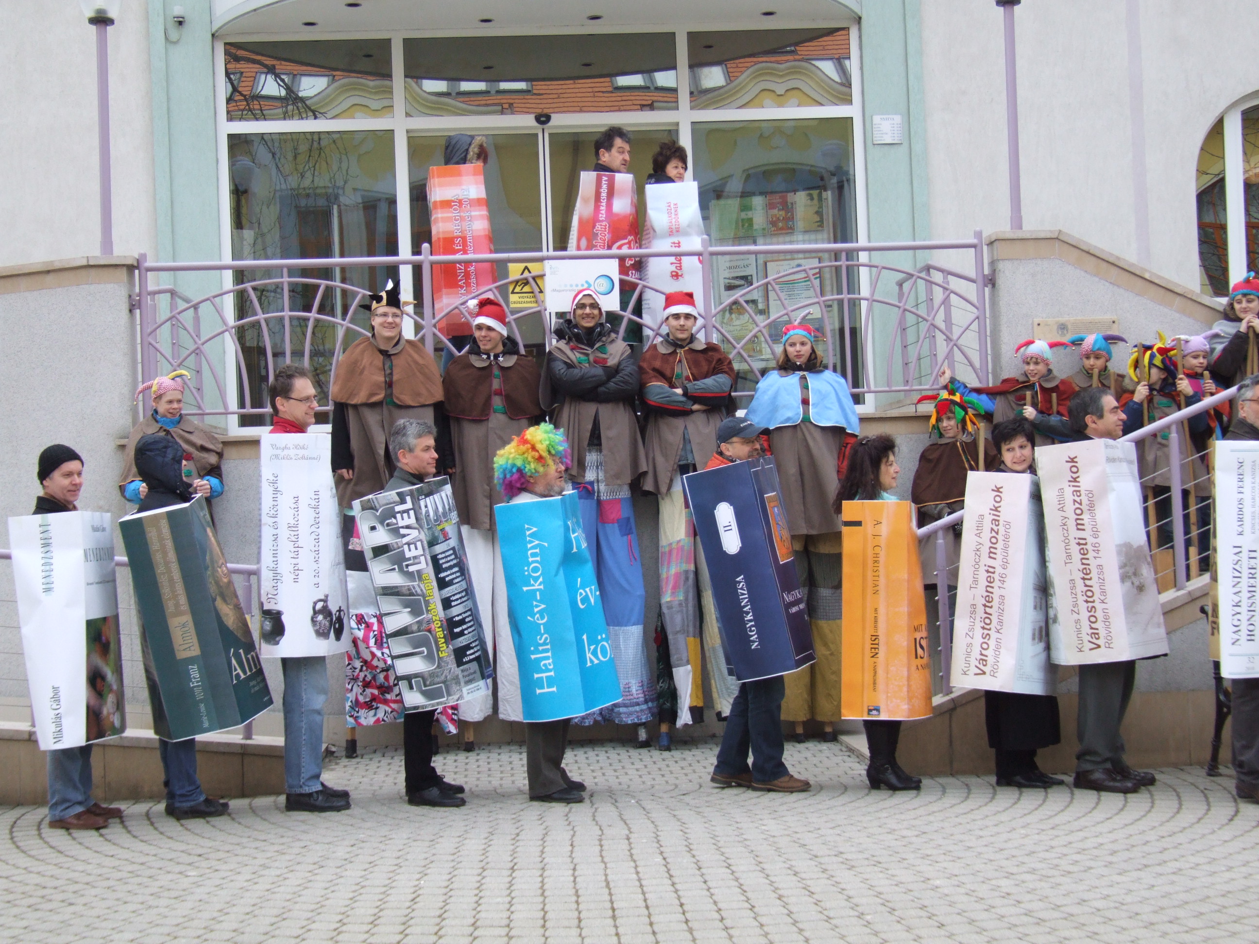 Nyilvános 1454 | 3078 | 2013. február 9. A farsangi fánkfesztiválra készülve felhívásban kértük olvasóinkat, hogy öltsék magukra kedves könyvüket. Egy „könyvespolcnyi” jelentkező vette magára kedves olvasmányát, az ő vonulásukról készültek ezek a képek. A környezetükben néhol láthatók a Nagykanizsai Gólyalábasok, akik szintén a könyvtárhoz kötődnek. A „felvonuló kötetek” a könyvtár épületében még megtekinthetők. | |