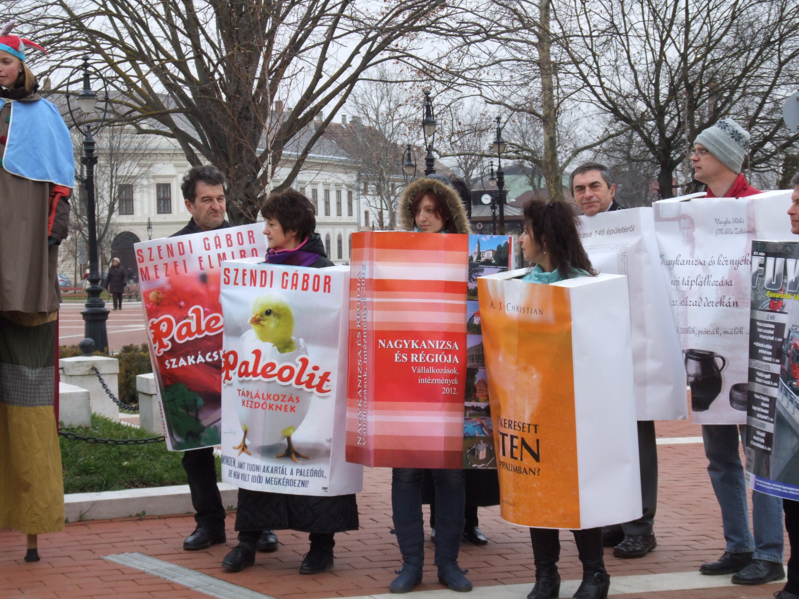 Nyilvános 1082 | 1541 | 2013. február 9. A farsangi fánkfesztiválra készülve felhívásban kértük olvasóinkat, hogy öltsék magukra kedves könyvüket. Egy „könyvespolcnyi” jelentkező vette magára kedves olvasmányát, az ő vonulásukról készültek ezek a képek. A környezetükben néhol láthatók a Nagykanizsai Gólyalábasok, akik szintén a könyvtárhoz kötődnek. A „felvonuló kötetek” a könyvtár épületében még megtekinthetők. | |