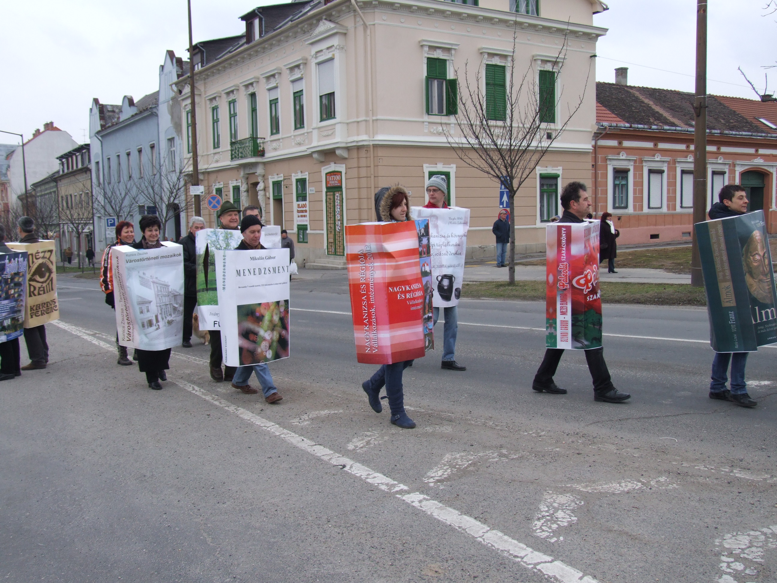 Nyilvános 1043 | 1326 | 2013. február 9. A farsangi fánkfesztiválra készülve felhívásban kértük olvasóinkat, hogy öltsék magukra kedves könyvüket. Egy „könyvespolcnyi” jelentkező vette magára kedves olvasmányát, az ő vonulásukról készültek ezek a képek. A környezetükben néhol láthatók a Nagykanizsai Gólyalábasok, akik szintén a könyvtárhoz kötődnek. A „felvonuló kötetek” a könyvtár épületében még megtekinthetők. | |