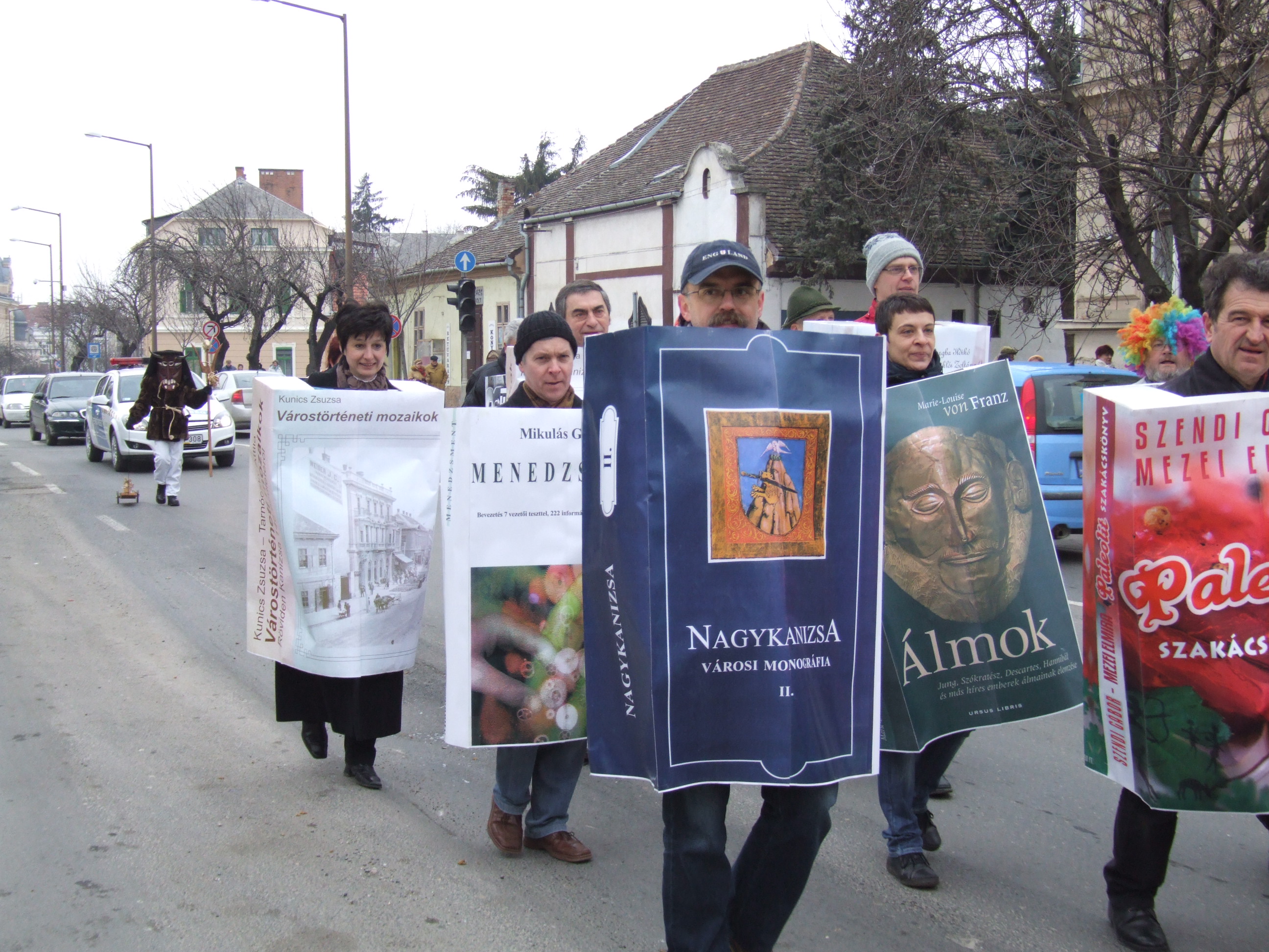 Nyilvános 1344 | 1703 | 2013. február 9. A farsangi fánkfesztiválra készülve felhívásban kértük olvasóinkat, hogy öltsék magukra kedves könyvüket. Egy „könyvespolcnyi” jelentkező vette magára kedves olvasmányát, az ő vonulásukról készültek ezek a képek. A környezetükben néhol láthatók a Nagykanizsai Gólyalábasok, akik szintén a könyvtárhoz kötődnek. A „felvonuló kötetek” a könyvtár épületében még megtekinthetők. | |