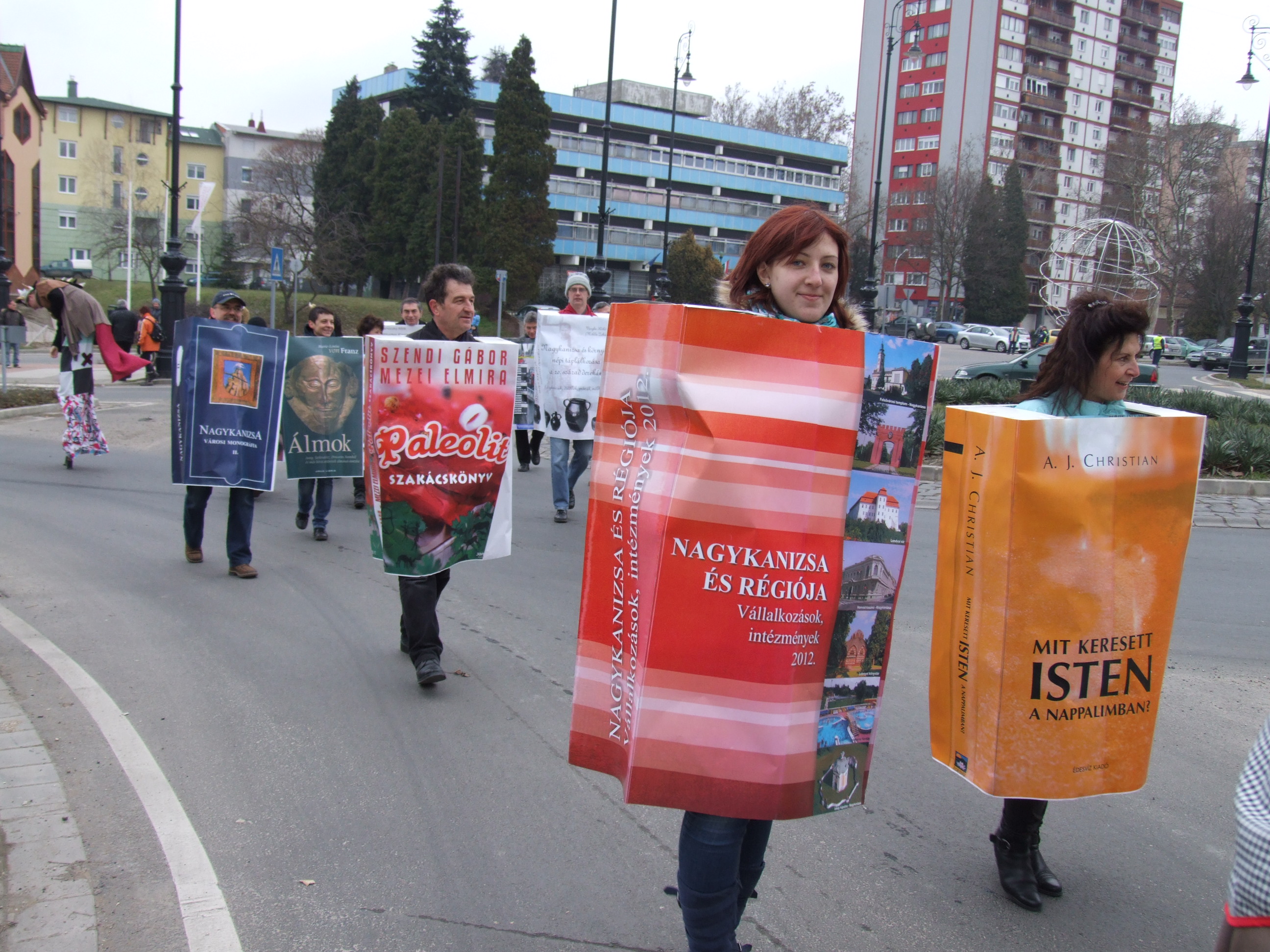 Nyilvános 1081 | 1503 | 2013. február 9. A farsangi fánkfesztiválra készülve felhívásban kértük olvasóinkat, hogy öltsék magukra kedves könyvüket. Egy „könyvespolcnyi” jelentkező vette magára kedves olvasmányát, az ő vonulásukról készültek ezek a képek. A környezetükben néhol láthatók a Nagykanizsai Gólyalábasok, akik szintén a könyvtárhoz kötődnek. A „felvonuló kötetek” a könyvtár épületében még megtekinthetők. | |
