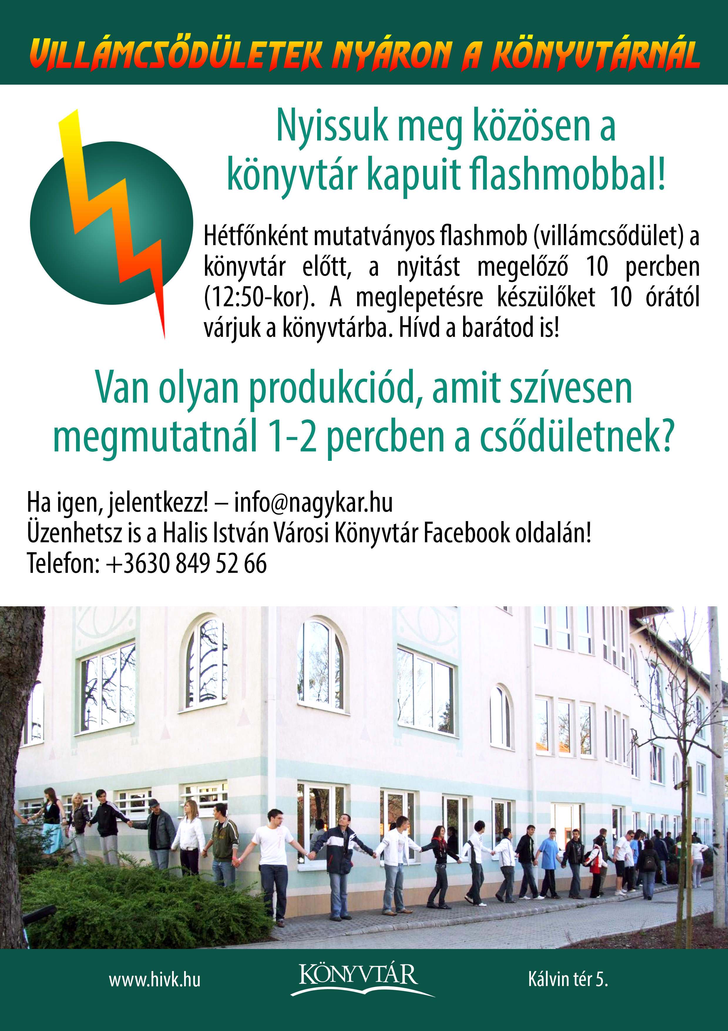 Nyilvános 1618 | 3759 | Rövid leírás | Teljes leírás (662 B) | Villámcsődületek nyáron a könyvtárnál Nyissuk meg közösen a könyvtár kapuit flashmobbal! Hétfőnként mutatványos flashmob (villámcsődület) a könyvtár előtt, a nyitást megelőző 10 percben (12:50-kor). A meglepetésre készülőket 10 órától várjuk a könyvtárba. Hívd a barátod is! Van olyan produkciód, amit szívesen megmutatnál 1-2 percben a csődületnek? Ha igen, jelentkezz! – info@nagykar.hu Üzenhetsz is a Halis István Városi Könyvtár Facebook oldalán! Telefon: +3630 849 52 66 www.hivk.hu Kálvin tér 5. |