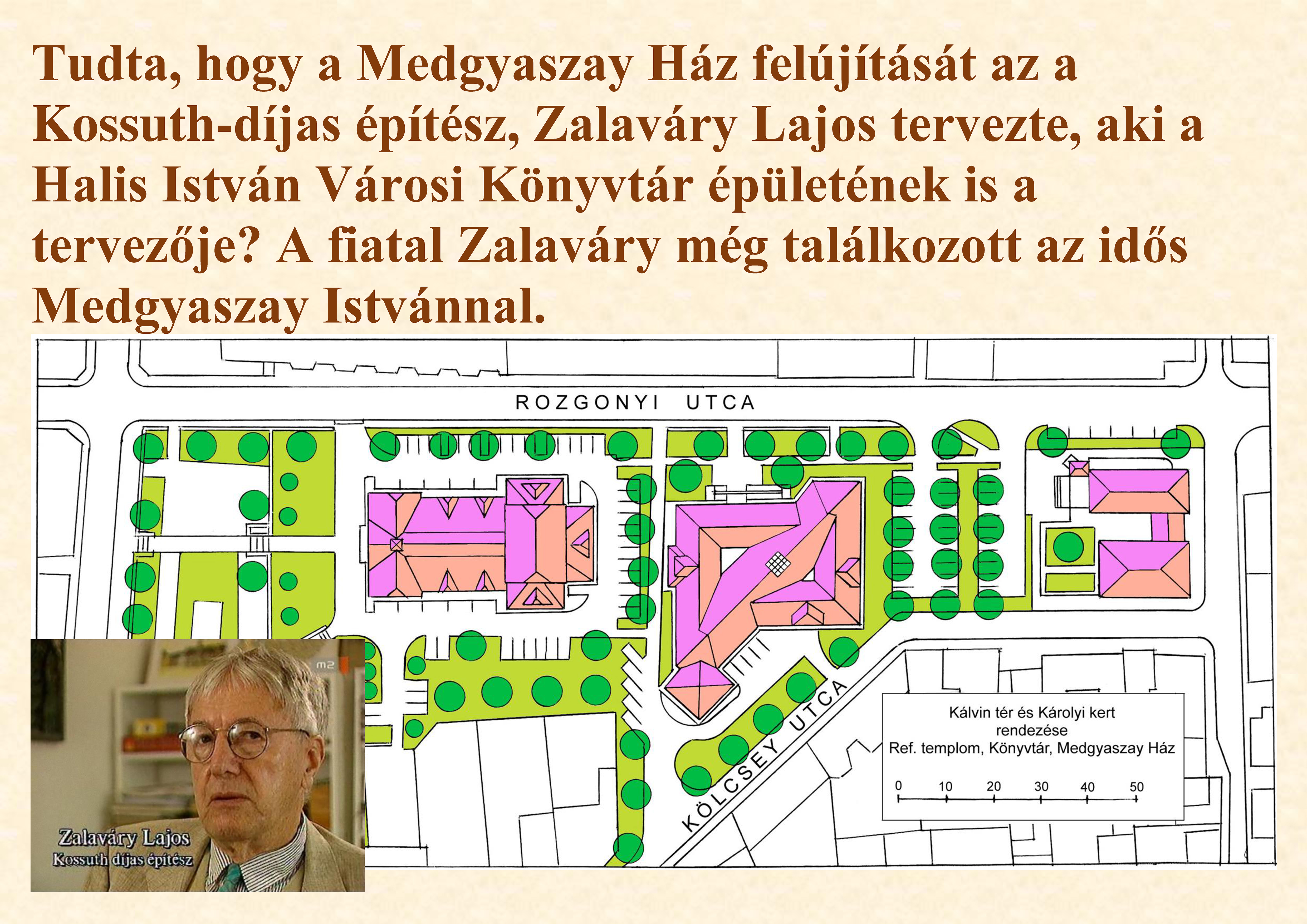 Nyilvános 1252 | 2276 | Tudta, hogy a Medgyaszay Ház felújítását az a Kossuth-díjas építész, Zalaváry Lajos tervezte, aki a Halis István Városi Könyvtár épületének is a tervezője? A fiatal Zalaváry még találkozott az idős Medgyaszay Istvánnal. | |