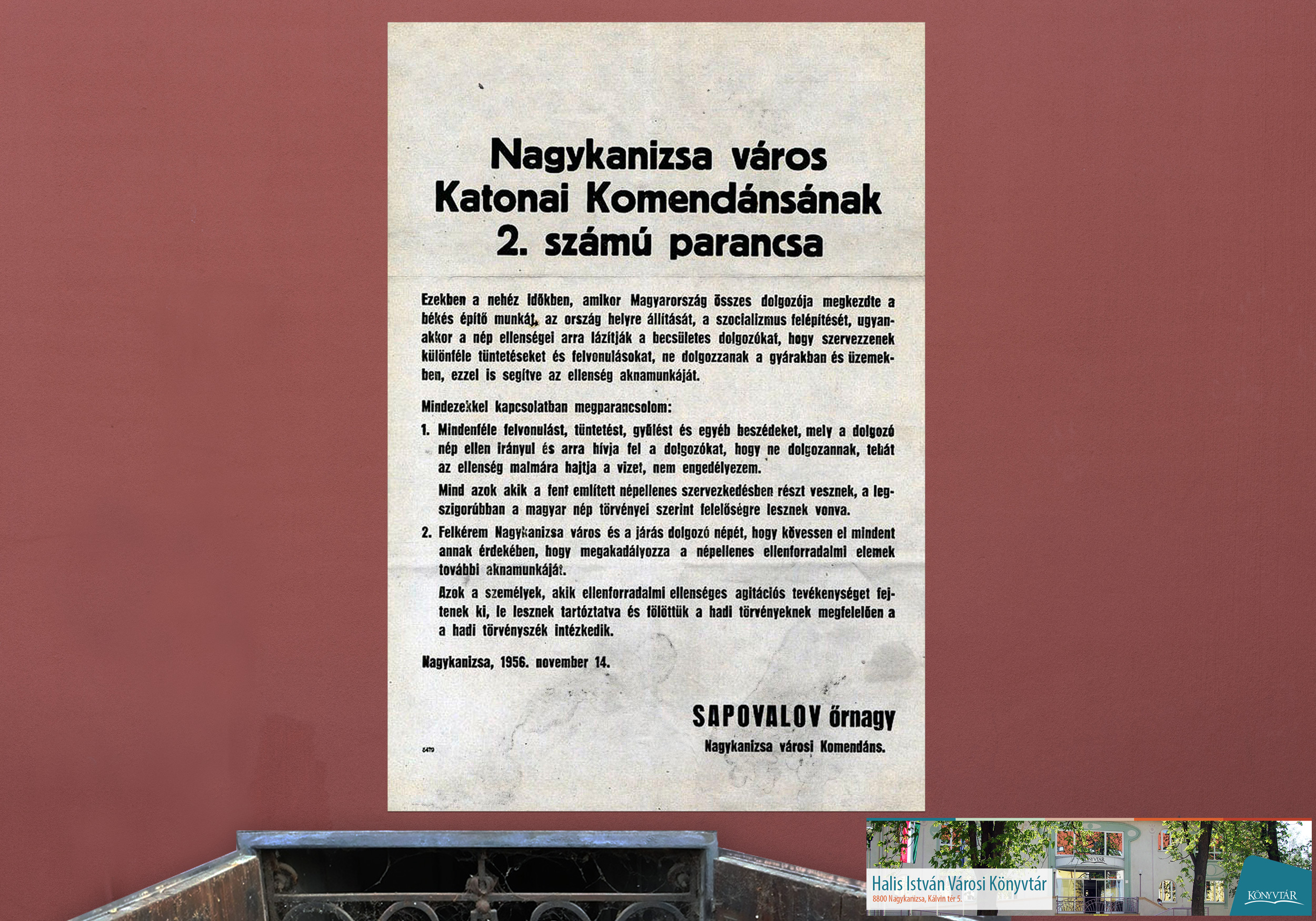 Nyilvános 1885 | 2231 | Egy kiállítás utolsó képe | Az 1956. november 14-én megjelent plakát megmutatása a zárása az október 23-a tiszteletére készült kiállításunknak. Az utolsó dokumentum már a későbbi időszakból ismert ellenségképet rajzolja fel. Tíz nappal a forradalom leverése után hadi állapotnak megfelelő eljárással fenyeget a megszálló hadsereg képviselője. Itt köszönünk el a korabeli történésektől és ezekkel a gondolatokkal a könyvtári emlékező kiállítástól. |