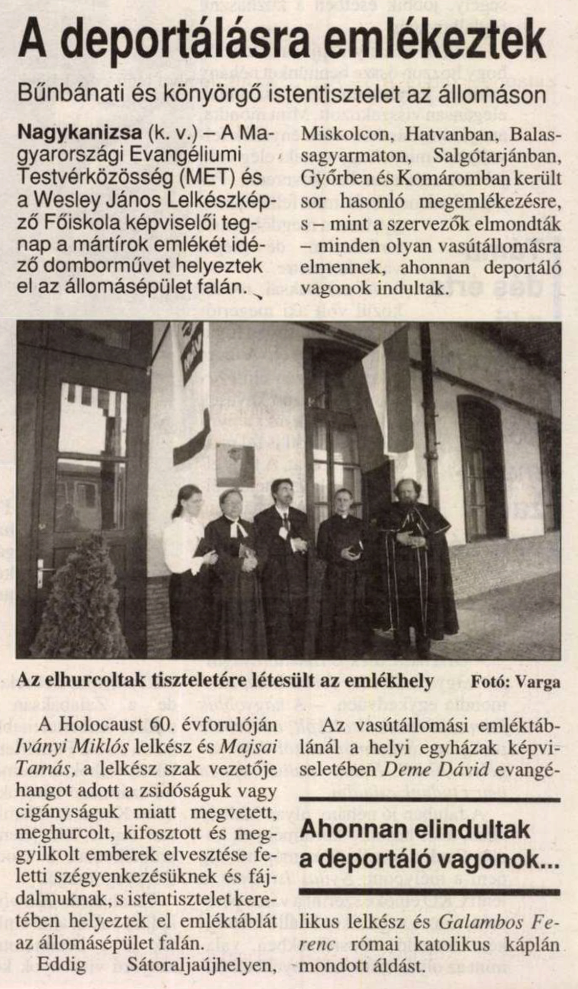 Nyilvános 1384 | 1789 | Zalai Hírlap 2004. június 19. 5. oldal | A deportálásra emlékeztek Bűnbánati és könyörgő istentisztelet az állomáson Nagykanizsa (k. v.) - A Magyarországi Evangéliumi Testvérközösség (MET) és a Wesley János Lelkészképző Főiskola képviselői tegnap a mártírok emlékét idéző domborművet helyeztek el az állomásépület falán. A Holocaust 60. évforulóján Iványi Miklós lelkész és Majsai Tamás, a lelkész szak vezetője hangot adott a zsidóságuk vagy cigányságuk miatt megvetett, meghurcolt, kifosztott és meggyilkolt emberek elvesztése feletti szégyenkezésüknek és fájdalmuknak, s istentisztelet keretében helyeztek el emléktáblát az állomásépület falán. Eddig Sátoraljaújhelyen, Miskolcon, Hatvanban, Balassagyarmaton, Salgótarjánban, Győrben és Komáromban került sor hasonló megemlékezésre, s - mint a szervezők elmondták - minden olyan vasútállomásra elmennek, ahonnan deportáló vagonok indultak. Az vasútállomási emléktáblánál a helyi egyházak képviseletében Deme Dávid evangélikus lelkész és Galambos Ferenc római katolikus káplán mondott áldást. Az elhurcoltak tiszteletére létesült az emlékhely Fotó: Varga |